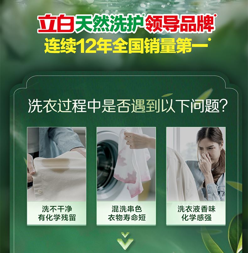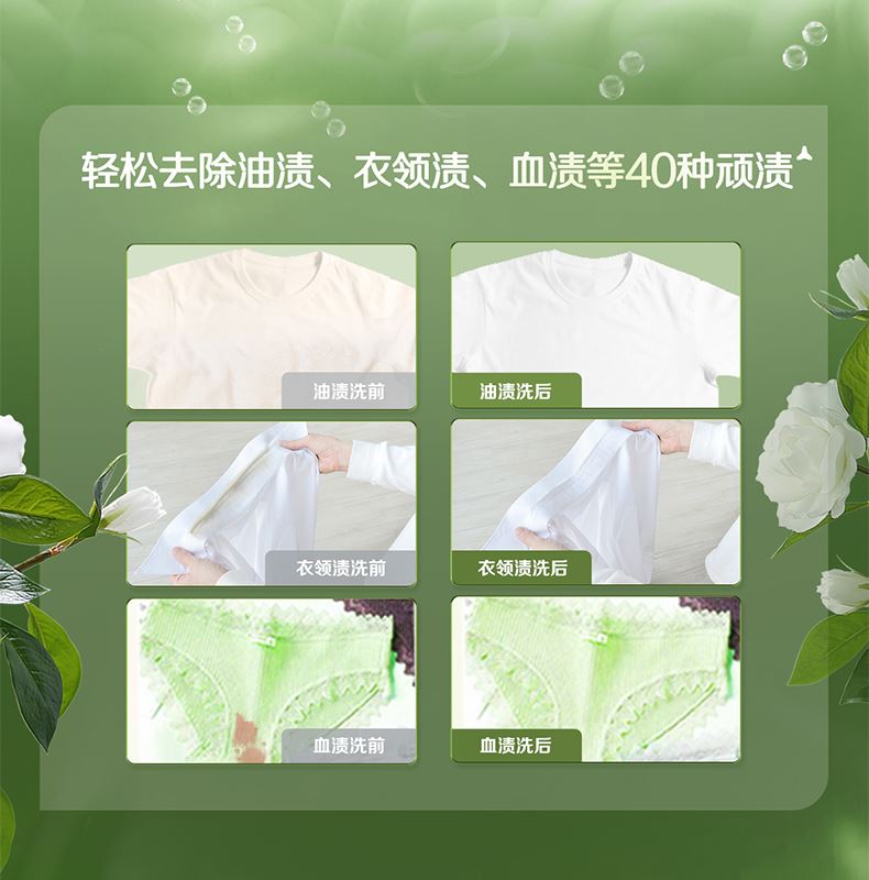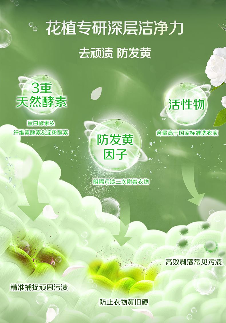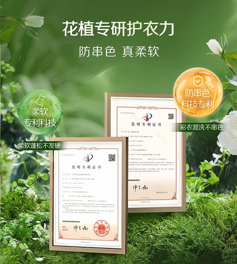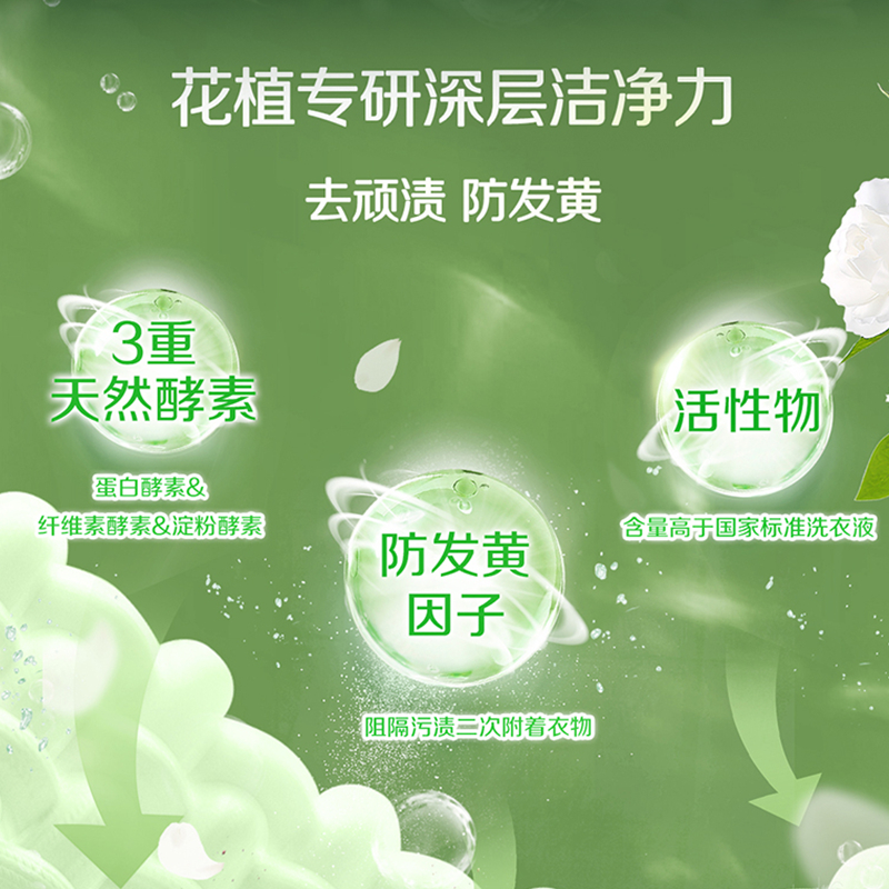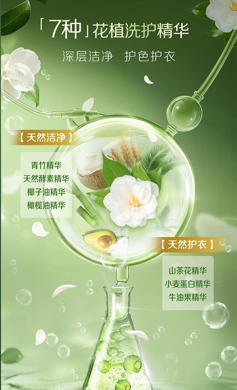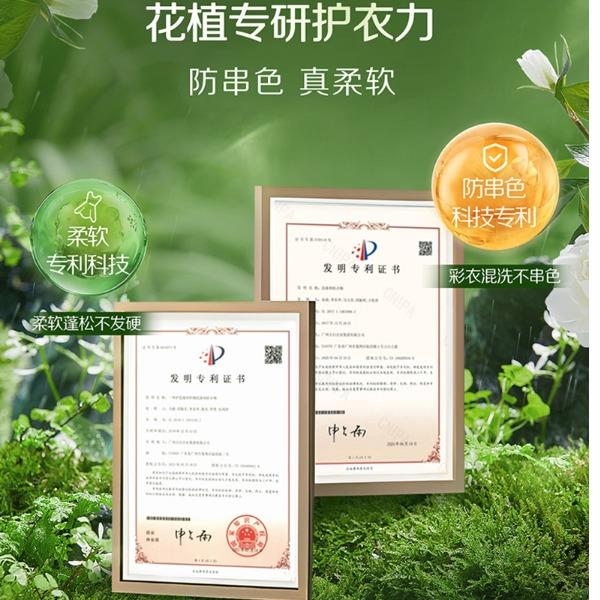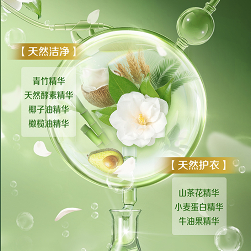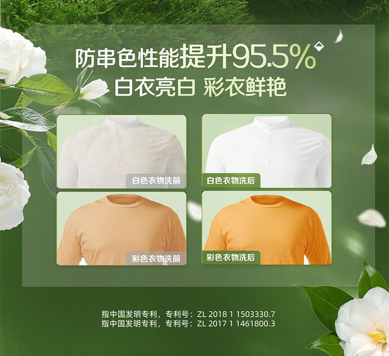 產(chǎn)品成分:表面活性劑、防串色劑、抗再沉積劑、著色劑、香精、防腐劑、柔軟因子、天然來源成分(天然椰子油精華、棕櫚油精華、天然酵素、烷基糖苷APG、山茶花精粹、牛油果提取物、檸檬香茅提取物)