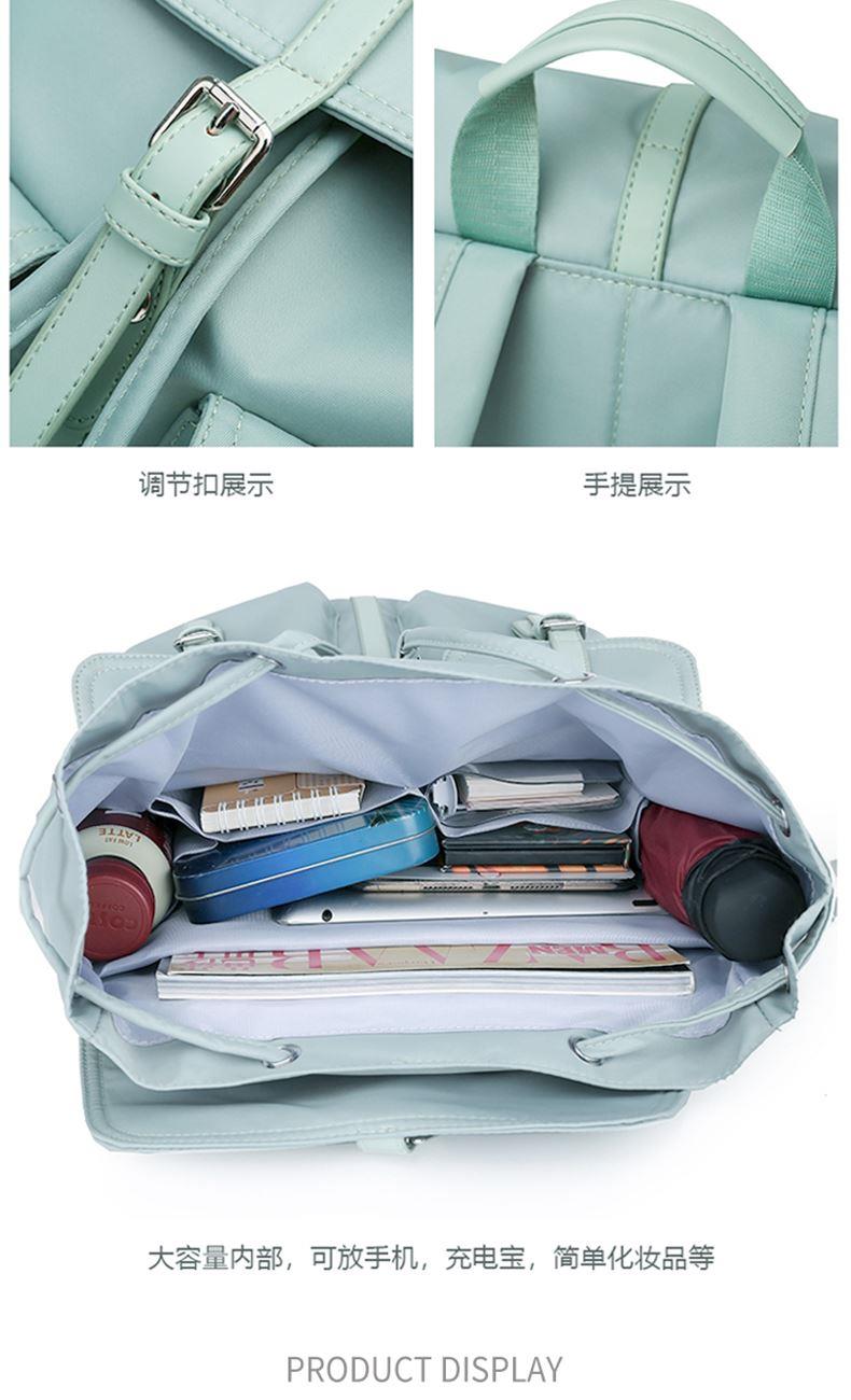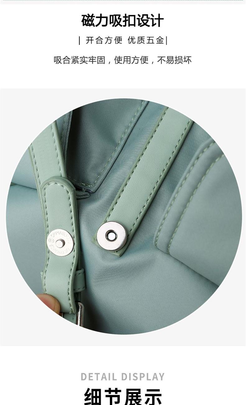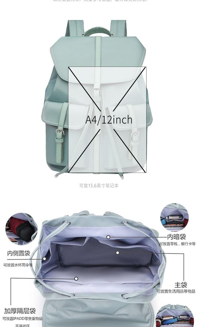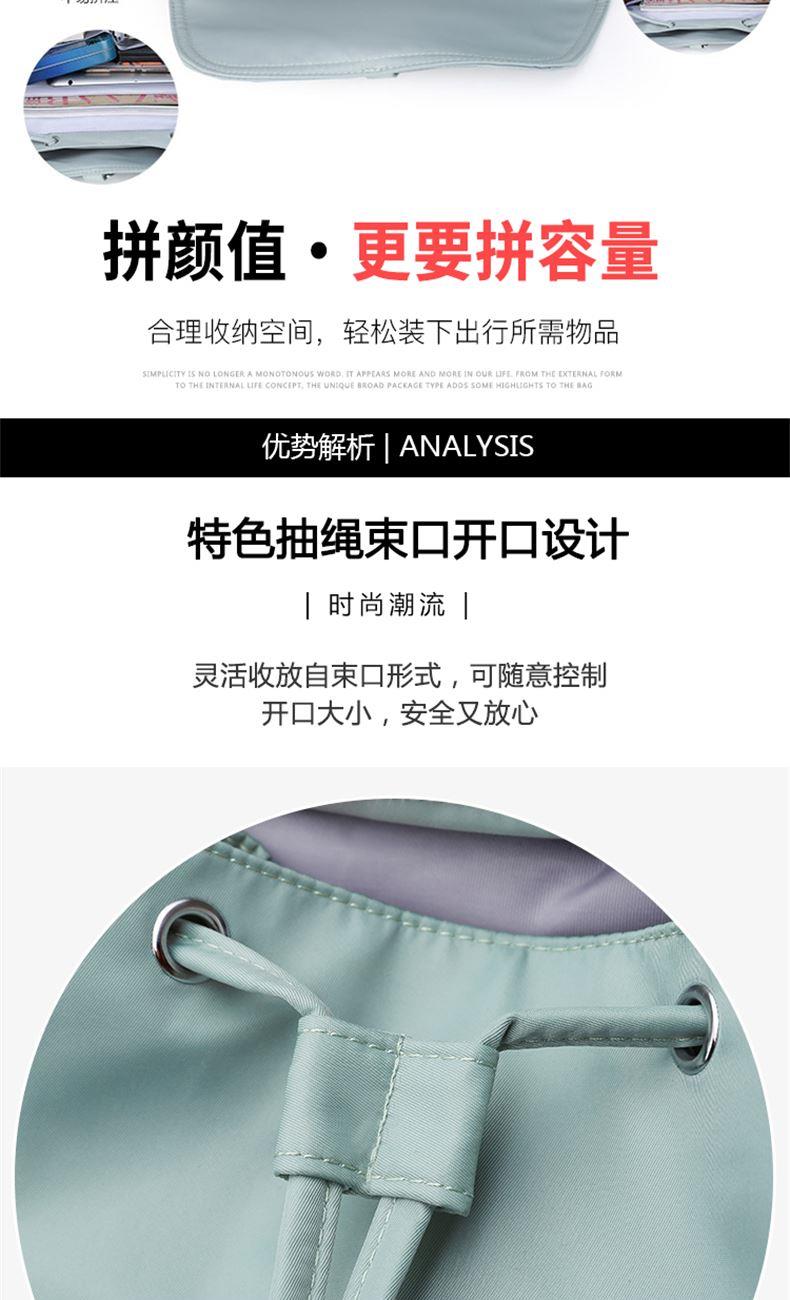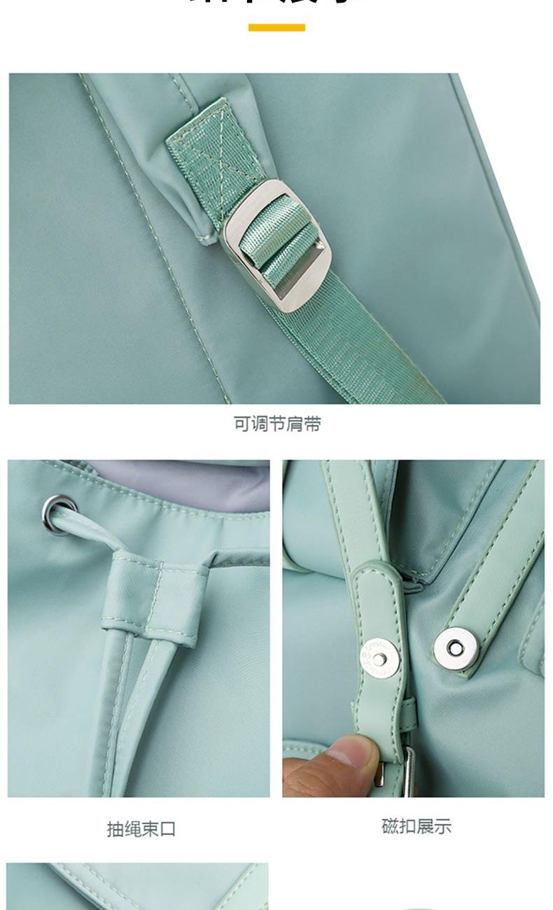 靈活收放,可隨意控制開(kāi)口大小,安全又放心; 超輕透氣,色澤自然柔和手感舒適,易打理; 吸合緊實(shí) ,使用方便,不易損壞; 型號(hào): FF-Y005A 面料材質(zhì):290斜紋記憶復(fù)合尼龍+PU 里布材質(zhì):210D滌綸 尺寸: 37*29*14CM 顏色:薄荷綠 結(jié)構(gòu):主袋,內(nèi)暗袋,內(nèi)置側(cè)袋,加厚隔層袋