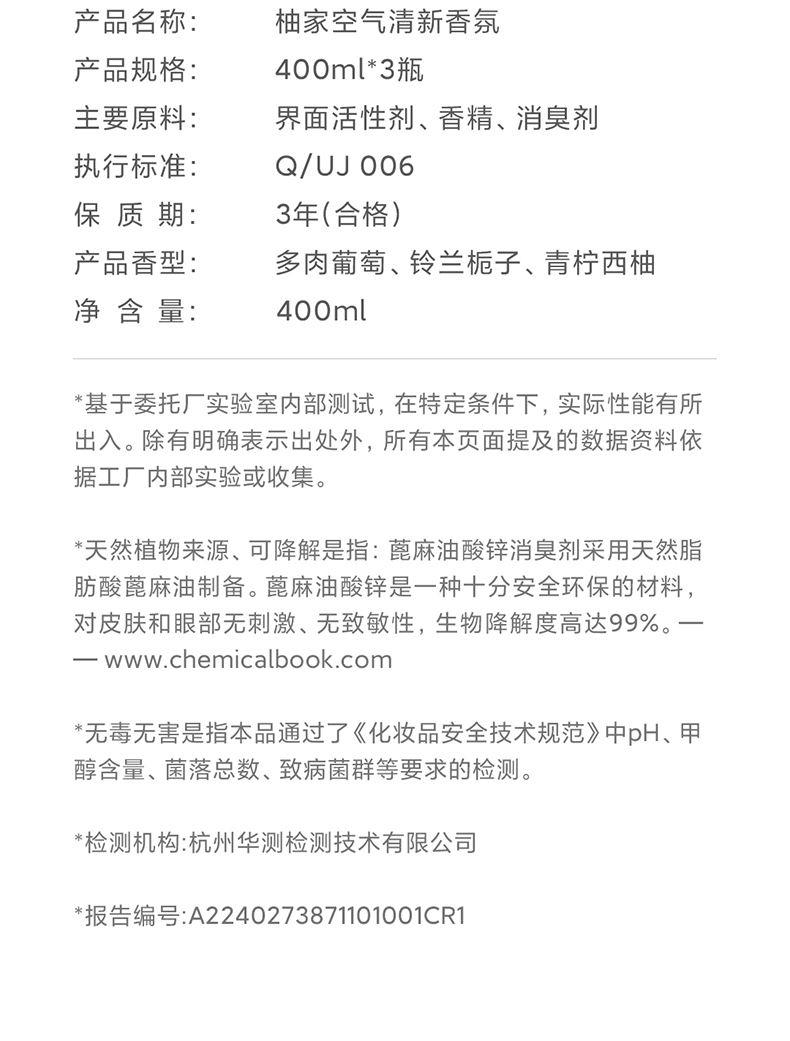 產(chǎn)品規(guī)格:400ml/瓶 三種香型:多肉葡萄 鈴蘭梔子 青檸西柚 主要原料:界面活性劑、香精、消臭劑 保質(zhì)期:3年
