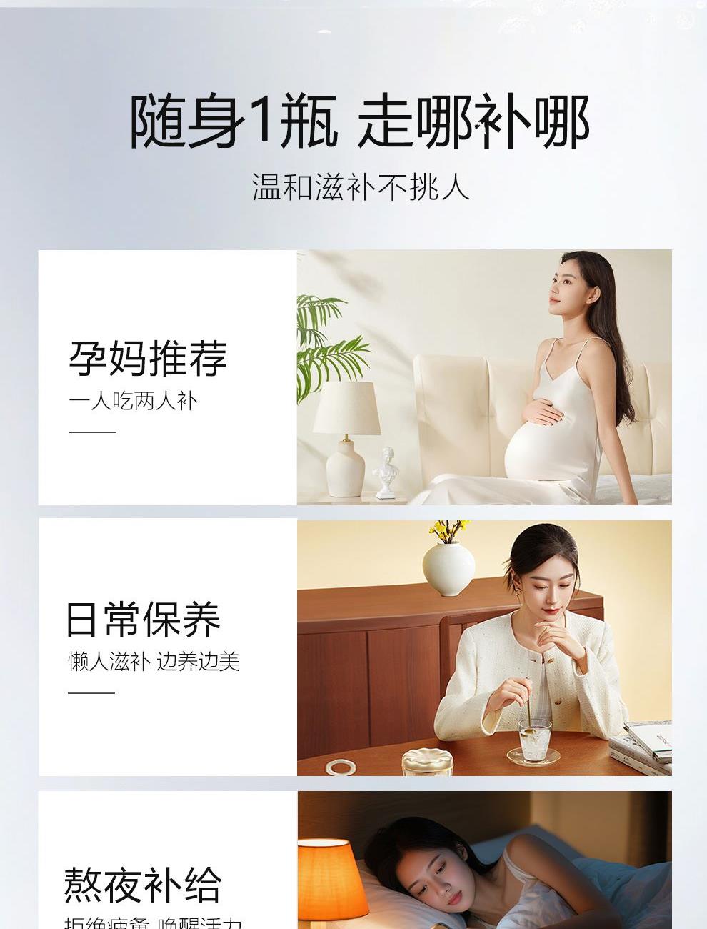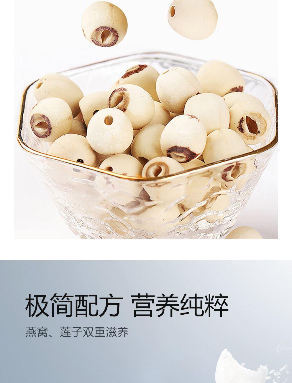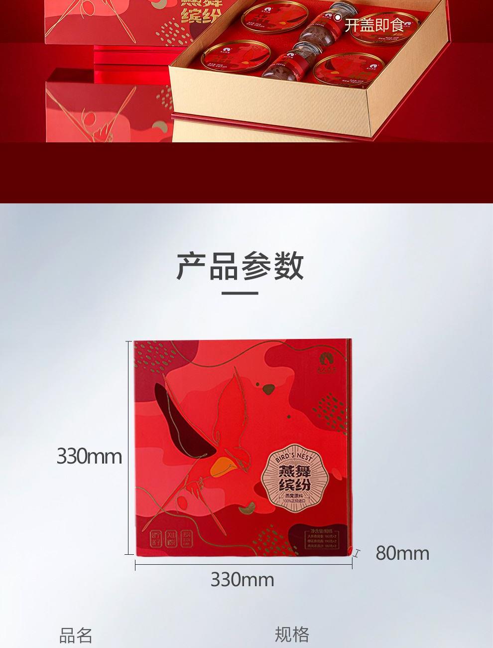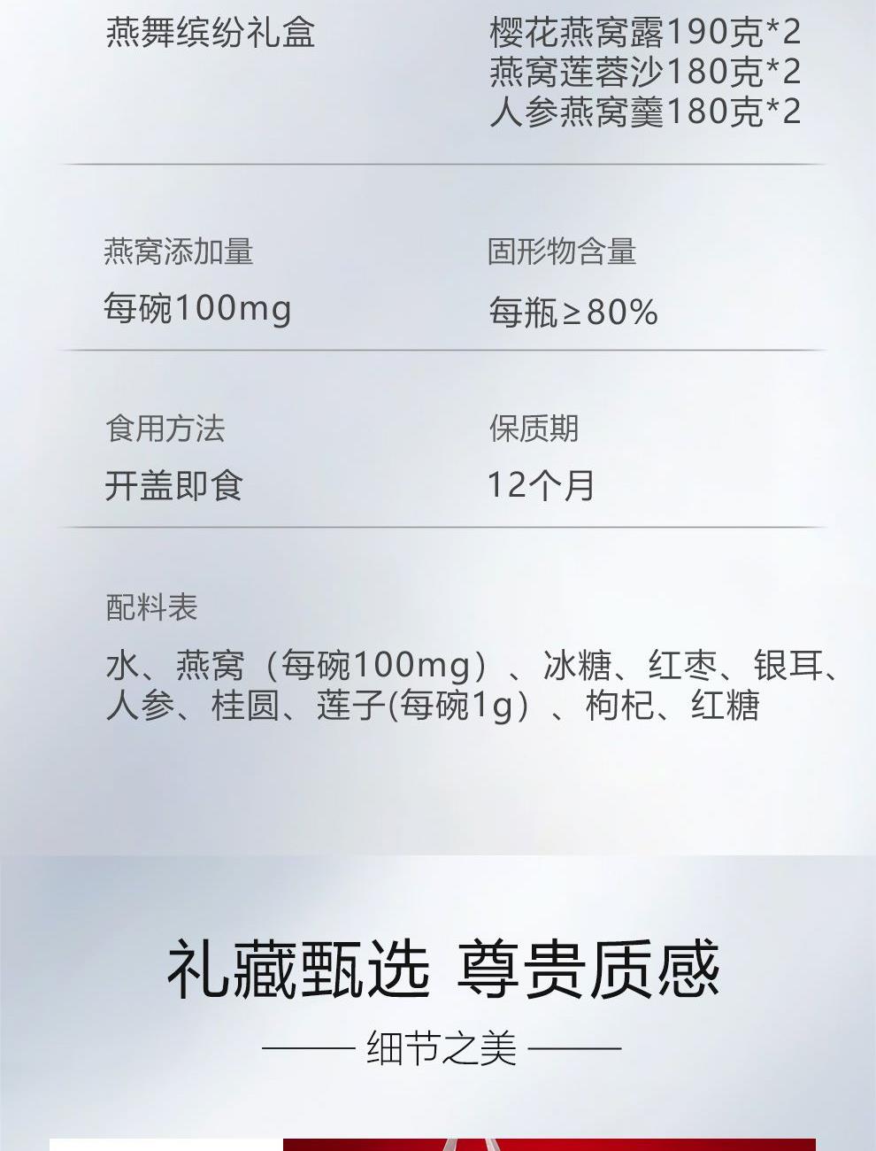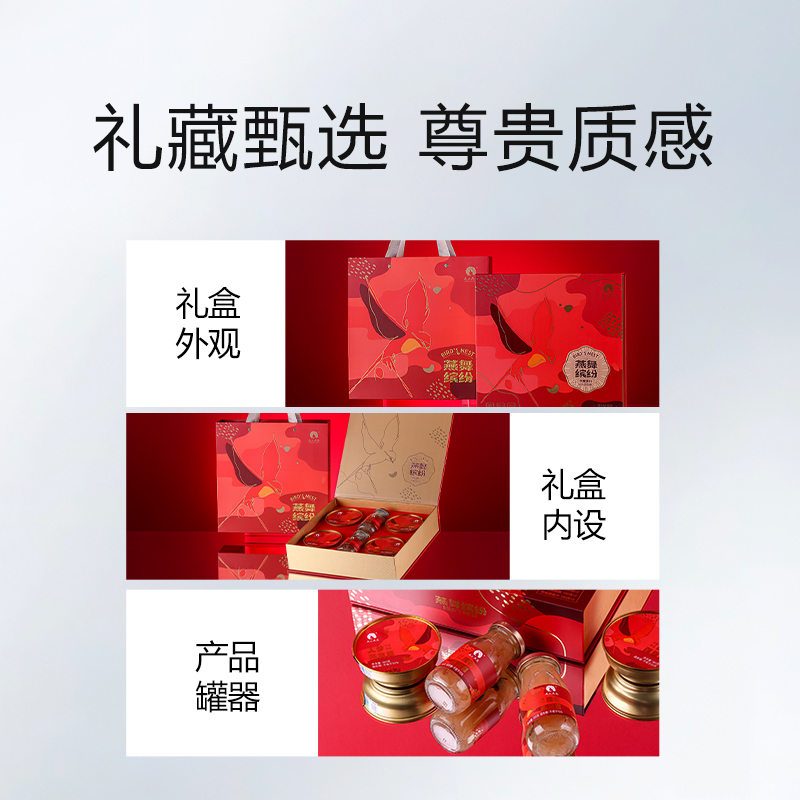 規(guī)格:櫻花燕窩露190克*2、燕窩蓮蓉沙180克*2、人參燕窩羹180克*2 賣點(diǎn):口感細(xì)膩順滑,燕窩的軟糯與櫻花的清香相互融合,給人帶來清新、甜美的味覺體驗(yàn)。結(jié)合了燕窩的滋補(bǔ)與蓮蓉的香甜。燕窩的優(yōu)質(zhì)蛋白質(zhì)和蓮蓉中的蓮子、糖等原料相互搭配,蓮子含有豐富的蛋白質(zhì)、鈣、磷、鐵等營養(yǎng)成分。 將人參的滋補(bǔ)功效與燕窩的營養(yǎng)成分相結(jié)合。