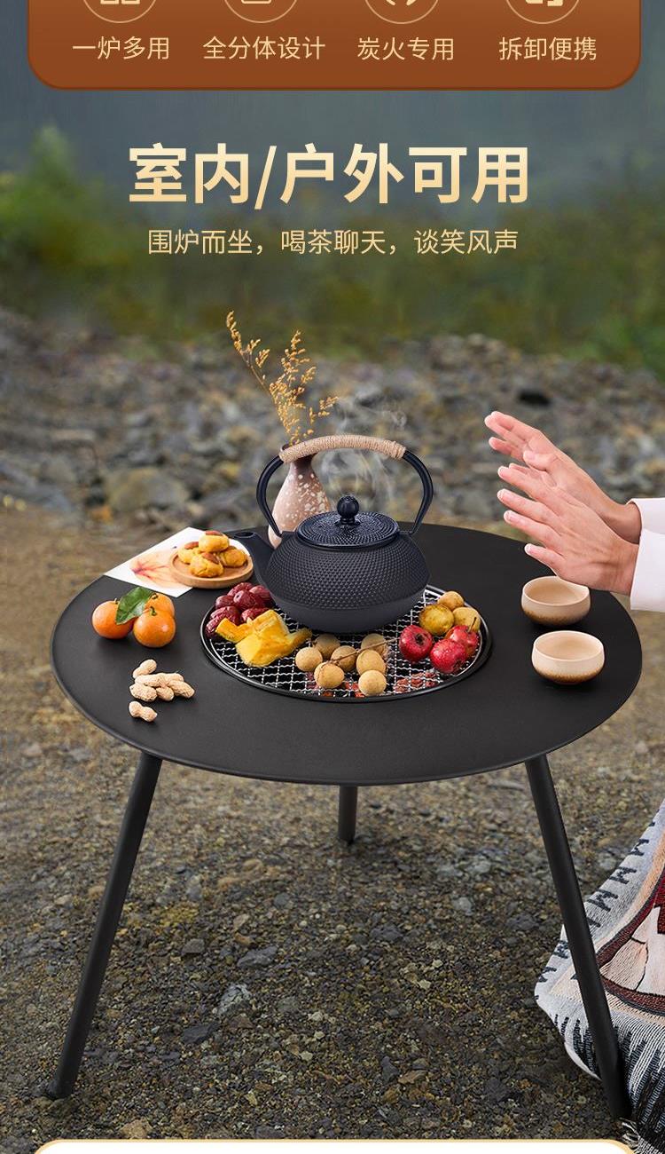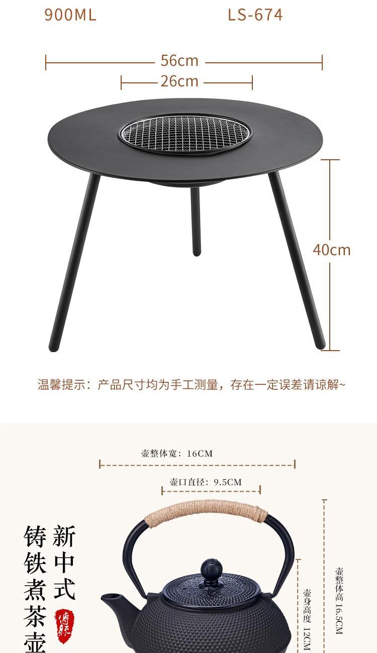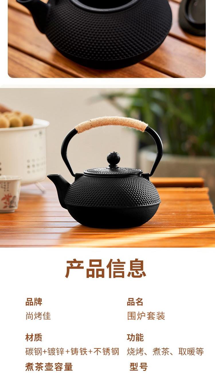 材質(zhì);碳鋼+鍍鋅+鑄鐵+不銹鋼 功能:燒烤、煮茶、取暖等 煮茶壺容量:900ML 型號:LS-674 圍爐、煮茶壺、炭、炭夾、起盤器、煎盤