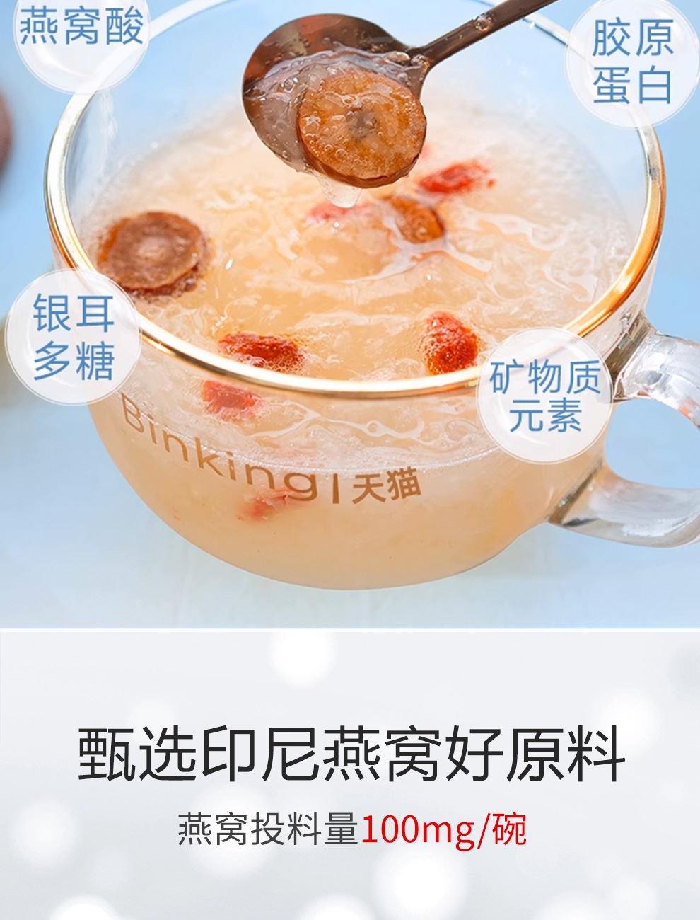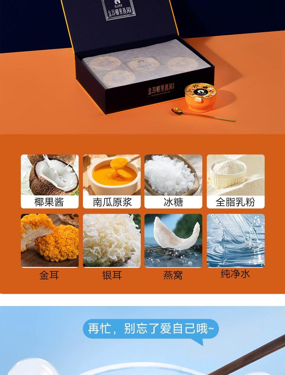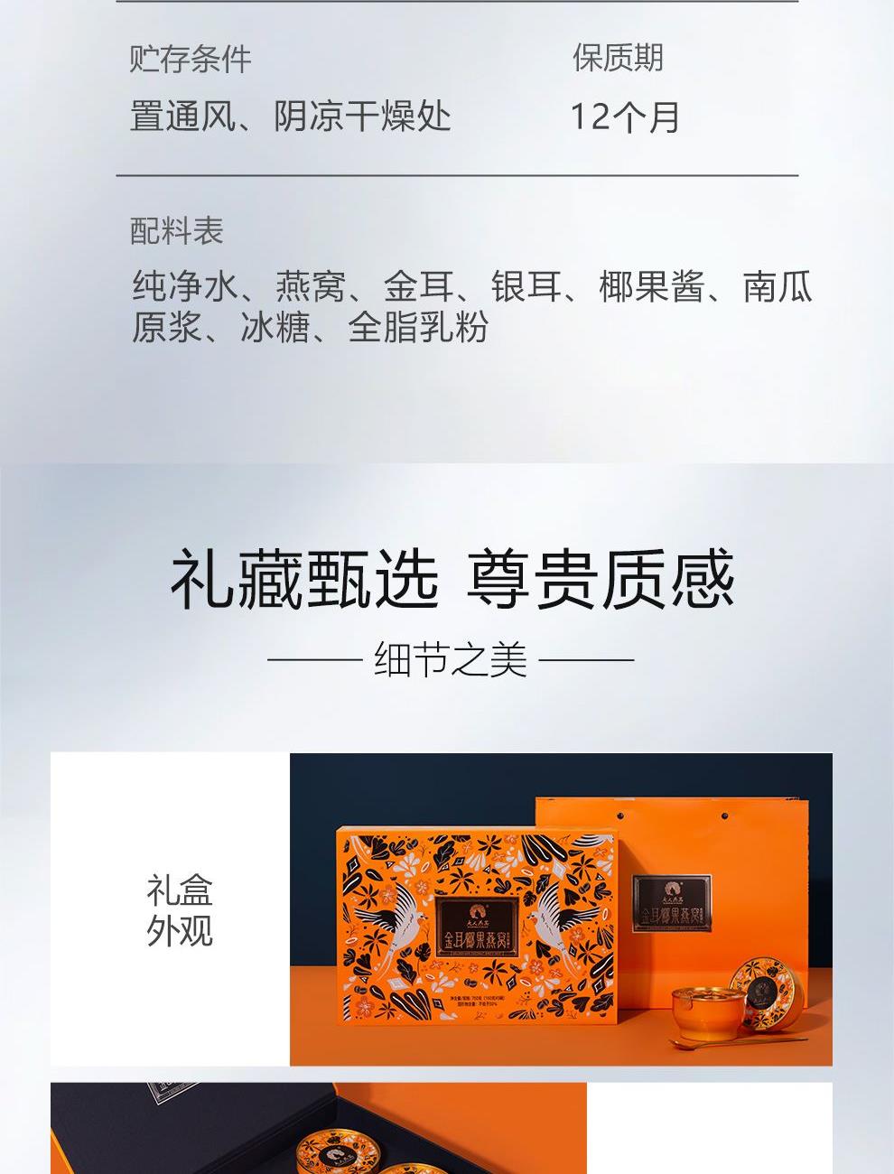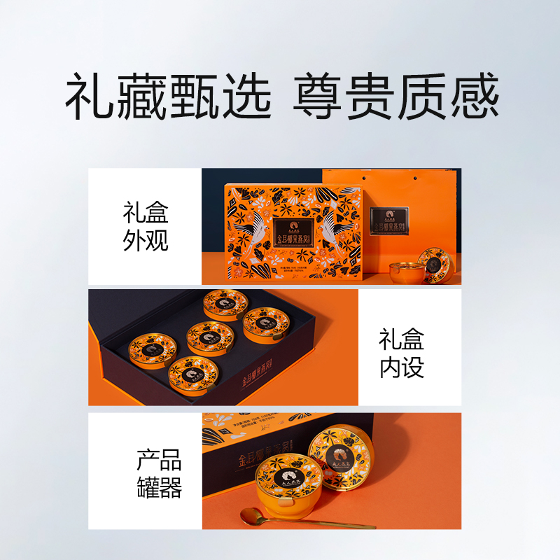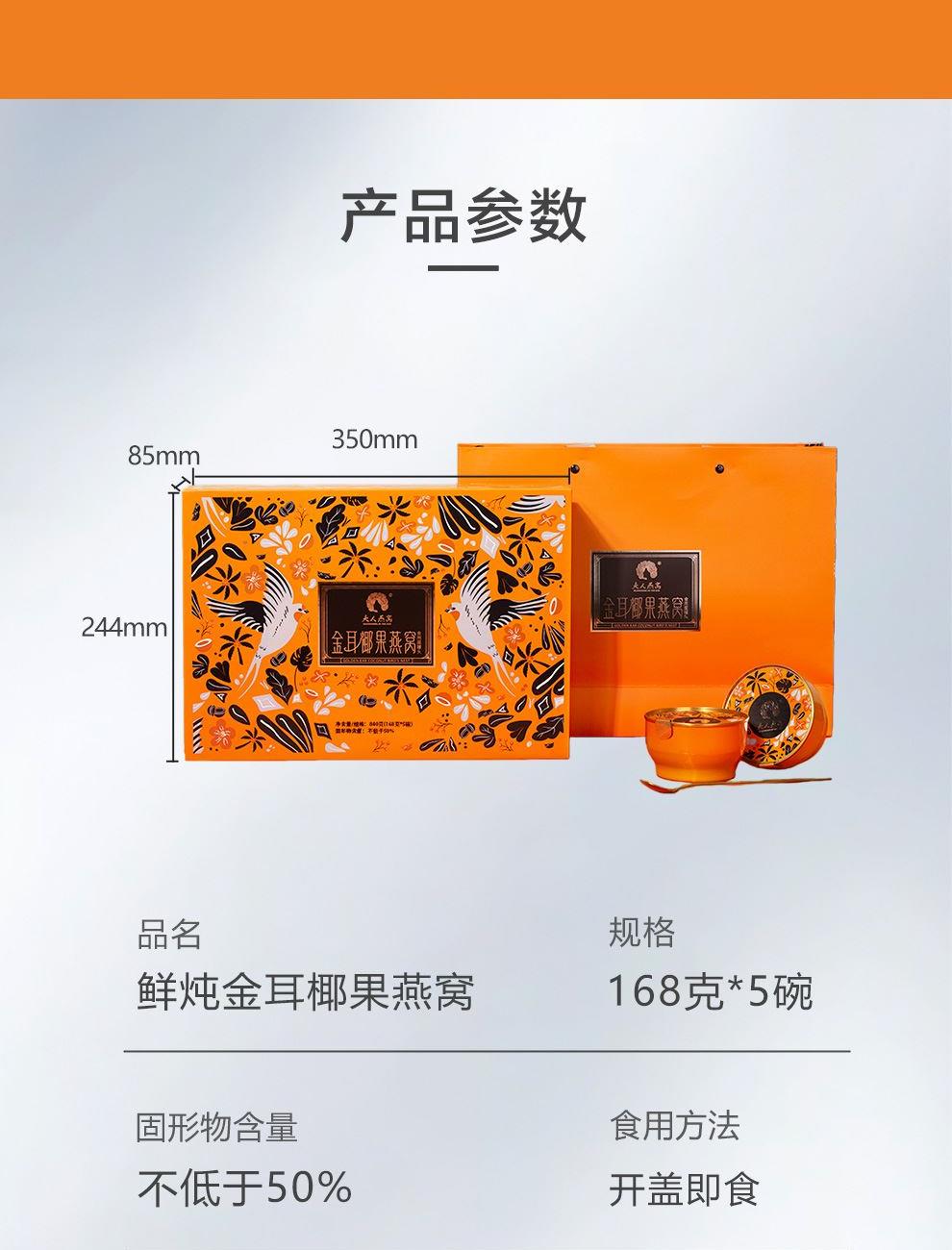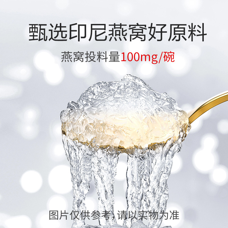 規(guī)格:840克(168克*5碗)、固形物含量不低于50% 賣點:精選印尼溯源燕窩、甄選有機(jī)金耳、銀耳為原材料,達(dá)到多倍滋養(yǎng)。健康0添加,一秒開蓋即食,一天一碗,活力滿滿,是您居家自用、商務(wù)饋贈的不二之選。