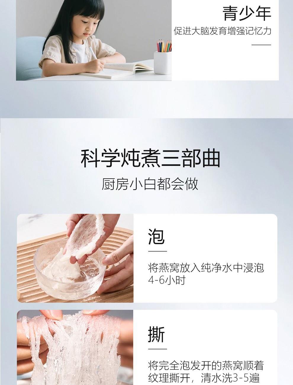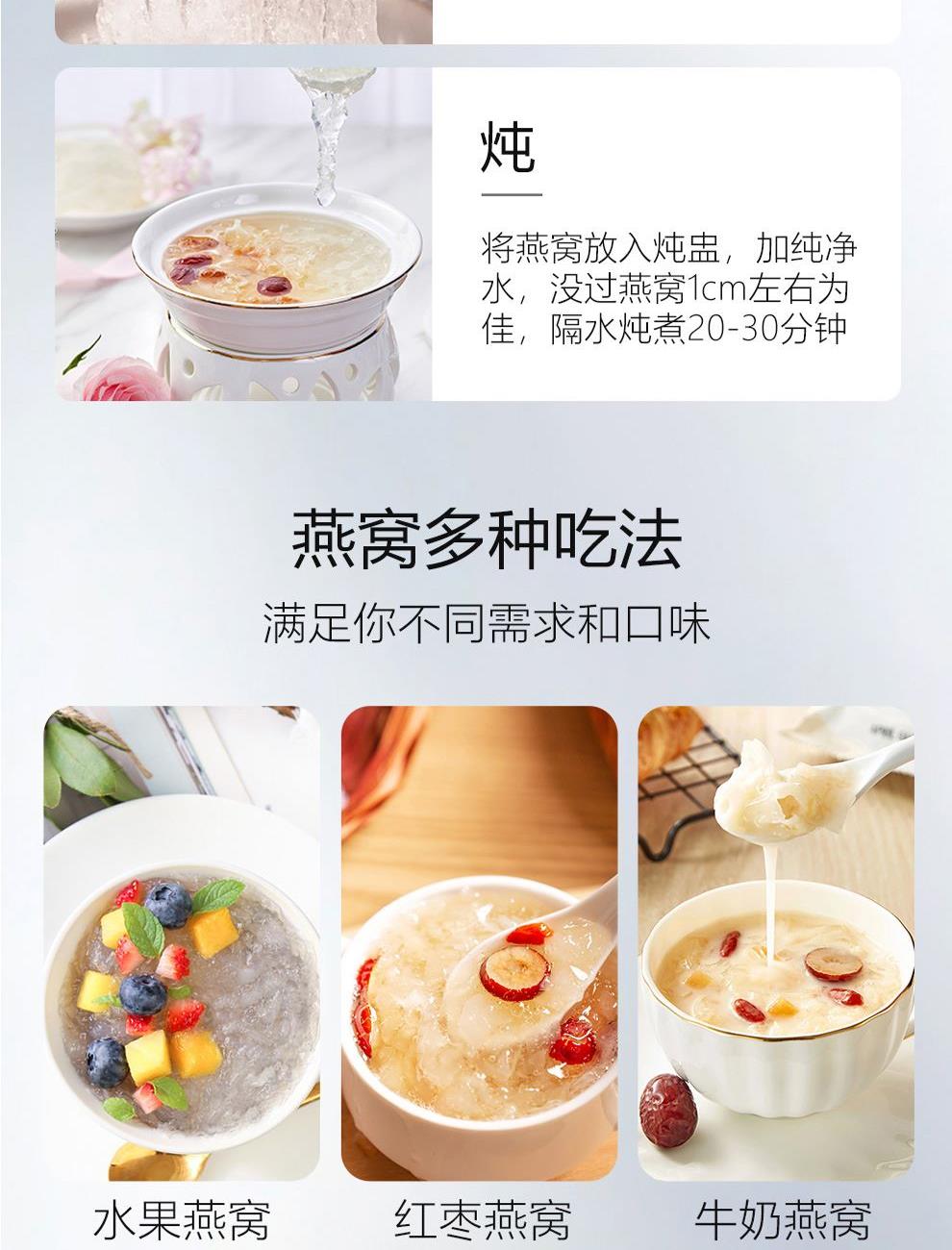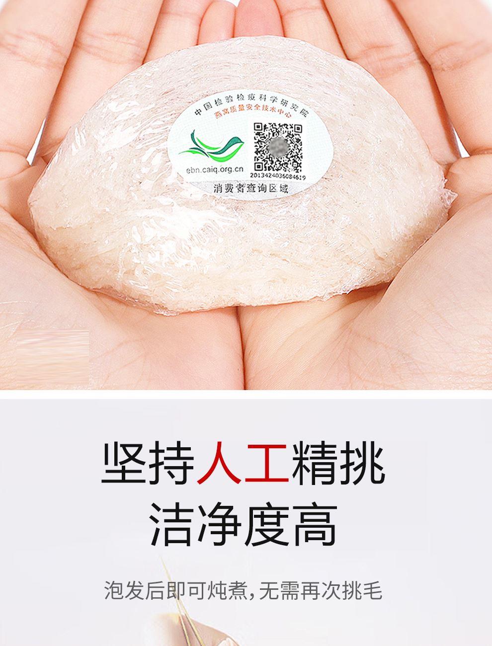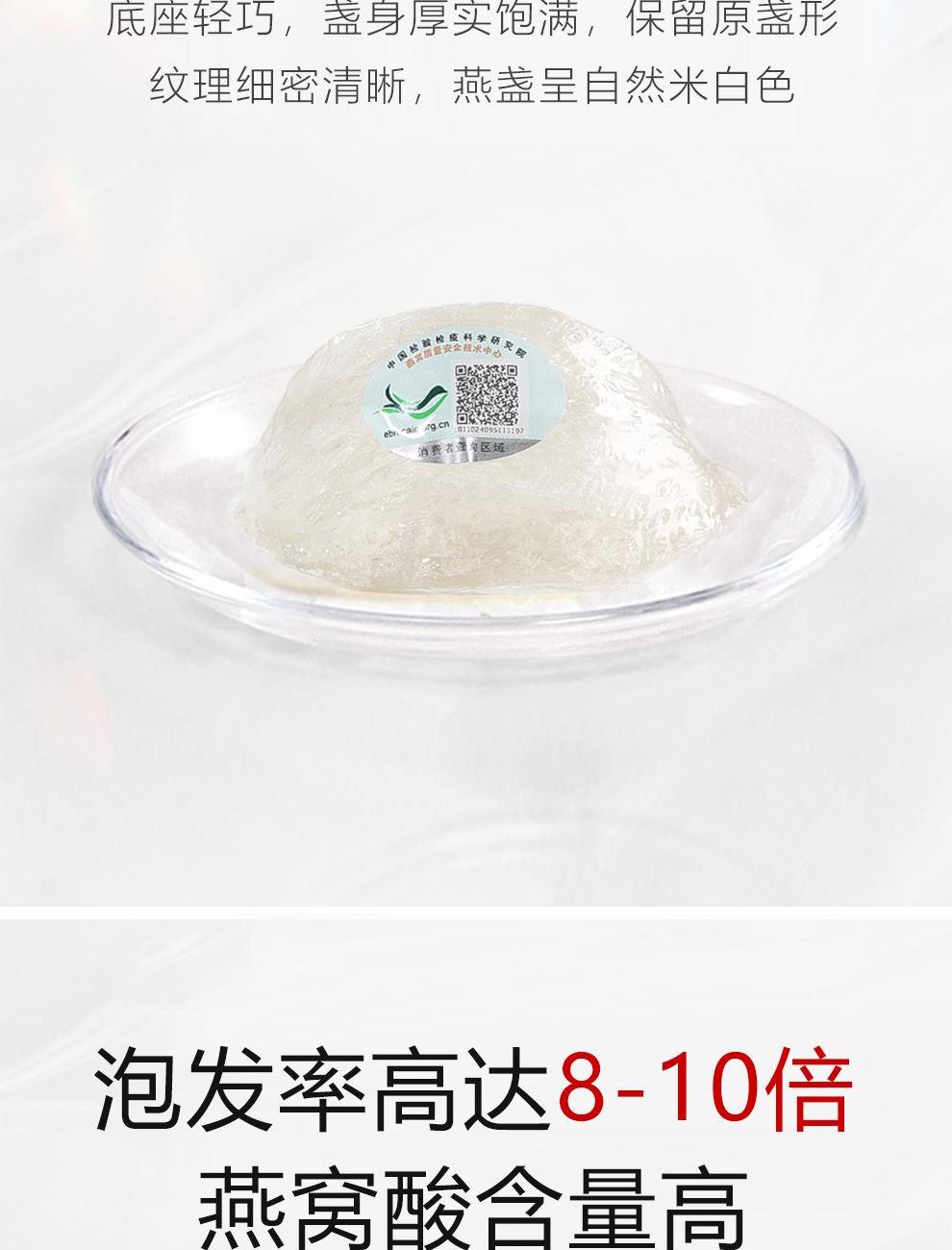 規(guī)格:溯源小盞10克(2-3盞) 賣點(diǎn): 1、一盞一碼,溯源可查,品質(zhì)有保障。 2、不刷膠,不補(bǔ)碎,泡發(fā)率高達(dá)8-10倍。 3、99.9%潔凈度,足干足稱,不為一滴水分買單。 4、節(jié)省時間、免泡發(fā)燕盞省去了泡發(fā)的時間,可以開始燉煮。 5、免泡發(fā)燕盞的加工過程更加標(biāo)準(zhǔn)化,品質(zhì)更加穩(wěn)定。