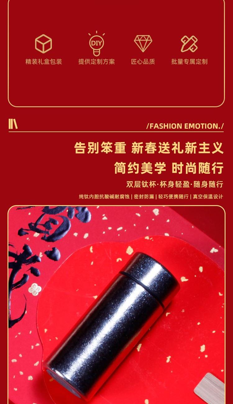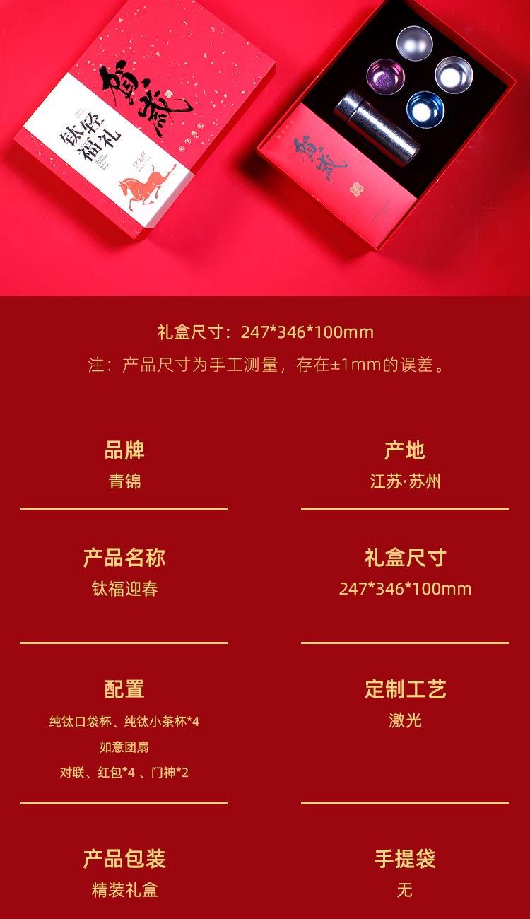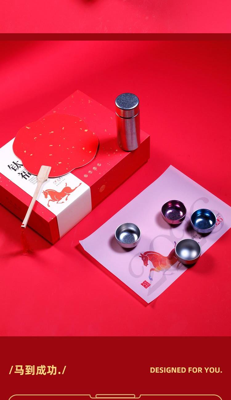 純鈦口袋杯*1只200毫升 重量約125克 對聯(lián)*1-紅包*4 門神*2 純鈦小茶杯*4只 如意團(tuán)扇*1 精裝禮盒手提袋*1灑金藝術(shù)紙精美包裝配置對聯(lián)紅包新春氛圍拉滿 免費(fèi)定制logo不限數(shù)量 免費(fèi)出效果圖 匠心工藝 純鈦材質(zhì) 保鮮 新春創(chuàng)意商務(wù)禮