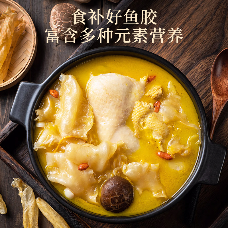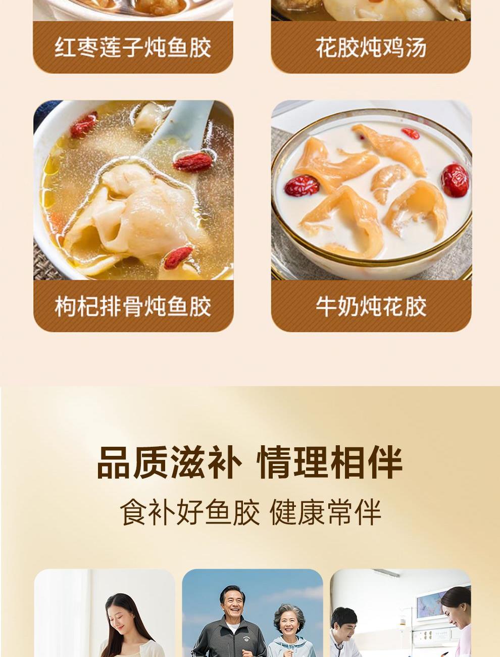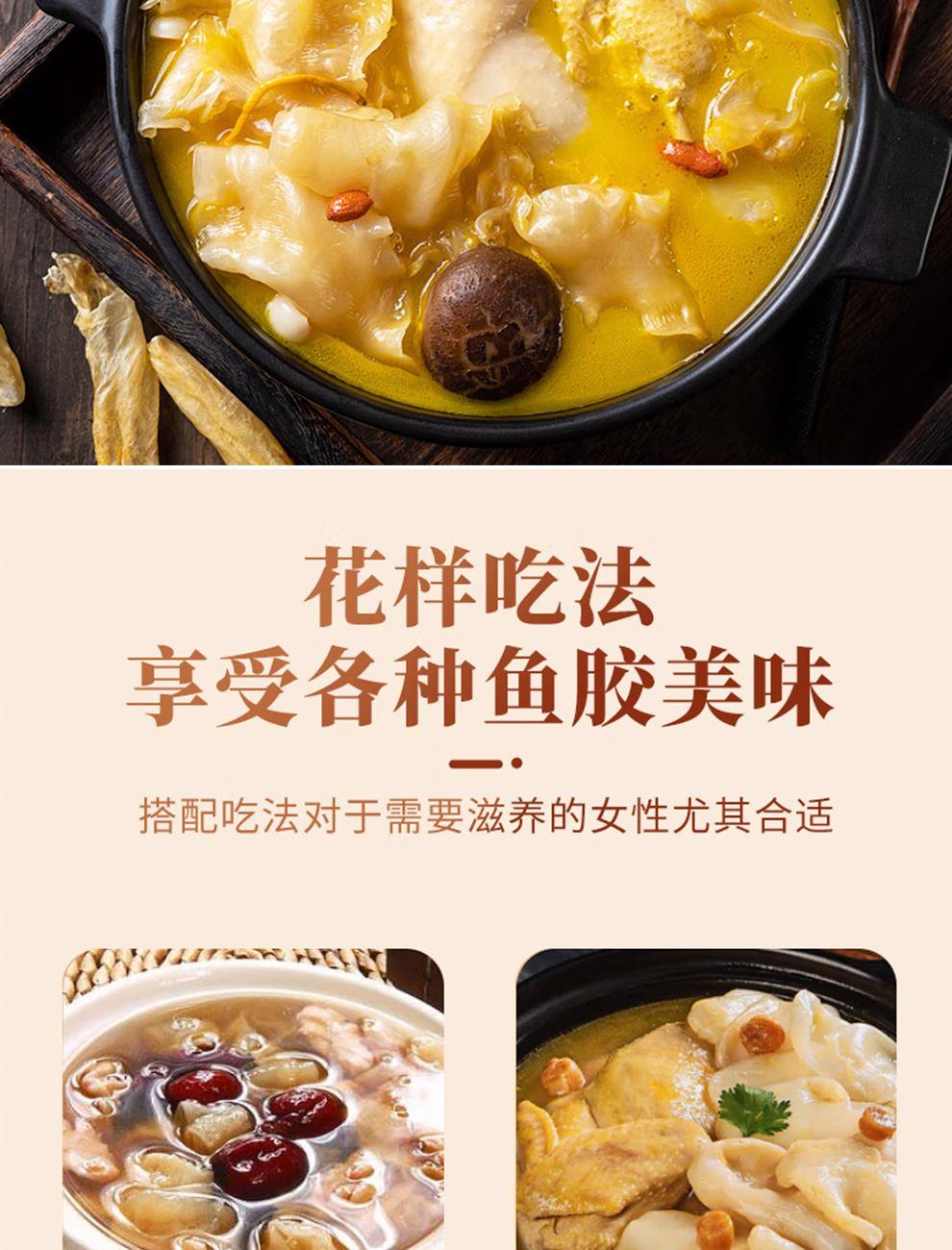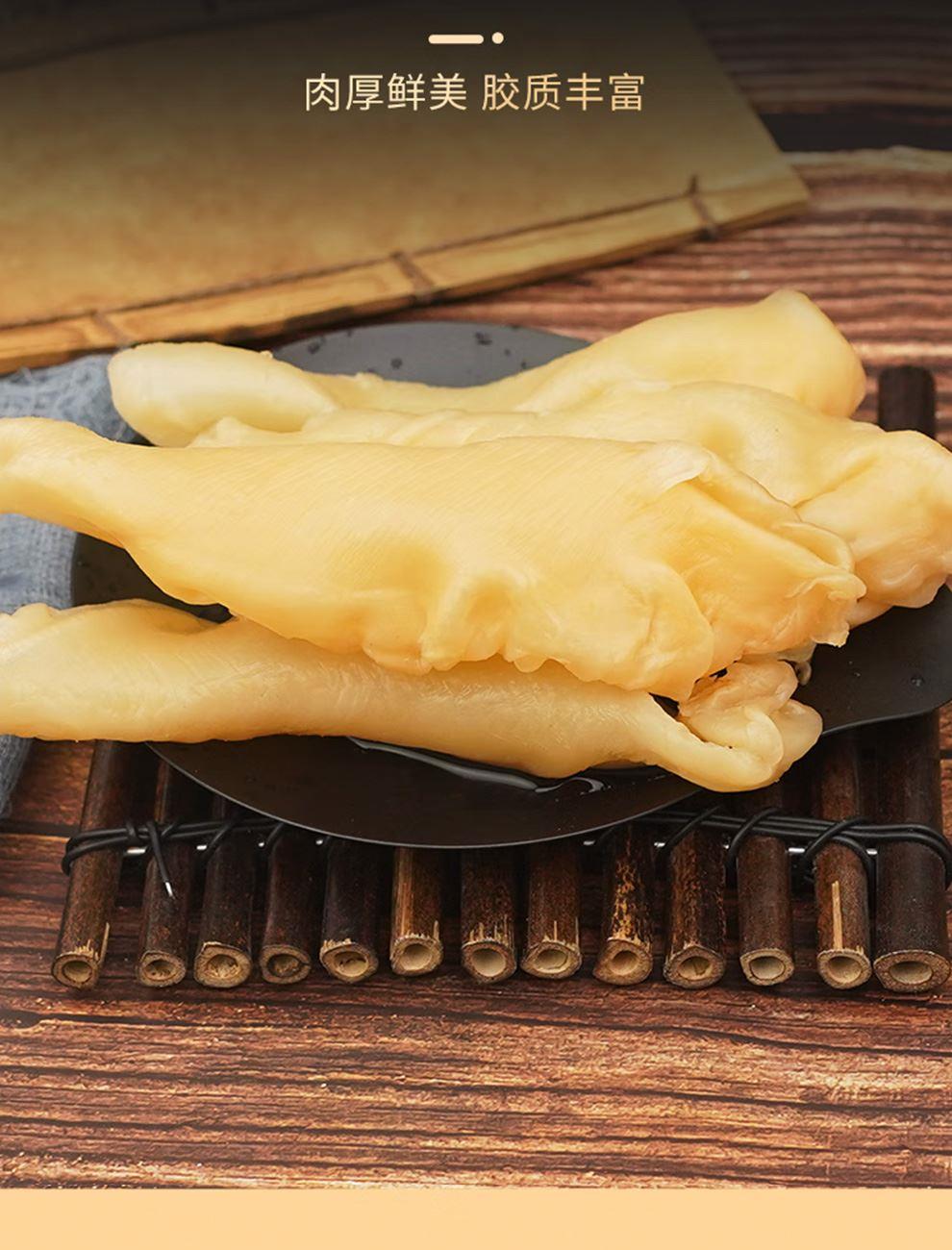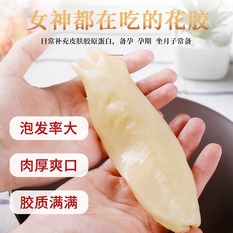 規(guī)格:50克(8-12頭) 賣點: 營養(yǎng)價值高:黃花筒膠是花膠的一種,富含膠原蛋白,這種成分對皮膚有很好的滋養(yǎng)作用,能夠增加皮膚的彈性,減少皺紋,起到美容養(yǎng)顏的功效。同時,還含有多種維生素和礦物質(zhì),有助于補充人體所需的營養(yǎng)元素。 - 口感鮮美:在烹飪后,黃花筒膠具有軟滑、Q彈的口感 - 烹飪多樣性:可以用于多種烹飪方式,比如制作花膠雞湯、花膠排骨湯等滋補湯品。