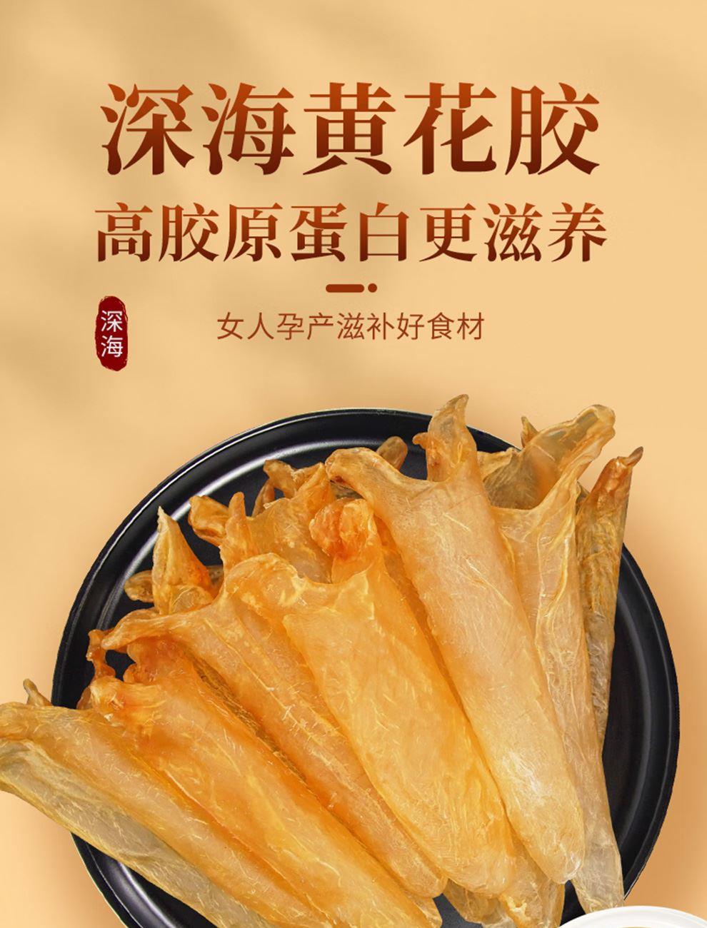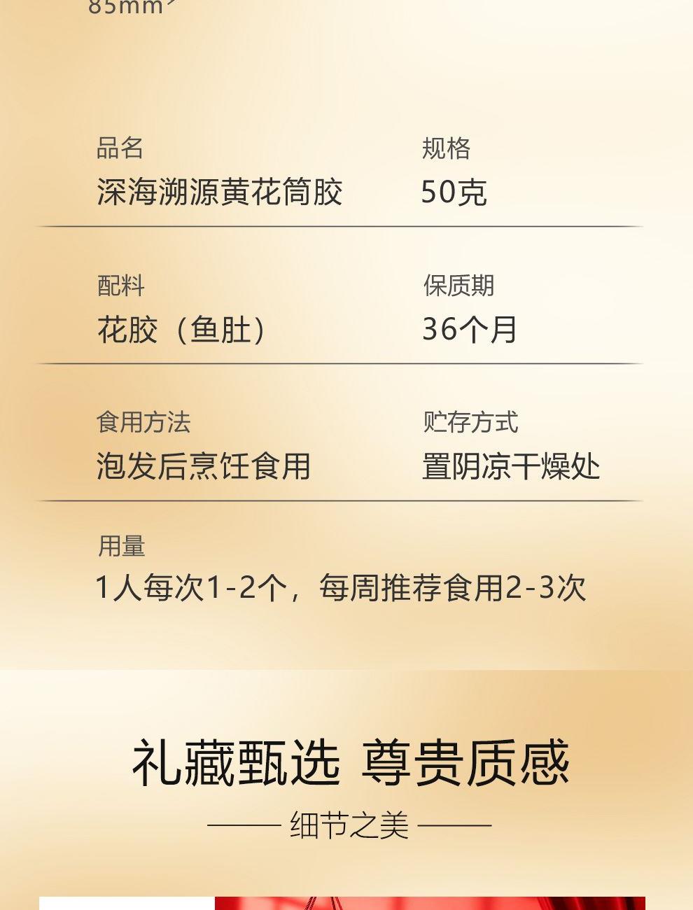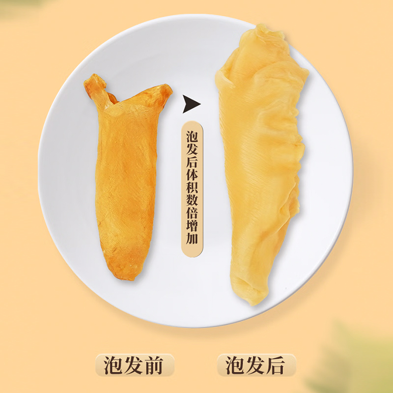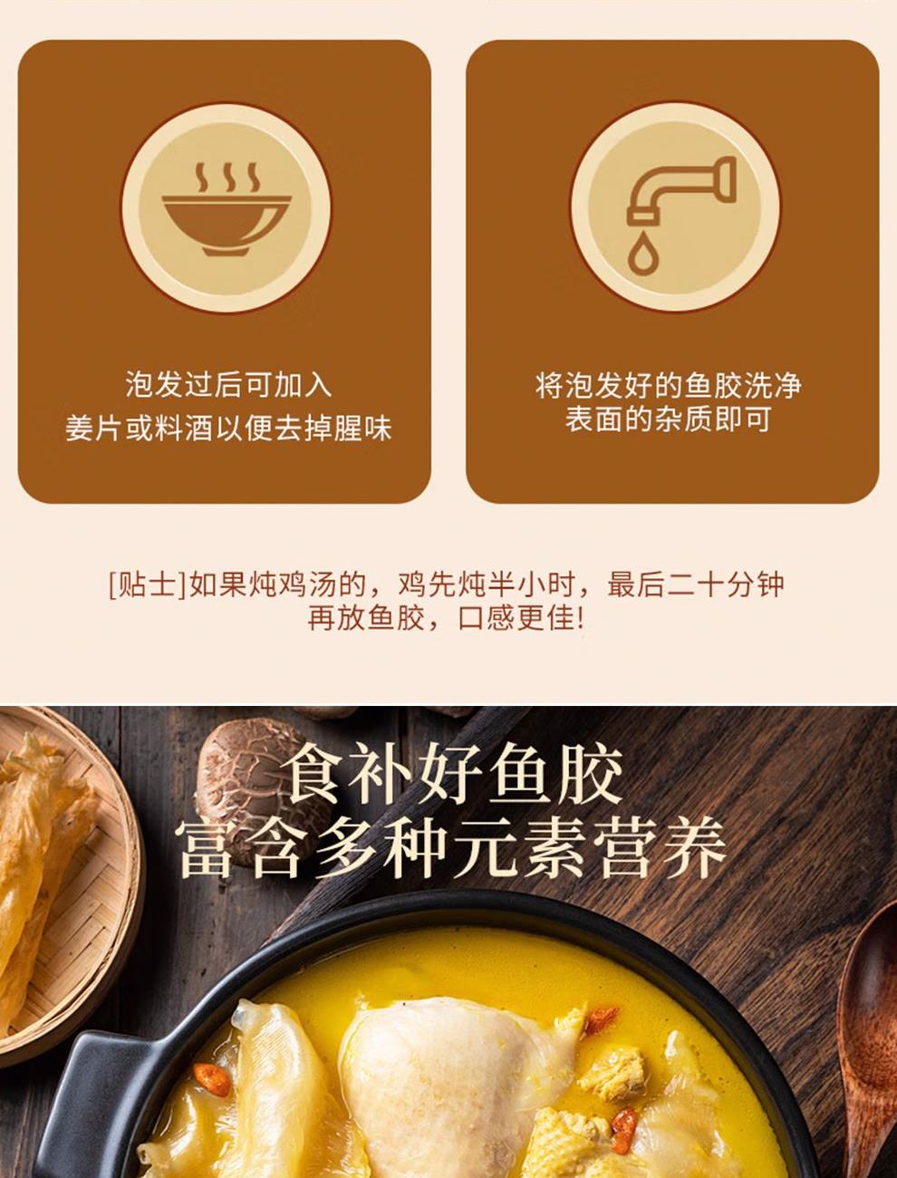 規(guī)格:50克(8-12頭) 賣點: 營養(yǎng)價值高:黃花筒膠是花膠的一種,富含膠原蛋白,這種成分對皮膚有很好的滋養(yǎng)作用,能夠增加皮膚的彈性,減少皺紋,起到美容養(yǎng)顏的功效。同時,還含有多種維生素和礦物質(zhì),有助于補充人體所需的營養(yǎng)元素。 - 口感鮮美:在烹飪后,黃花筒膠具有軟滑、Q彈的口感 - 烹飪多樣性:可以用于多種烹飪方式,比如制作花膠雞湯、花膠排骨湯等滋補湯品。