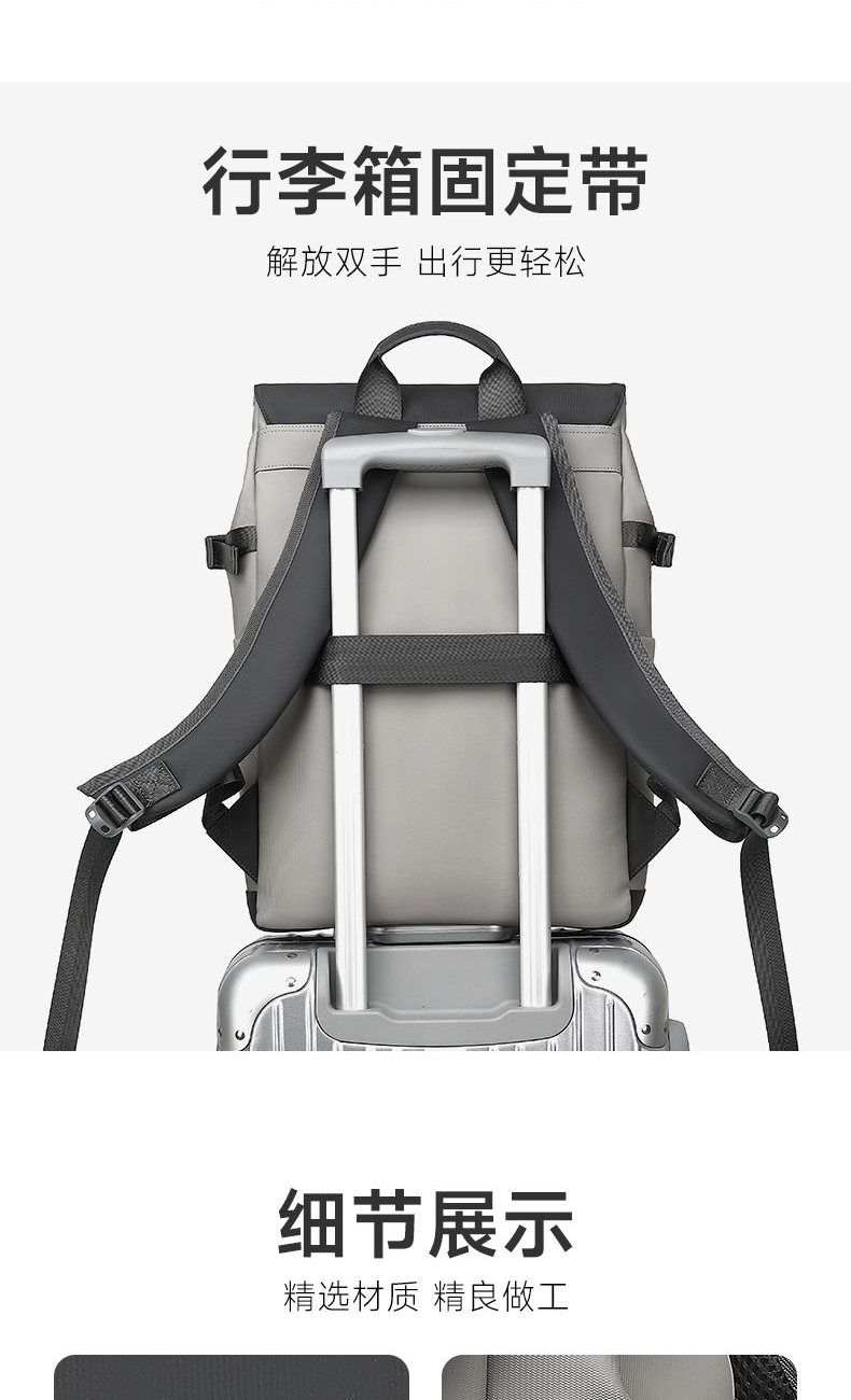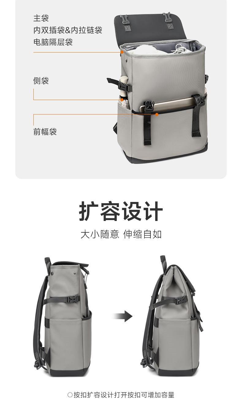 結(jié)構(gòu):1主倉(cāng)(帶電腦倉(cāng))、1前拉鏈袋、2側(cè)袋、2內(nèi)插袋、1內(nèi)拉鏈袋