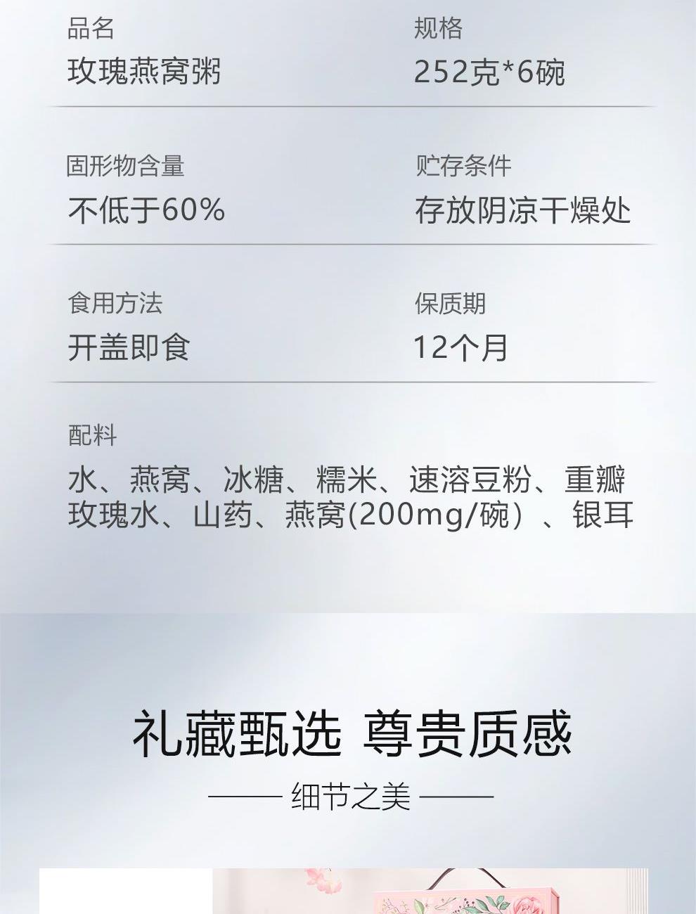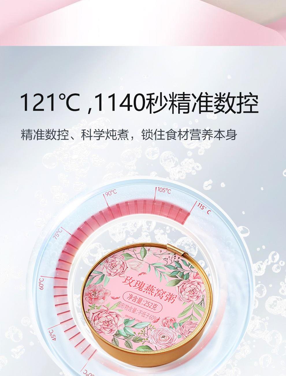 規(guī)格:1512克(252克*6碗)、固形物不低于60% 賣點(diǎn):玫瑰燕窩粥憑借 “燕窩的滋補(bǔ) + 玫瑰的芬芳 + 粥品的溫潤” 三重優(yōu)勢(shì),打破傳統(tǒng)養(yǎng)生食品的單一屬性,成為早餐、下午茶、產(chǎn)后調(diào)理等場(chǎng)景的優(yōu)選。