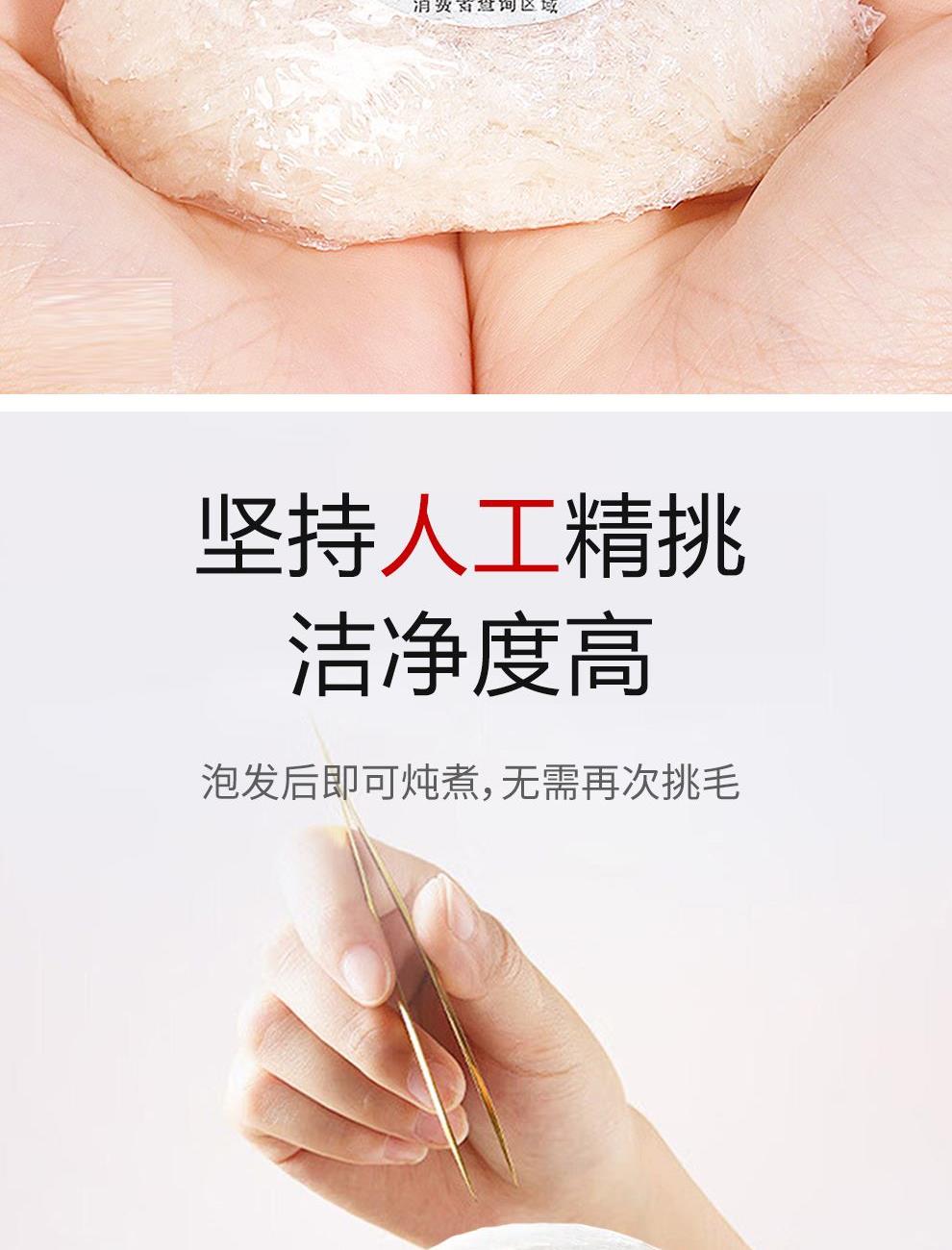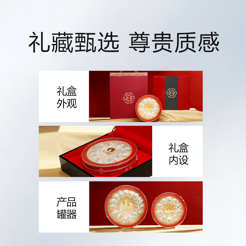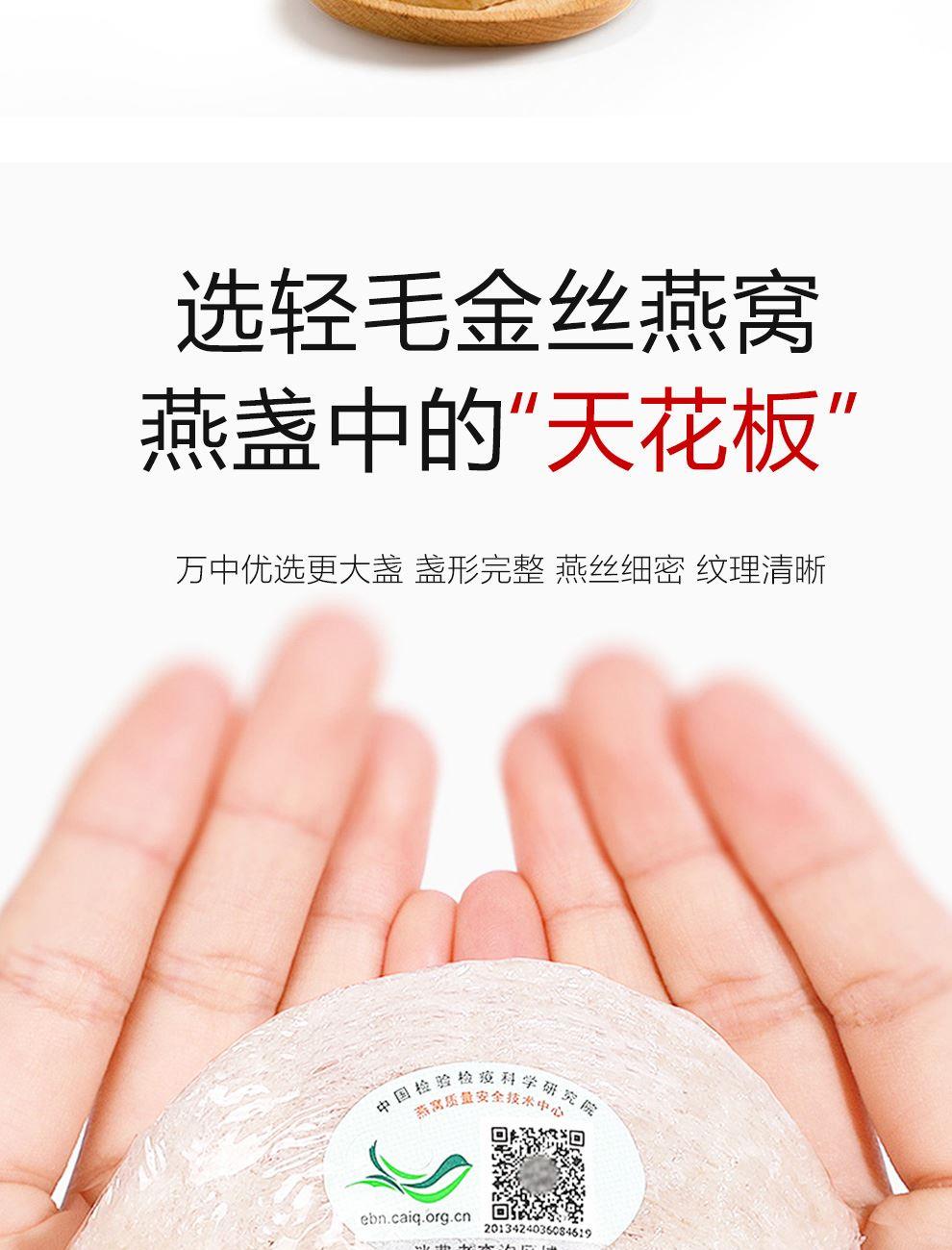 規(guī)格:溯源大盞50克 賣點(diǎn): 1、一盞一碼,溯源可查,品質(zhì)有保障。 2、不刷膠,不補(bǔ)碎,泡發(fā)率高達(dá)8-10倍。 3、99.9%潔凈度,足干足稱,不為一滴水分買單。 4、節(jié)省時(shí)間、免泡發(fā)燕盞省去了泡發(fā)的時(shí)間,可以開始燉煮。 5、免泡發(fā)燕盞的加工過程更加標(biāo)準(zhǔn)化,品質(zhì)更加穩(wěn)定。