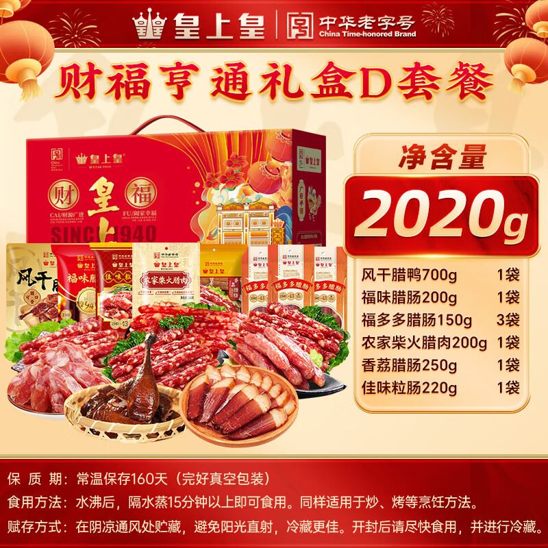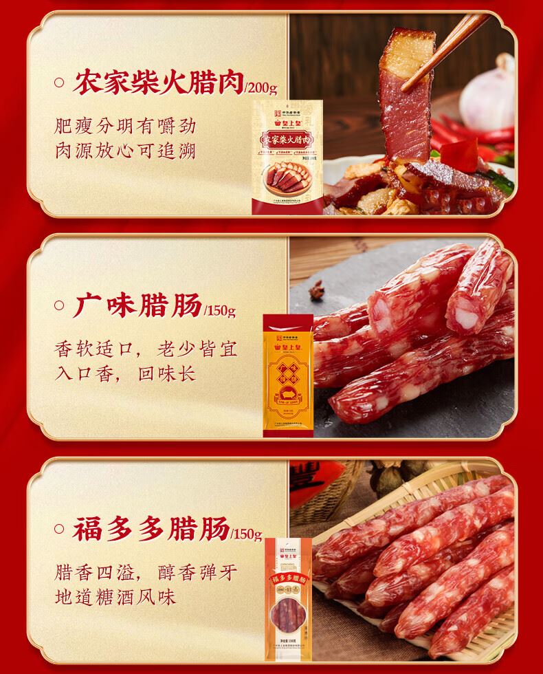 風(fēng)干臘鴨700g*1 福味臘腸200g*1 豬肉鋪80克*1 福多多臘腸150g*2 農(nóng)家柴火臘肉200g*1 香荔臘腸250g*1 蛋黃鳳凰盞100g*1 佳味粒腸220g*1