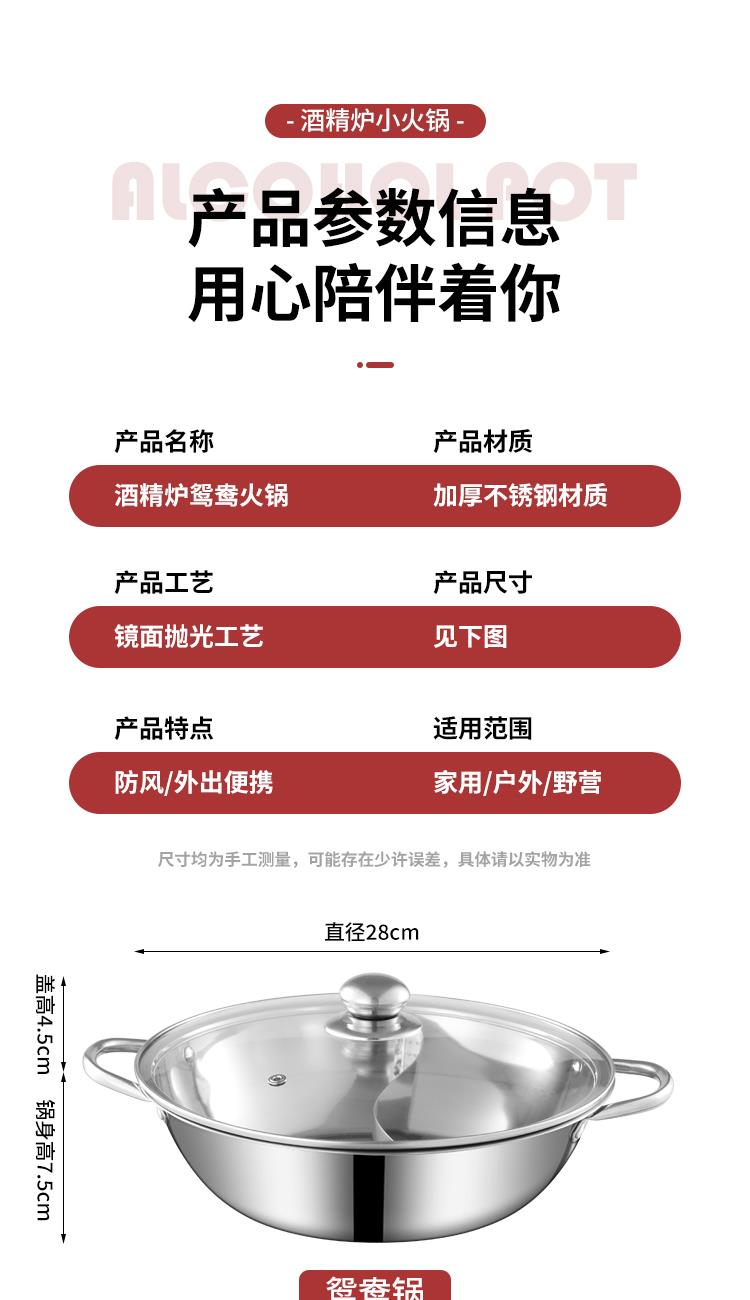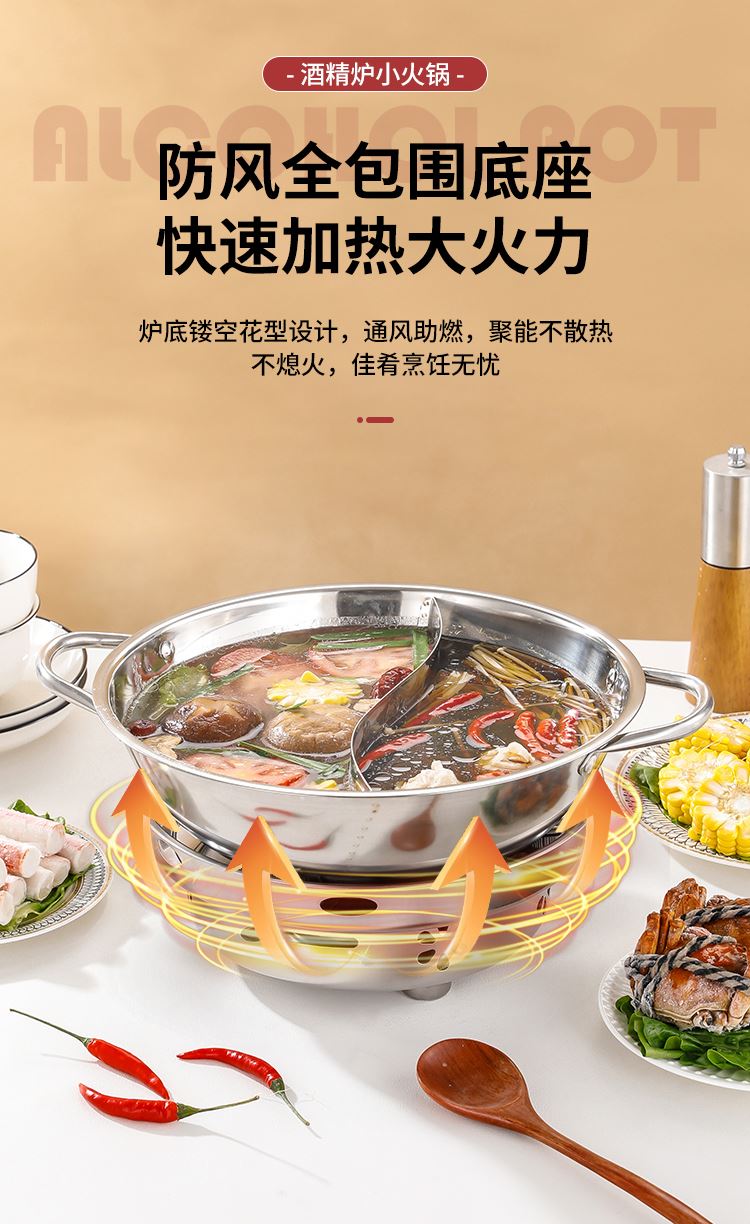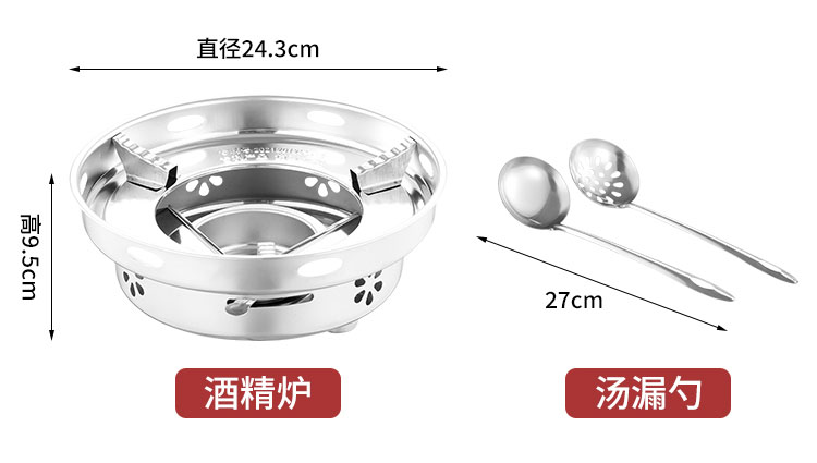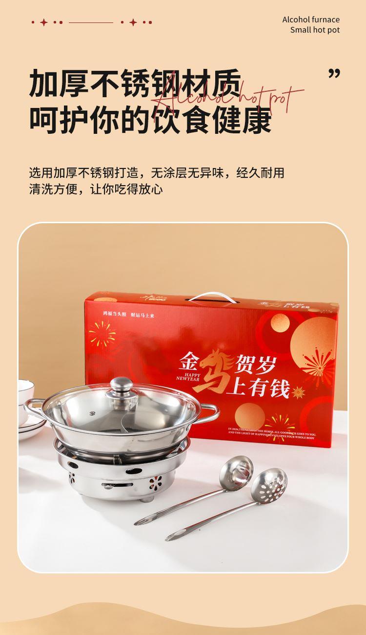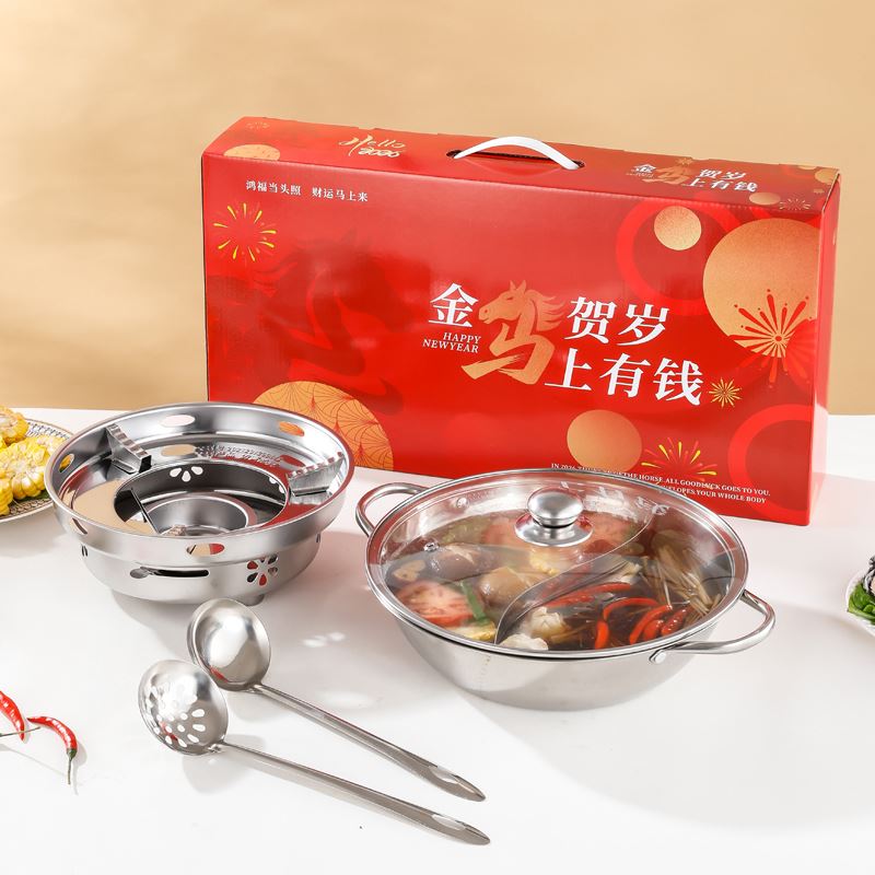 產(chǎn)品規(guī)格:28cm鴛鴦鍋?酒精爐?湯勺?漏勺 產(chǎn)品材質(zhì):201不銹鋼 彩盒尺寸:52.5*10*28.5CM 外箱尺寸:64*54*59 cm 福祿雙喜,湯勺撈福,漏勺添財,紅紅火火團團圓圓, 火鍋二味分隔設計滿足不同口味需求,酒精爐加熱保持溫度穩(wěn)定 搭配不銹鋼湯勺漏勺,冬天涮火鍋實用又美味~ 超大禮盒包裝,客情維護,促銷儲值禮品,低成本高價值。