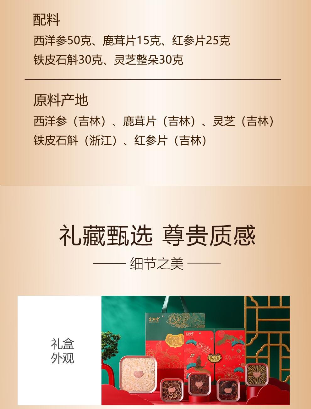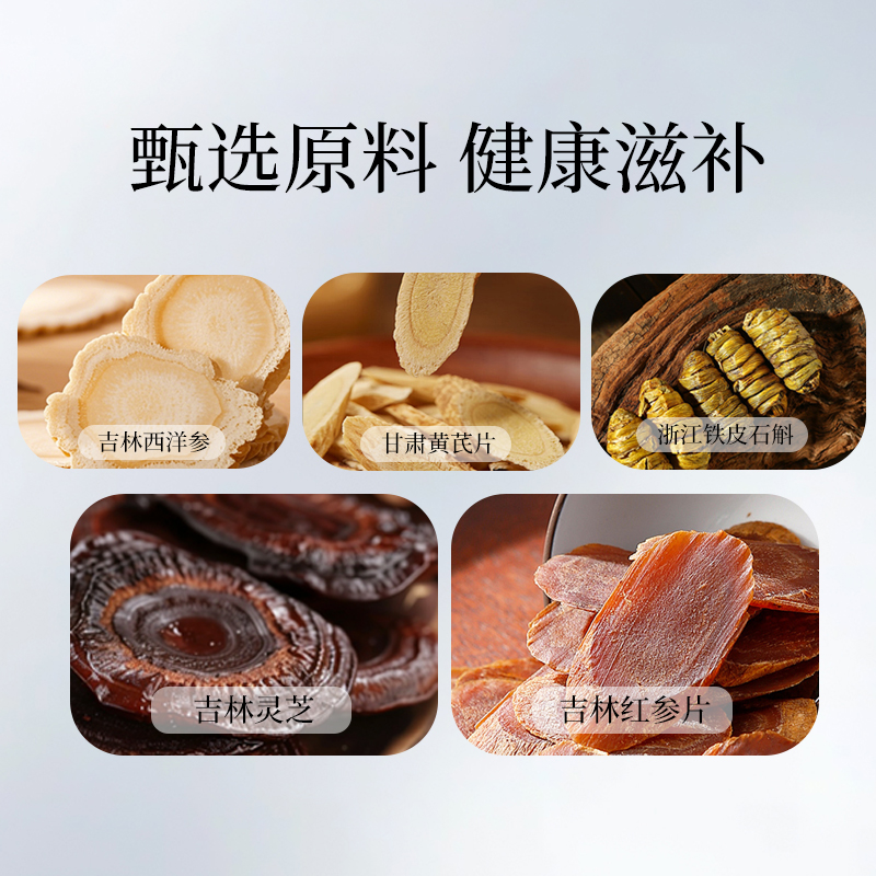 規(guī)格:石斛30克、西洋參50克、鹿茸片15克、紅參片25克、靈芝整朵30克 賣點(diǎn): 集合了石斛、西洋參、鹿茸片、紅參片和靈芝等多種珍貴的藥材。每一種都因其獨(dú)特的生長環(huán)境和稀缺性而顯得格外珍貴。
