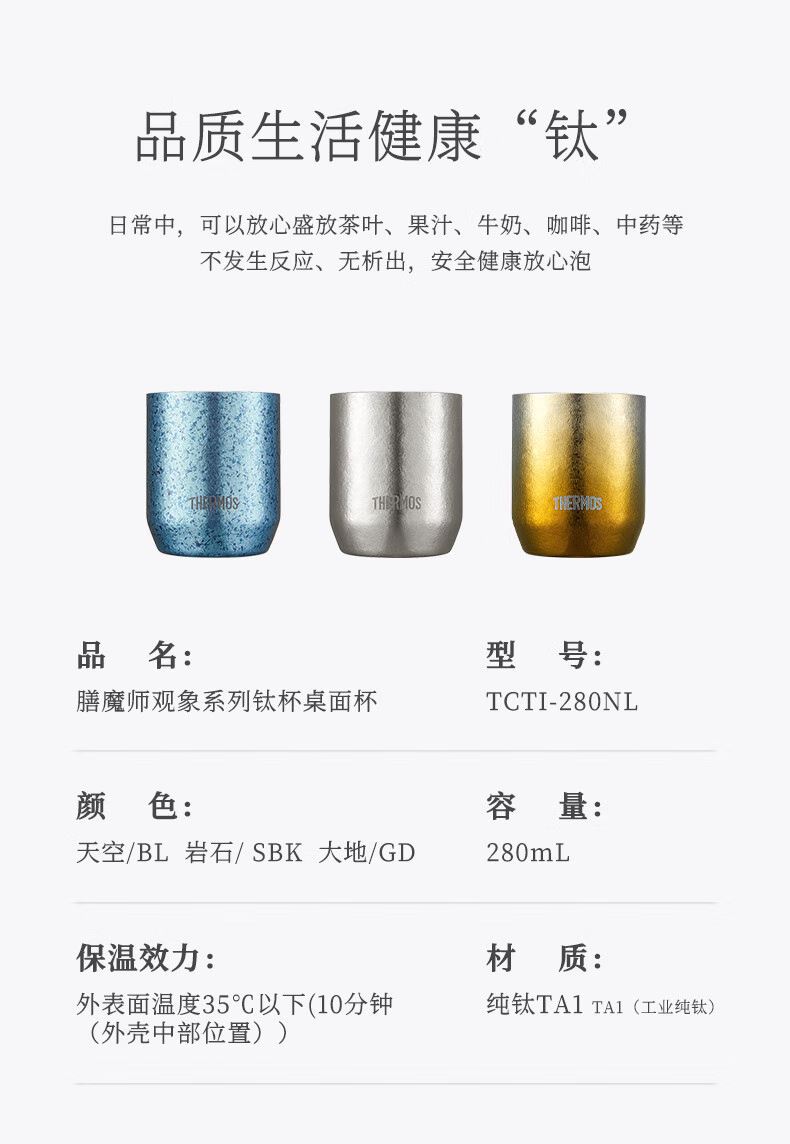 品 牌:膳魔師 型 號:TCTI-280NL 顏 色:天空BL /巖石SBK /大地GD 容 量:280ml 類 型:鈦杯 材 質(zhì):內(nèi)管/外管:純鈦 TA1 TA1(工業(yè)純鈦)