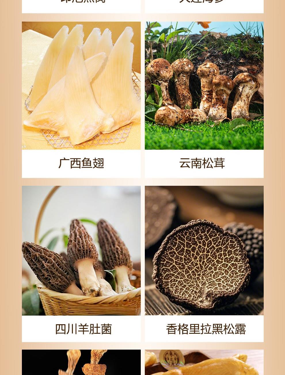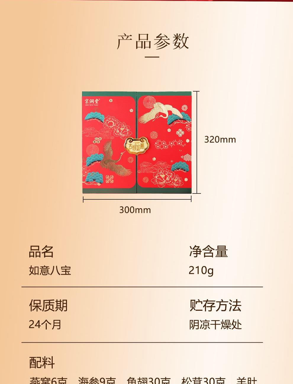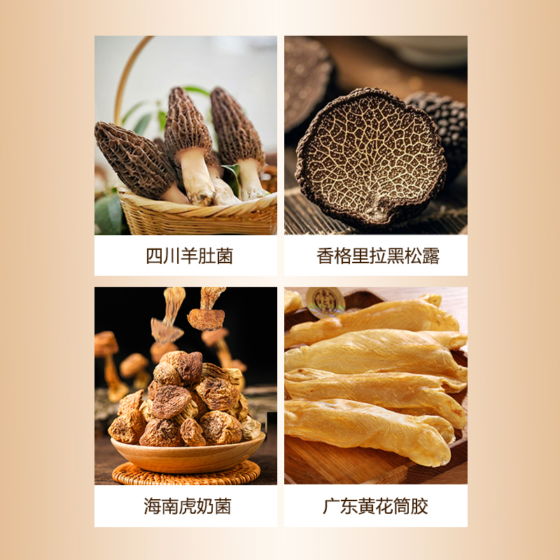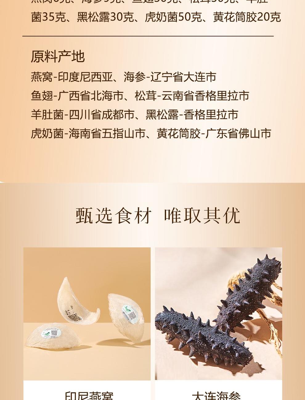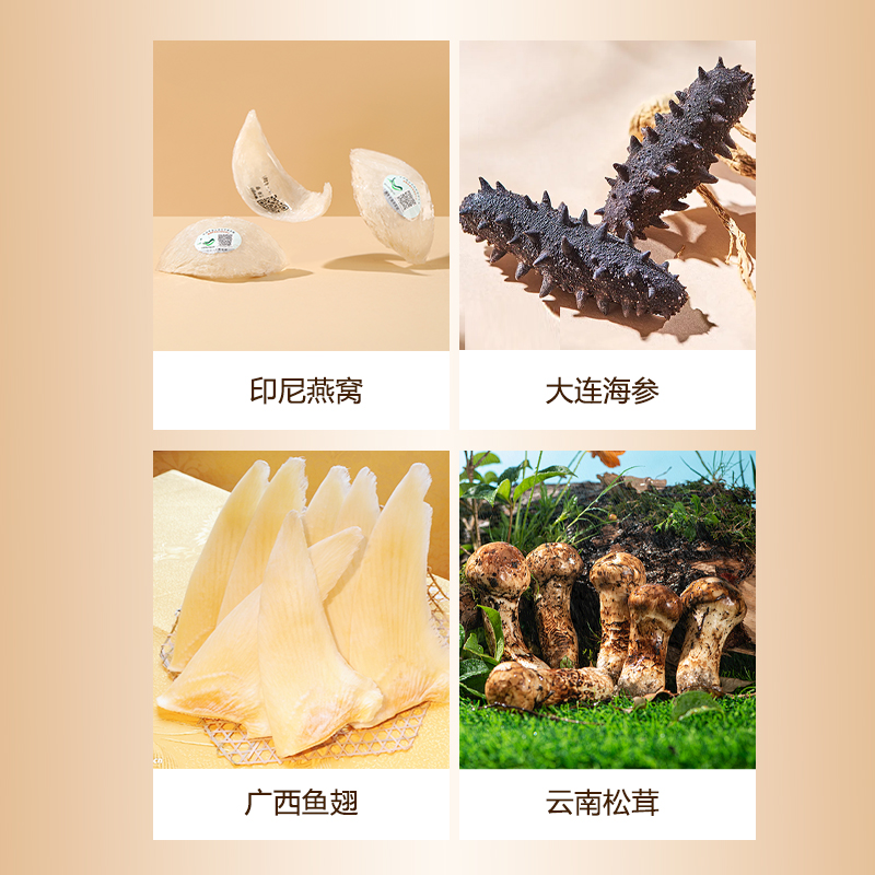 規(guī)格:燕窩6克、海參6支、魚翅30克、松茸30克、羊肚菌35克、黑松露30克、虎奶菌50克、黃花筒膠20克 賣點: ? 珍貴食材 精挑細選 ? 傳統(tǒng)滋補 現(xiàn)代工藝 ? 高貴禮贈 彰顯品味 ? 四季養(yǎng)生 倍添活力 一份禮盒,八重滋養(yǎng),百分誠意??