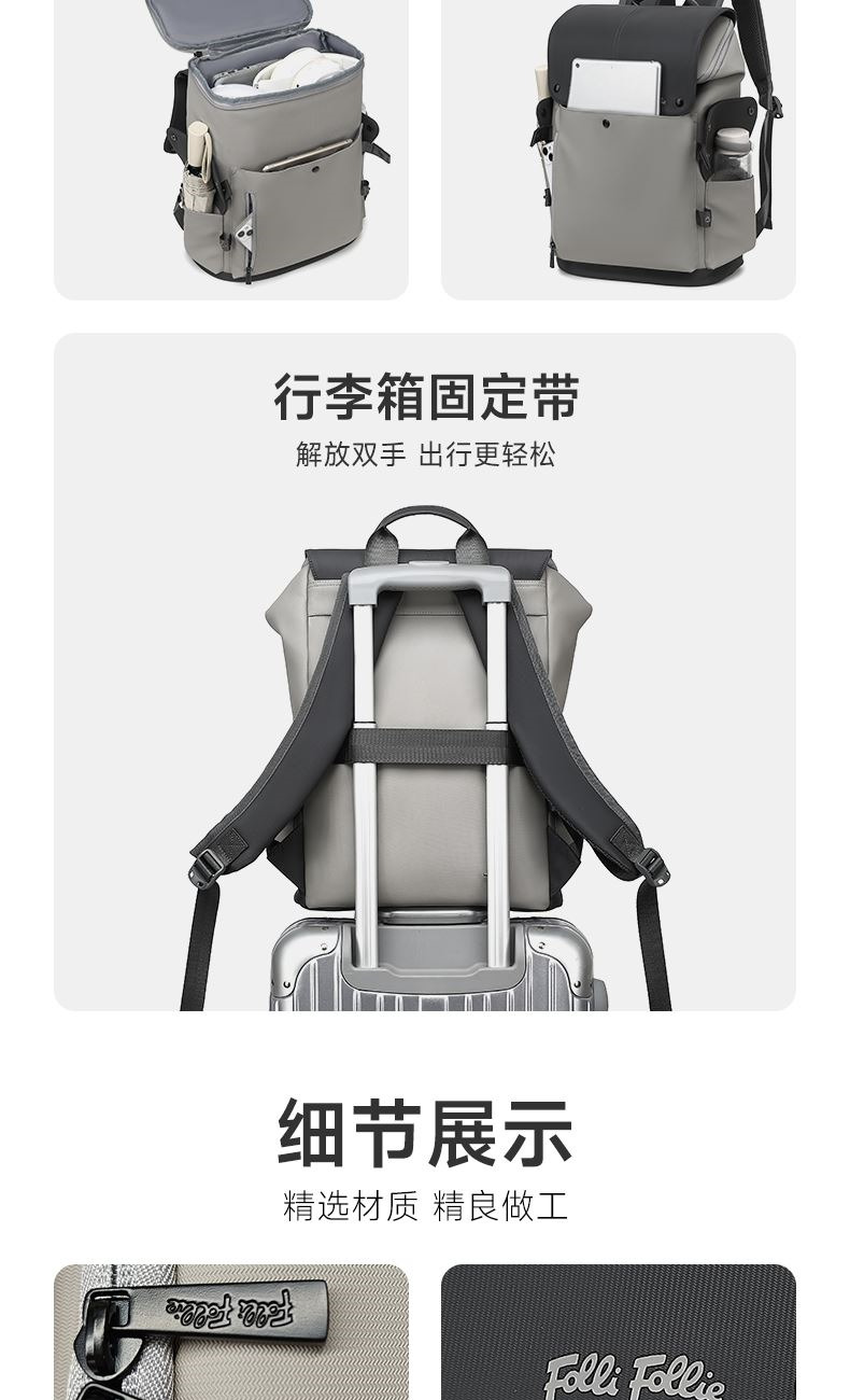 結(jié)構(gòu):1主倉(帶電腦倉)、1前拉鏈袋、2側(cè)袋、2內(nèi)插袋、1內(nèi)拉鏈袋