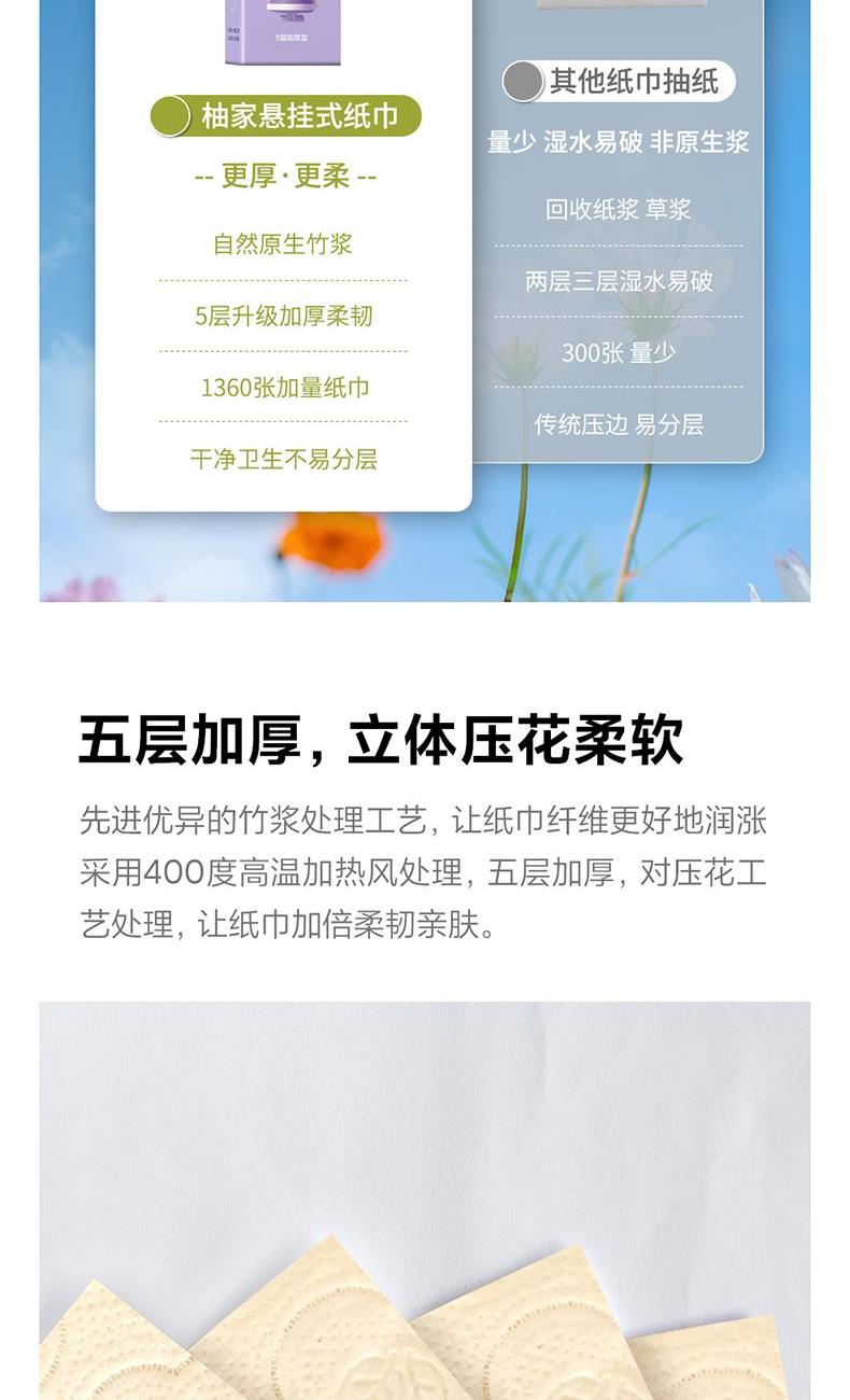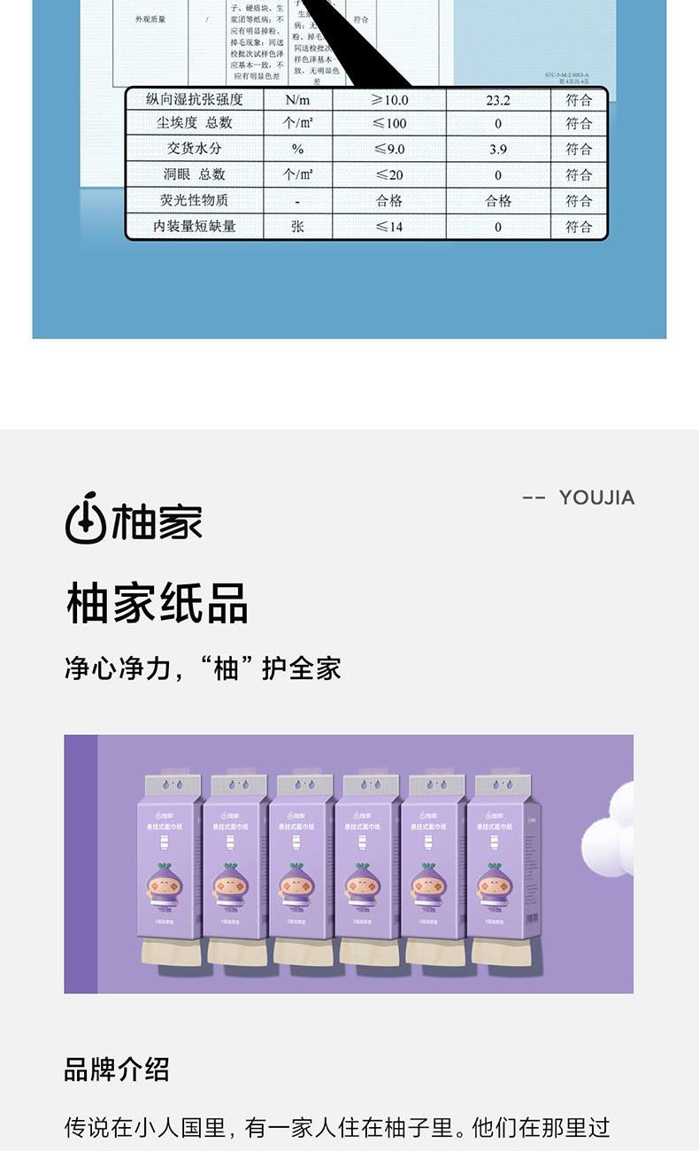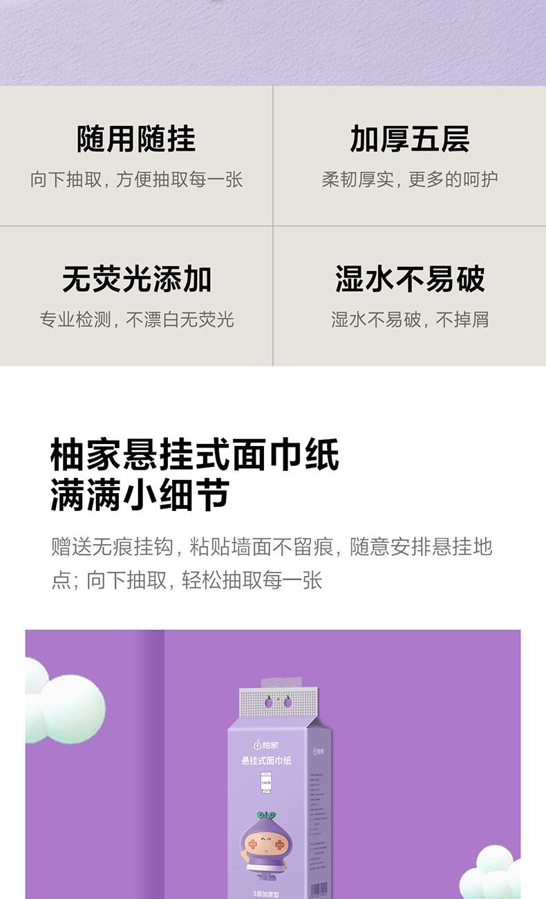 產(chǎn)品型號:515595 紫色 產(chǎn)品規(guī)格:170*138mm/張,5層加厚,272抽/提 產(chǎn)品重量:0.4kg左右 主要原料:原生竹漿 產(chǎn)品保質期:3年
