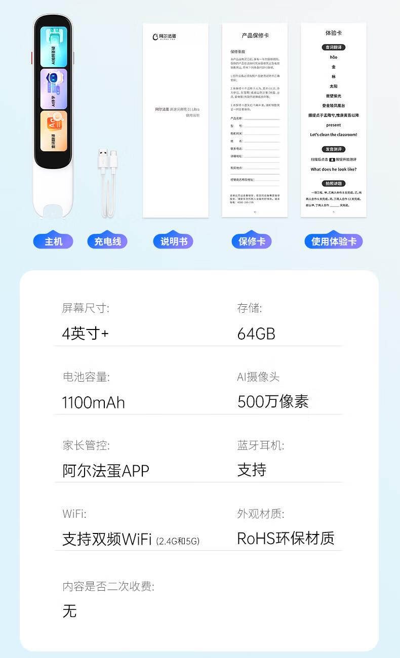 顏色:白色 屏幕尺寸:4英寸 內(nèi)存:64G 詞匯量:7200萬(wàn)+ WiFi:2.4G+5G雙頻WiFi 電池容量:1100mA 外觀材質(zhì):RoHS環(huán)保材質(zhì) 家長(zhǎng)管控:阿爾法蛋APP(無(wú)二次收費(fèi)內(nèi)容)