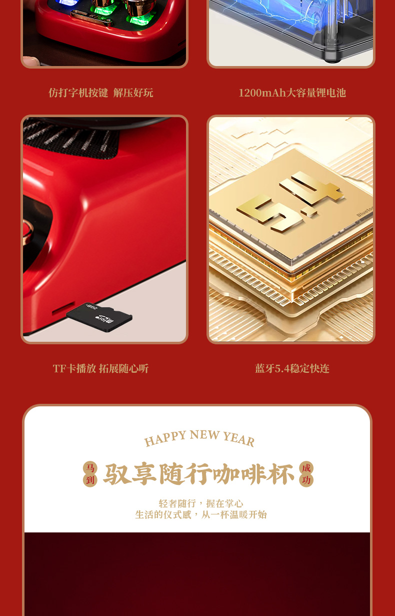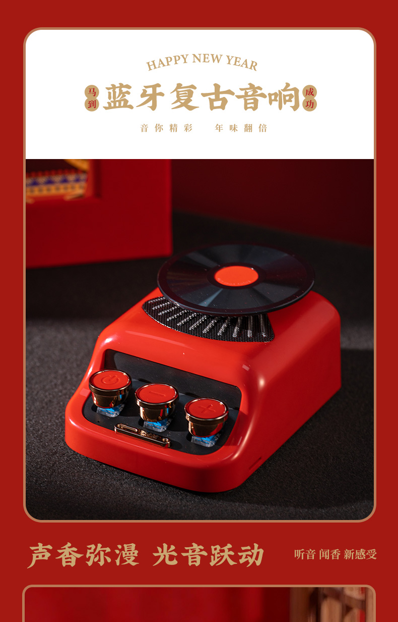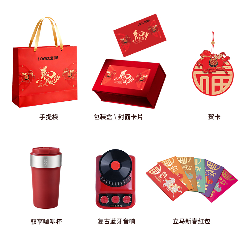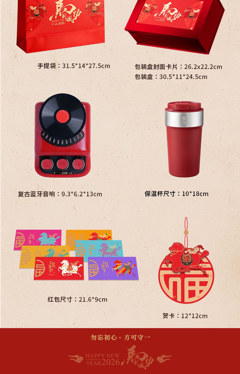 1、紅色咖啡杯:510ML 內(nèi)膽一體成型304鋼 2、好運復(fù)古藍牙音箱:藍牙、氛圍燈、趣味按鍵 3、新年紅包*6:開啟新年好運程 4、絨面禮盒:日歷功能、收納功能 用完不閑置 注:禮盒可專版定制畫面