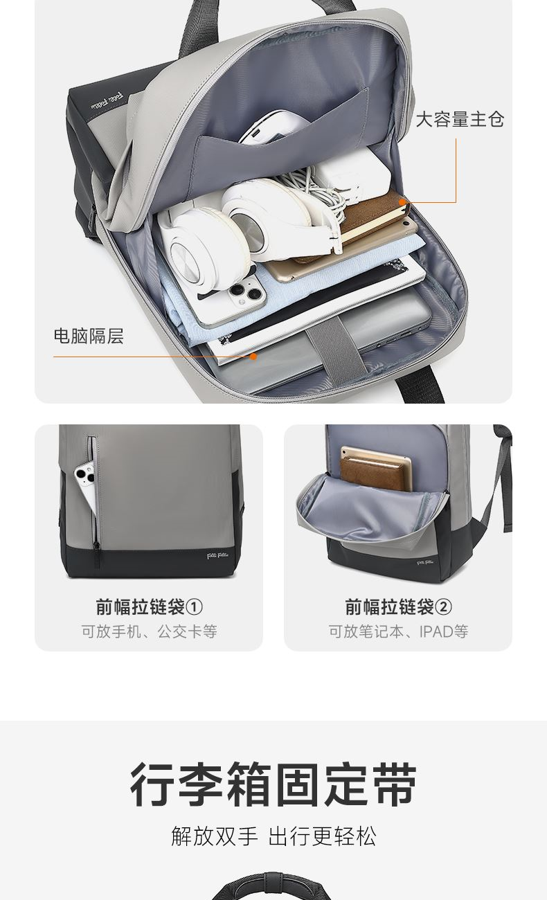 結(jié)構(gòu):1主倉(cāng)(帶電腦倉(cāng))、1副倉(cāng)、1前拉鏈袋、1內(nèi)插袋、1內(nèi)拉鏈袋