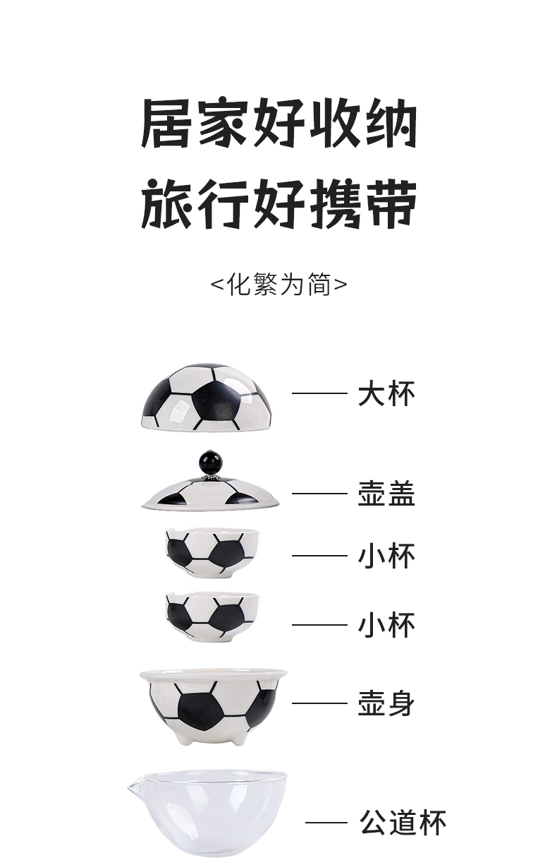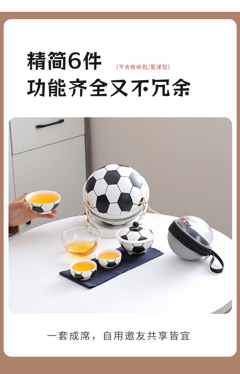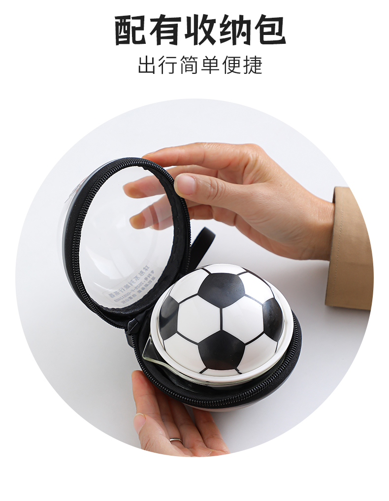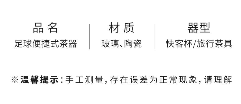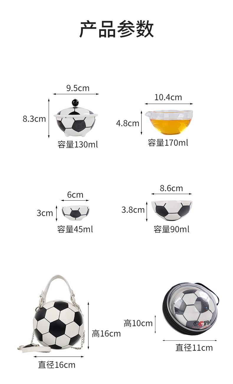 壺:9.5*8.3厘米 130ml 主人杯:8.6*3.8厘米90ml 品茗杯:6*3厘米45ml 造型形象生動(dòng),精致便攜,天然礦物釉,高溫?zé)茻o鉛鎘 ?;@球,足球愛好者的禮品。