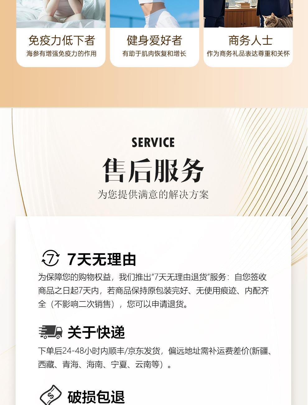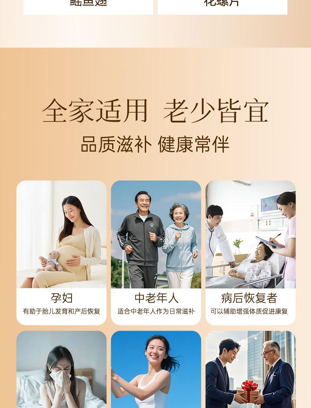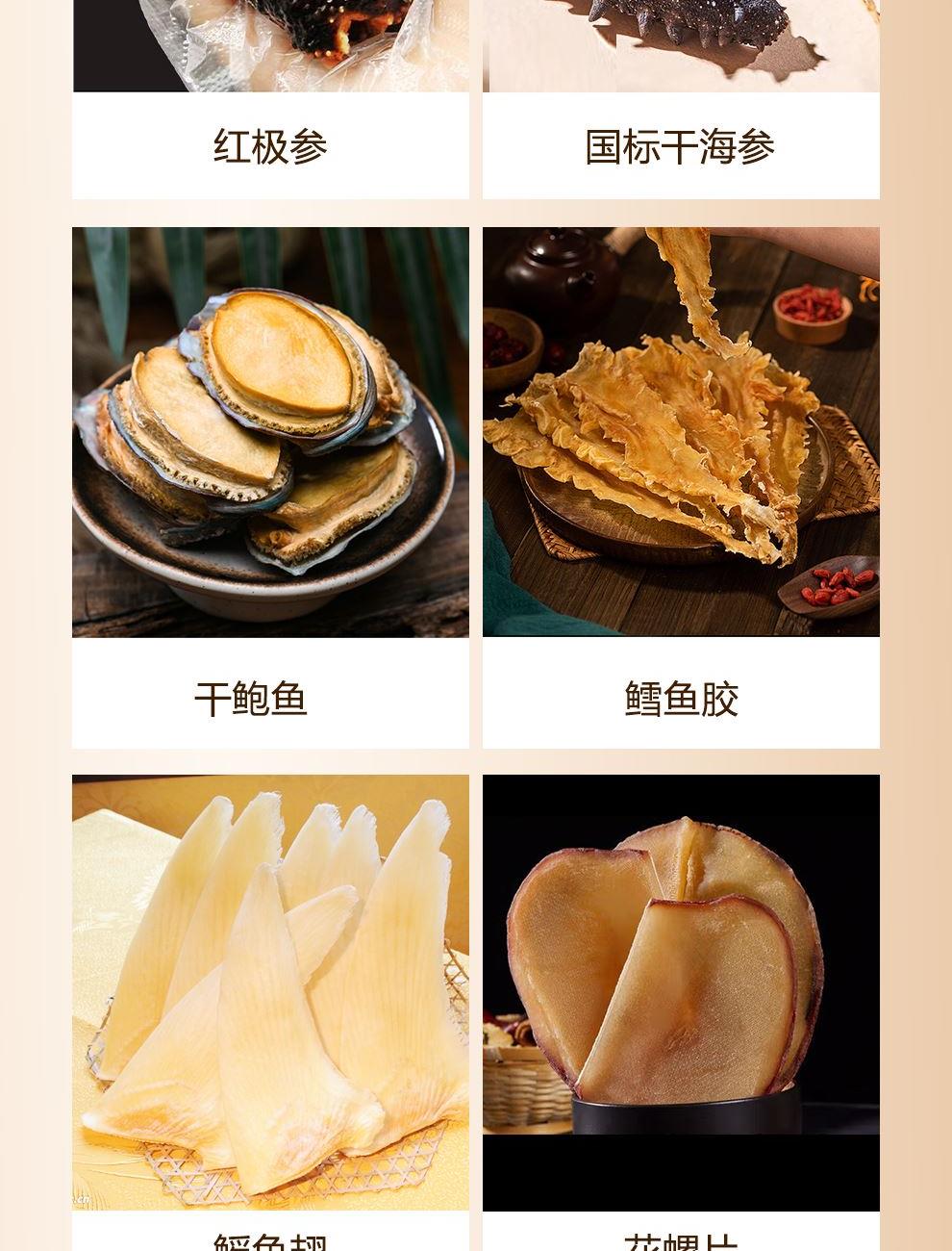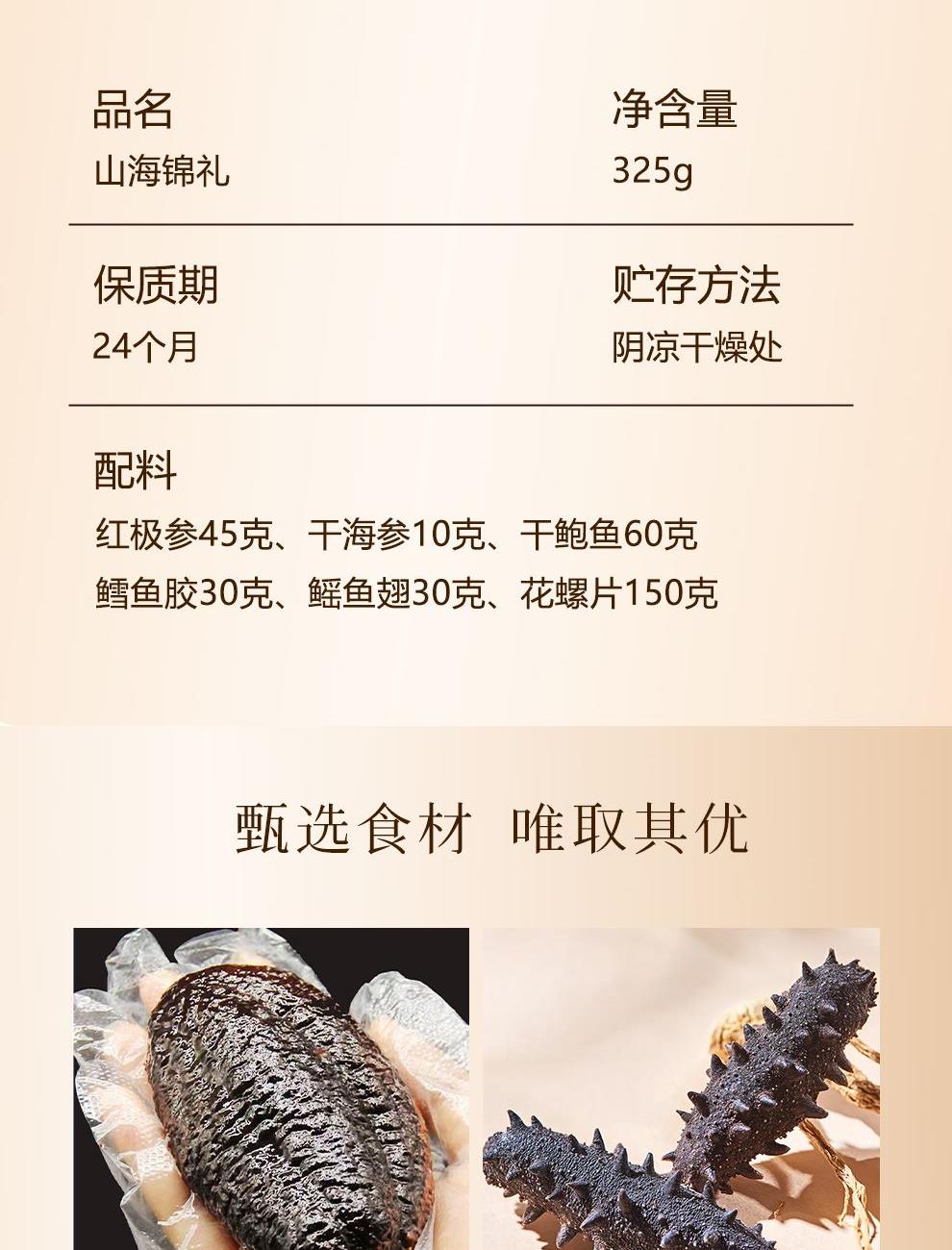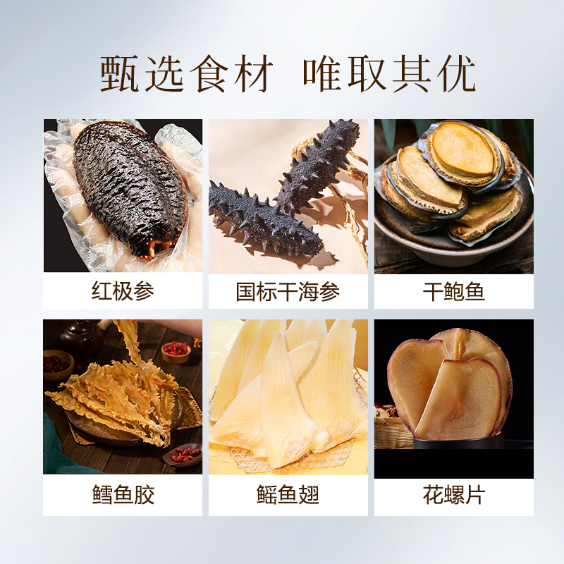 規(guī)格:紅極參45克、干海參10克、干鮑魚60克、鱈魚膠30克、鰩魚翅30克、花螺片150克 賣點: ? 珍貴食材 精挑細選 ? 傳統(tǒng)滋補 現(xiàn)代工藝 ? 高貴禮贈 彰顯品味 ? 四季養(yǎng)生 倍添活力 一份禮盒,六重滋養(yǎng),百分誠意??