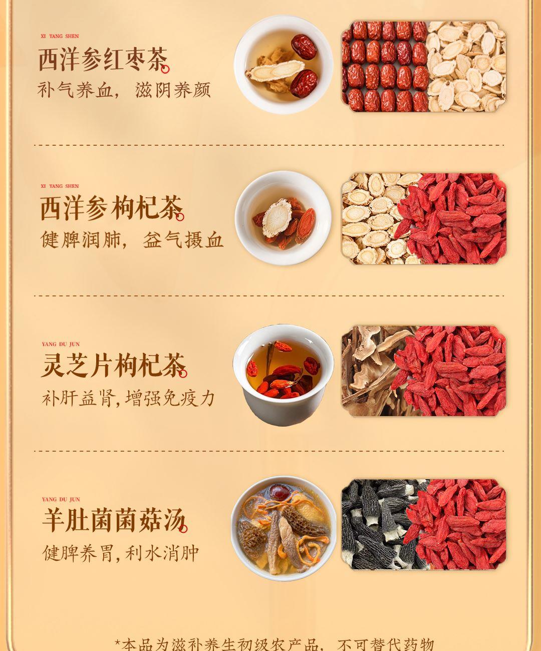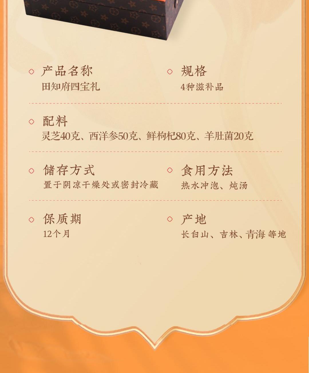 產(chǎn)品配置:西洋參50g、靈芝片40g、鮮枸杞80g、羊肚菌20g 商品規(guī)格:190g/盒 產(chǎn)品尺寸:305*305*97mm 保質(zhì)期:12個月 截單時間:每天16:00 合作物流:中通/郵政/京東/德邦/順豐 發(fā) 貨 地:福建省福州市 稅收編碼:101011213 發(fā)票稅率:9% 田知府榮獲國賓禮榮譽稱號,京東自營銷量好評1w+,源頭工廠,支持項目授權(quán),項目保護
