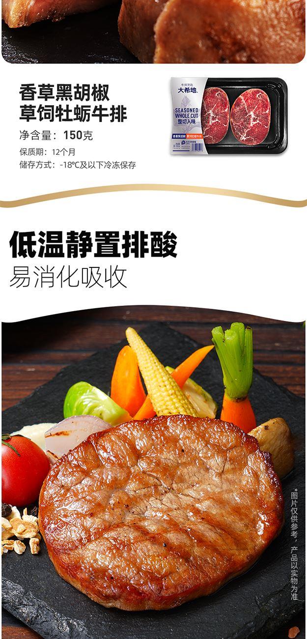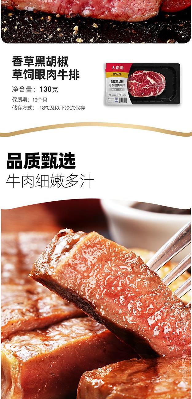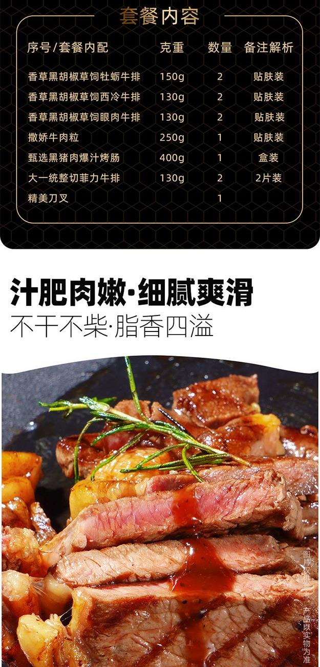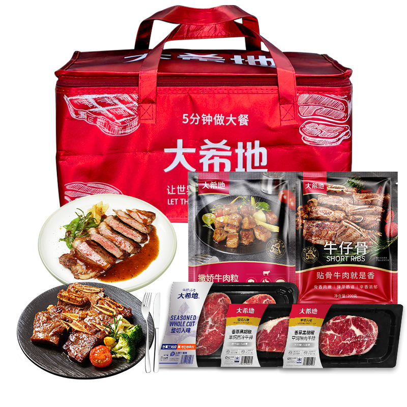 DXDSW-03 大希地商務(wù)禮599型 大希地 香草黑胡椒草飼牡蠣牛排150g貼膚裝(2片)*2 大希地 香草黑胡椒草飼西冷牛排130g*2 大希地 香草黑胡椒草飼眼肉牛排130g*2 大一統(tǒng)整切菲力牛排130g(2片袋裝)*2 大希地 撒嬌牛肉粒250g*1 大希地甄選黑豬肉爆汁烤腸400g(盒裝)*1 精美刀叉一副