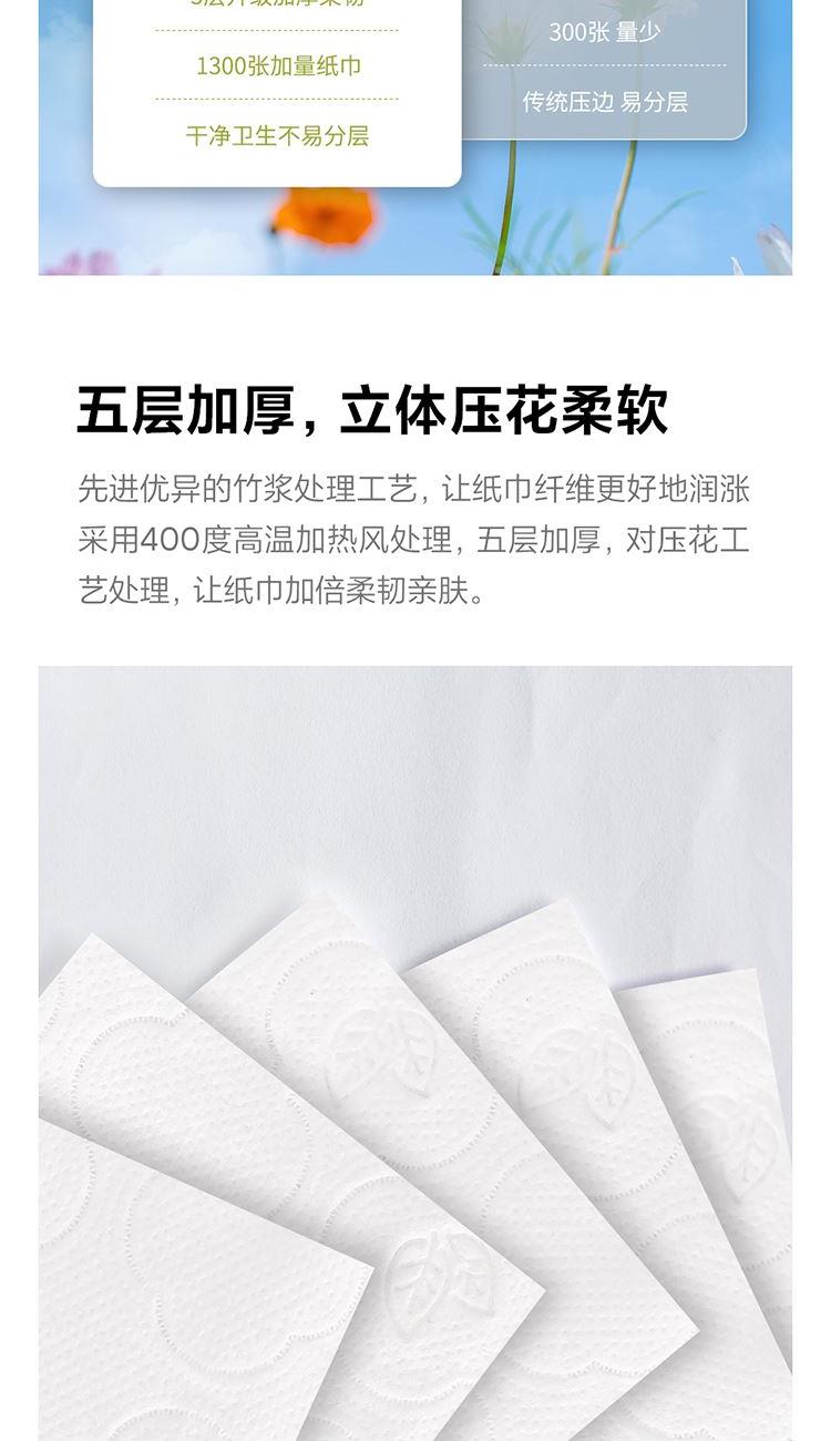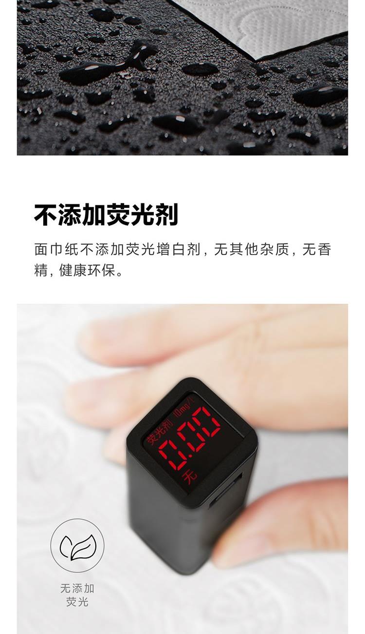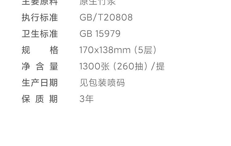 產(chǎn)品型號:533772 綠色 產(chǎn)品規(guī)格:170*138mm/張,5層加厚,260抽/提 產(chǎn)品重量:0.4kg左右 主要原料:原生竹漿 產(chǎn)品保質(zhì)期:3年