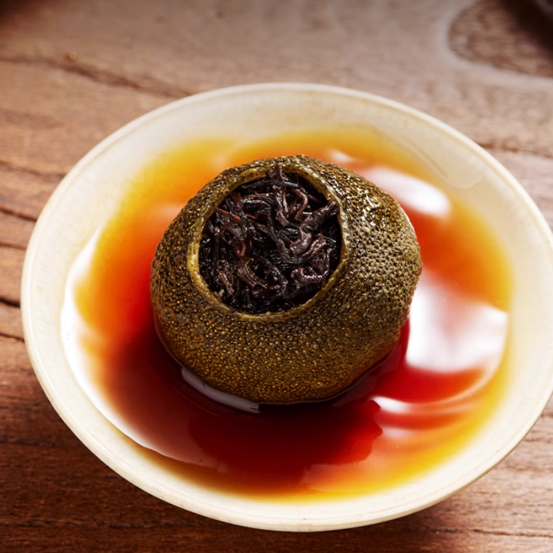 經(jīng)“半生曬+低溫烘焙”傳統(tǒng)工藝融合,柑皮油胞飽滿、果香清甜,熟普茶湯醇厚順滑、回甘持久,二者在陳化中自然交融,形成柑香與茶韻交織的獨特風味;