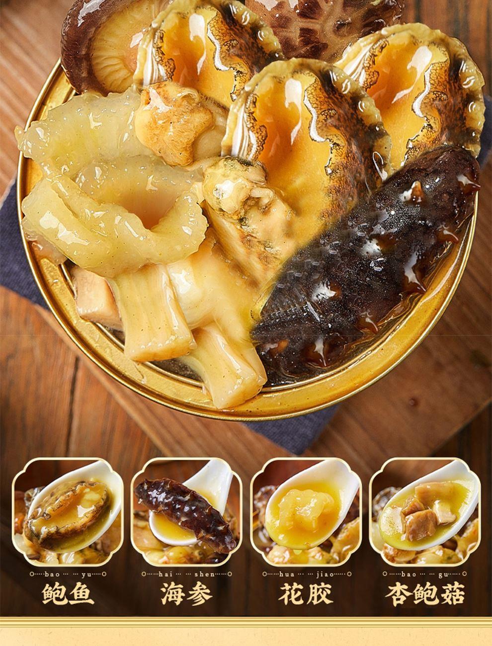 - 營養(yǎng)豐富:由于含有多種海味珍品和滋補(bǔ)食材,營養(yǎng)成分十分豐富。含有大量的蛋白質(zhì)、多種維生素、礦物質(zhì)和膠原蛋白等,是一種營養(yǎng)均衡的滋補(bǔ)佳品。