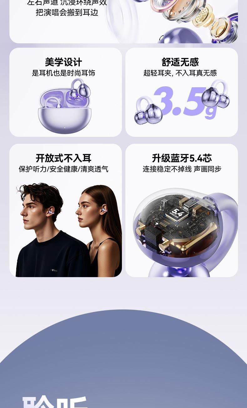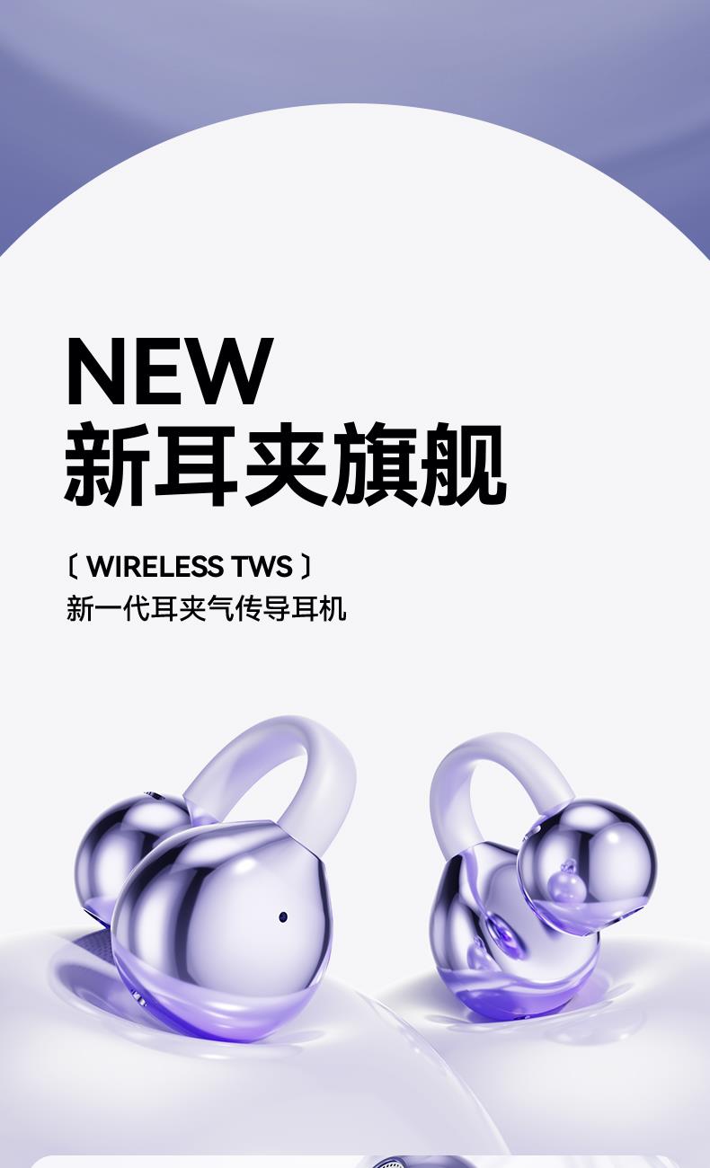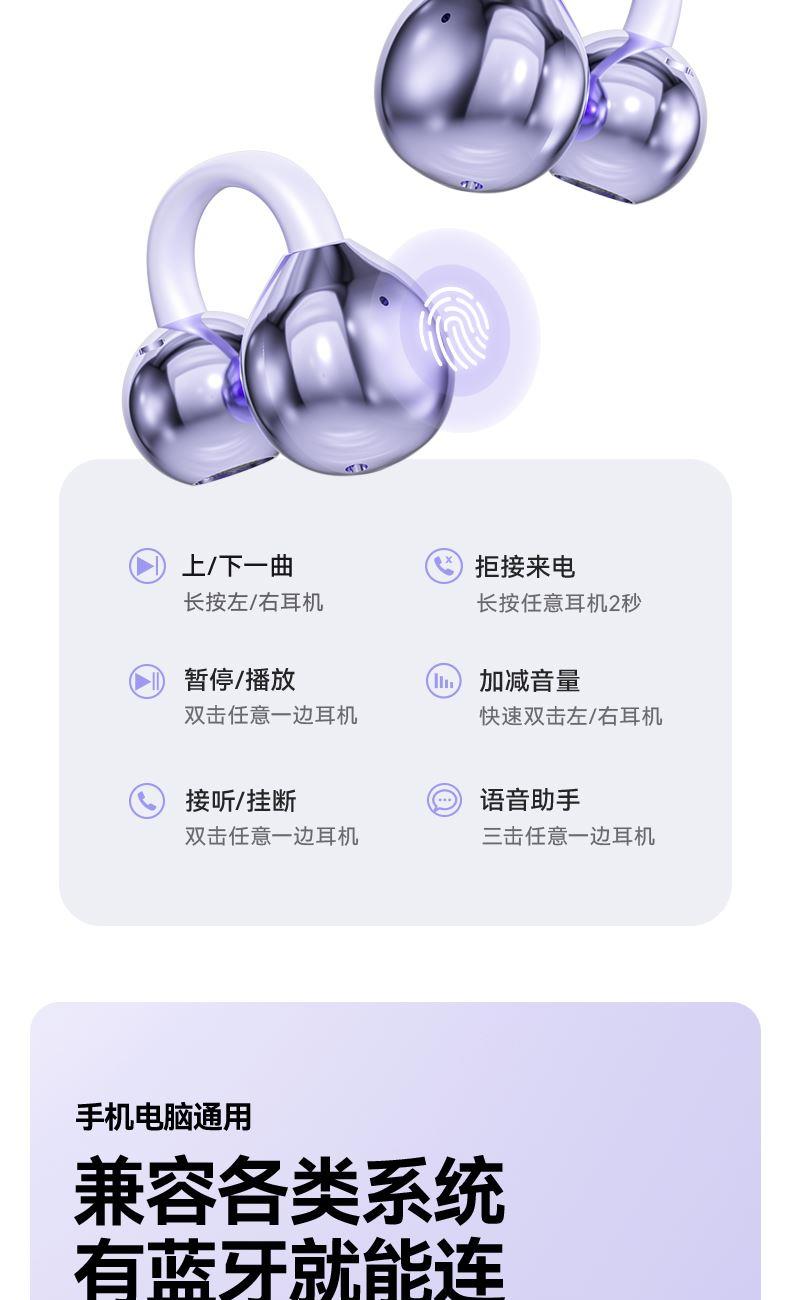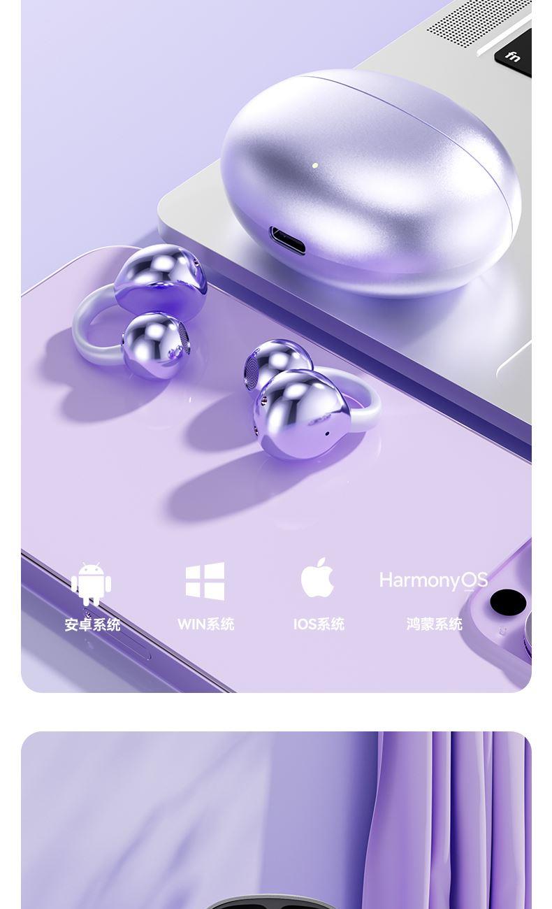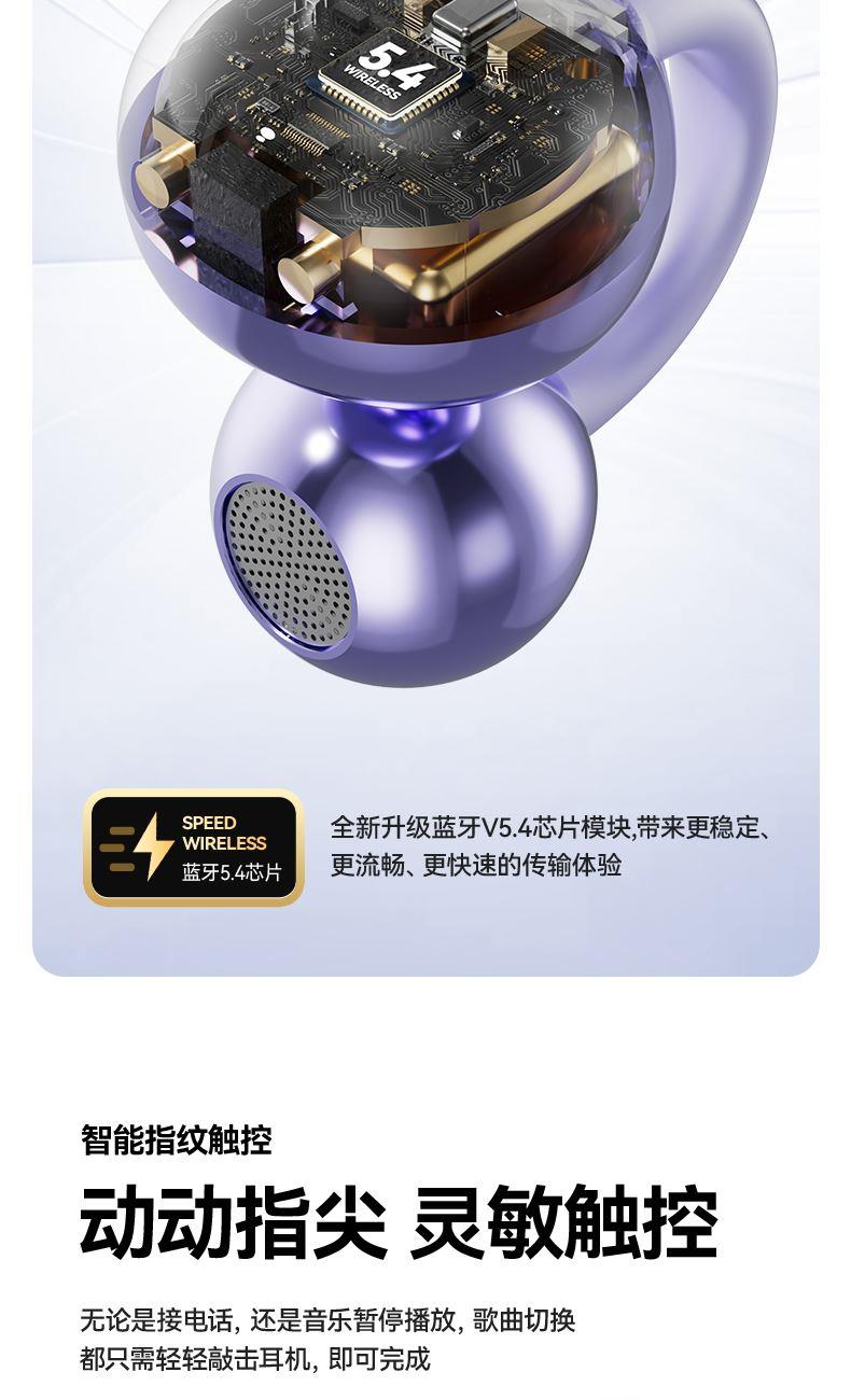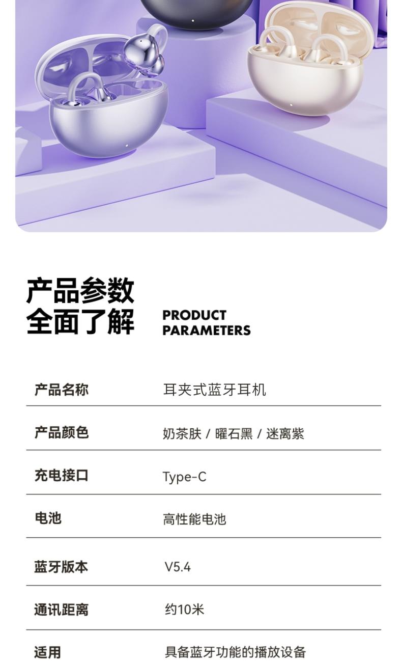 產(chǎn)品規(guī)格:6.4*5.1*3cm 產(chǎn)品凈重:48g 材 料:ABS 產(chǎn)品顏色:黑色 紫色 膚色 使用時間:2-3小時 連接距離:10m 耳機容量:30mAh 電池容量:230mAh 充電電壓:5V 產(chǎn)品特點: 智能指紋觸控 觸控隨心 超輕耳夾 不入耳 真無感 人體工學設(shè)計 三角穩(wěn)固不掉 藍牙5.4強大內(nèi)芯 穩(wěn)定不斷連