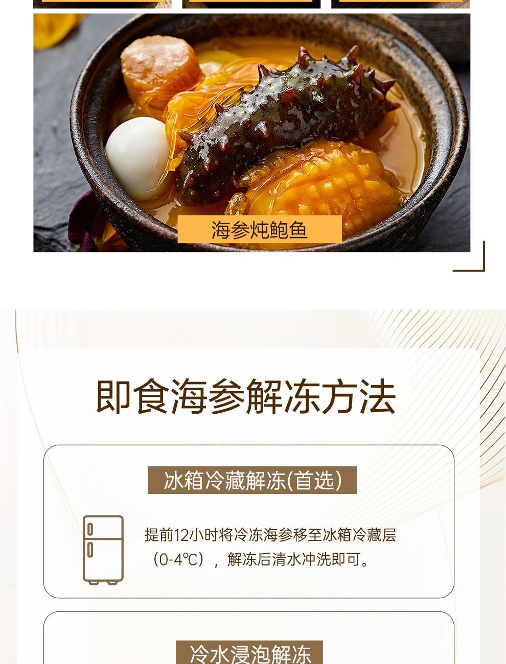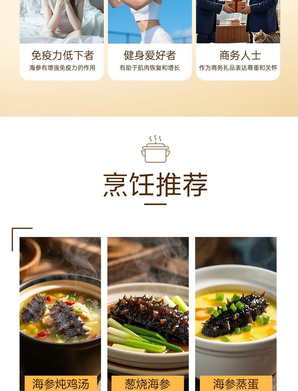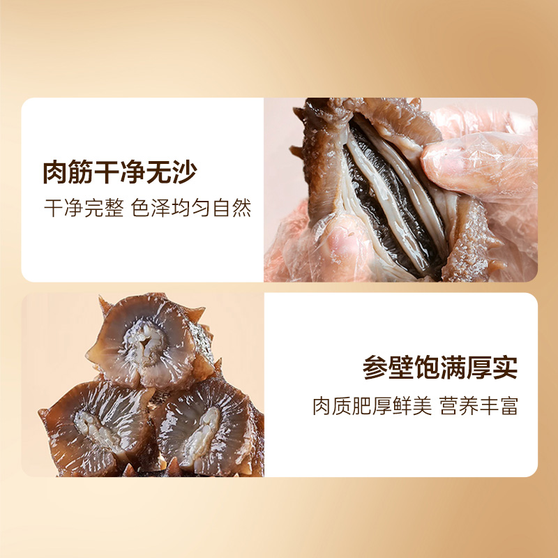 規(guī)格:500克/(8-12頭) 賣點: 京潤堂大連即食海參選自黃金海域北緯39°的遼參,海域環(huán)境好,水質(zhì)清潔、溫度適宜,海參品質(zhì)高。選取參齡5年以上的遼參,富含多種營養(yǎng)成分,如高蛋白含量,海參粘多糖, 維生素和多種微量元素,具有調(diào)節(jié)體質(zhì)、抗疲勞、抗腫瘤等潛在功效。