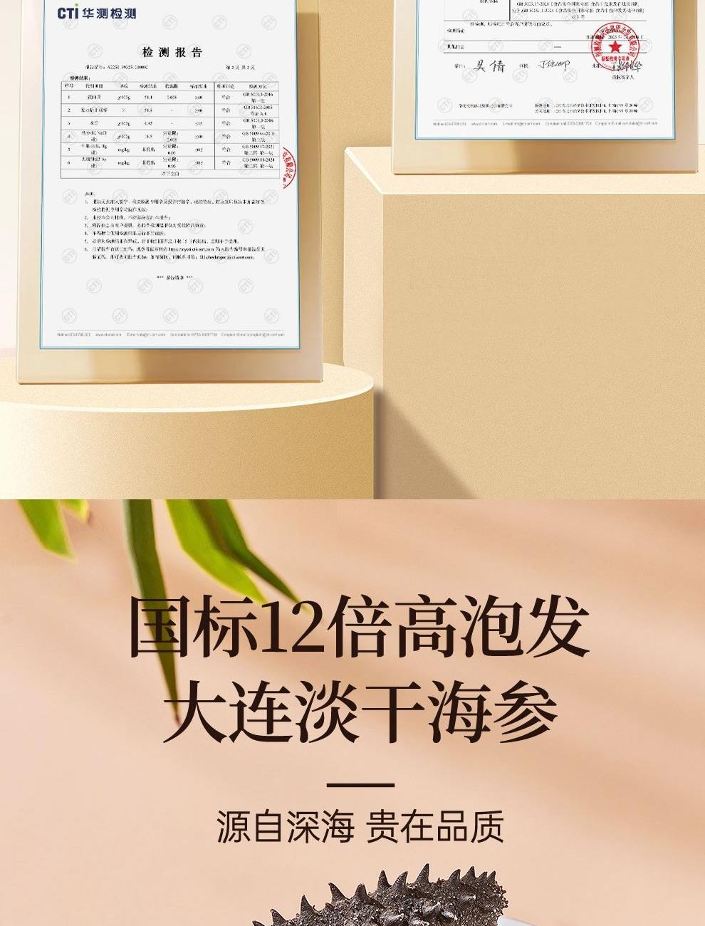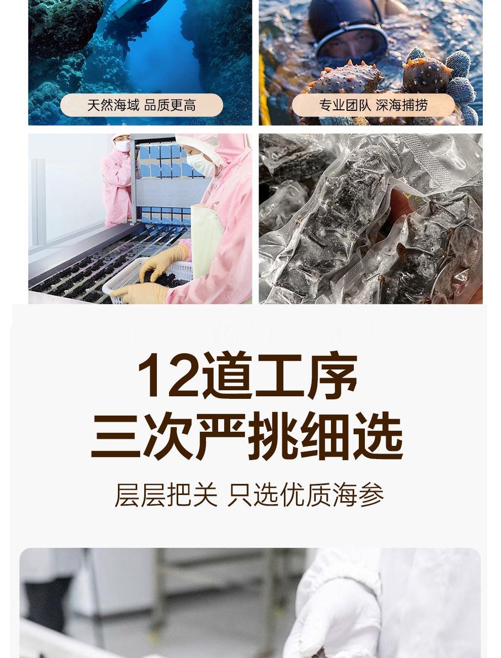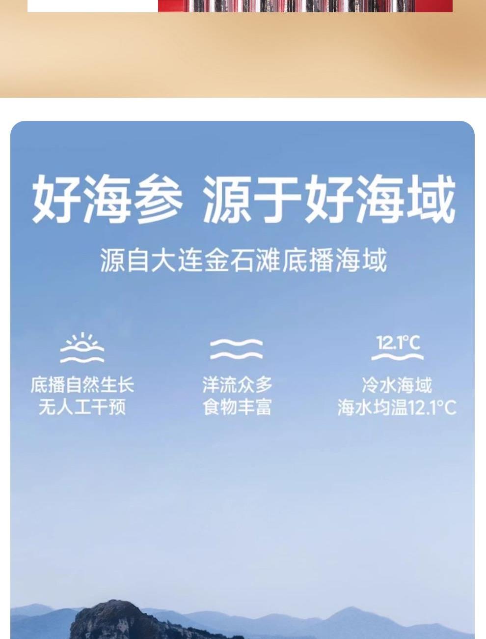 規(guī)格:42克/盒(10頭) 賣點(diǎn):大連是我國海參的重要產(chǎn)地之一,嚴(yán)格的海洋生態(tài)管控和養(yǎng)殖標(biāo)準(zhǔn)也保證了海參的穩(wěn)定質(zhì)量。淡干工藝保留了海參的營養(yǎng)成分。通過自然晾曬或者低溫烘干,減少了海參營養(yǎng)在加工過程中的流失。