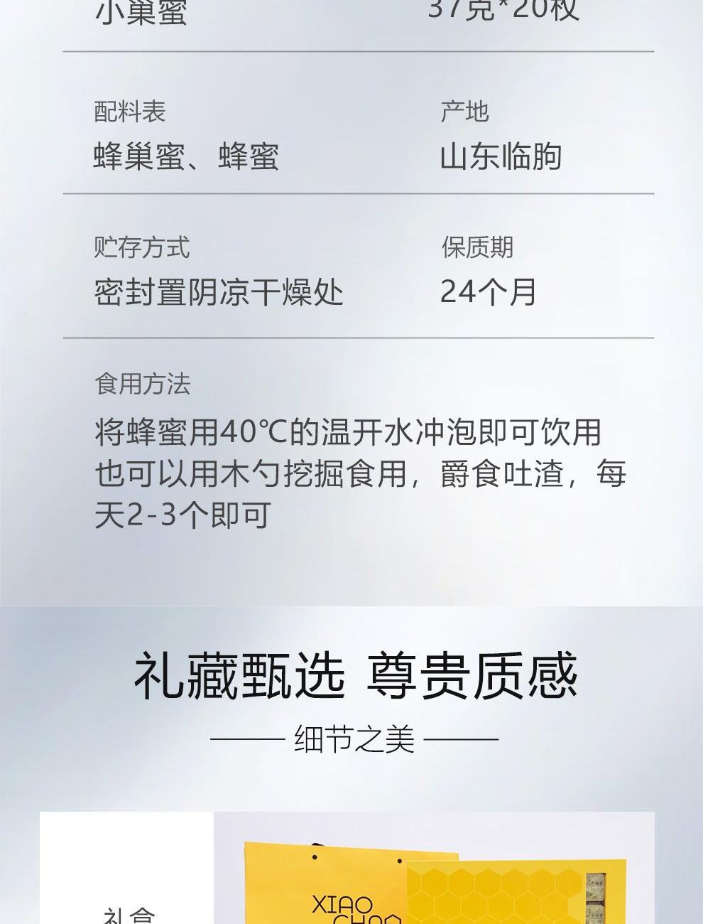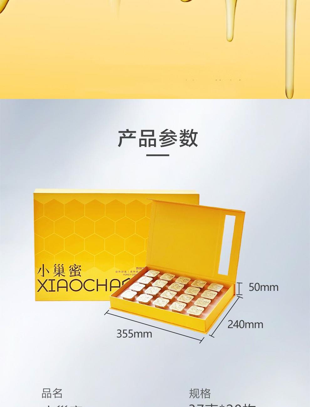 規(guī)格:720克(30克*24顆) 賣點(diǎn): 小巢蜜核心的賣點(diǎn)之一是其近乎零加工的生產(chǎn)工藝。與普通分離蜜相比,巢蜜是蜜蜂自然釀制成熟并封上蠟蓋的蜜脾,未經(jīng)人為的分離和加工,保留了蜂蜜的原始狀態(tài)。這種工藝極大程度避免了加工過程中營(yíng)養(yǎng)成分的流失,特別是對(duì)溫度敏感的生物酶類物質(zhì)。