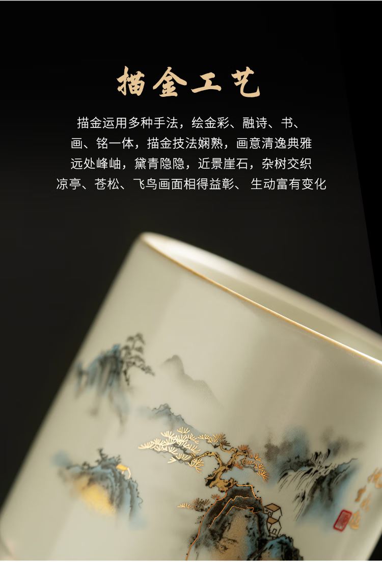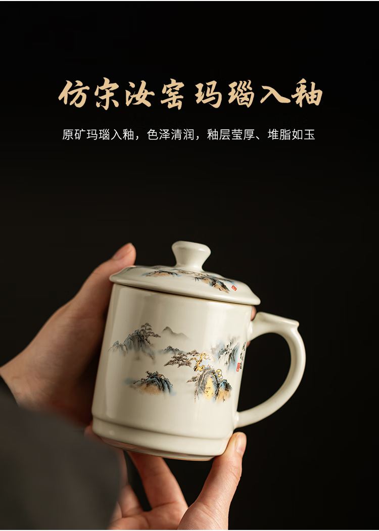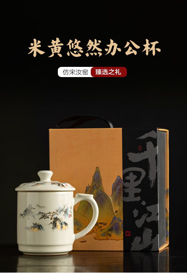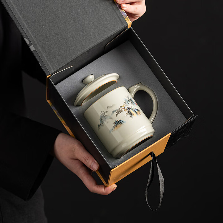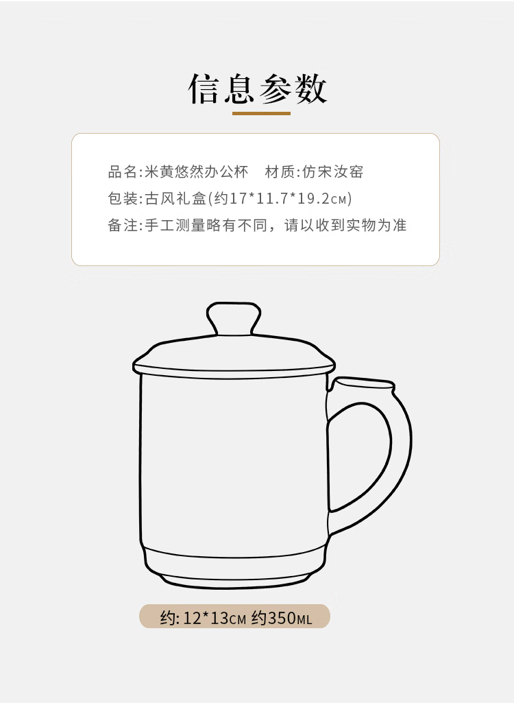 材質(zhì):陶瓷汝窯 個(gè)數(shù):1個(gè) 工藝:高溫?zé)?烤花 風(fēng)格:中式 容量:350ml 尺寸:茶杯12*13cm;禮盒19.2*17*11.7cm 配置清單:茶杯*1 禮盒*1 仿宋汝窯 質(zhì)感細(xì)膩 色澤清潤 開片紋路 描金工藝 古色古香 國風(fēng)禮盒 經(jīng)典器型 送禮實(shí)用