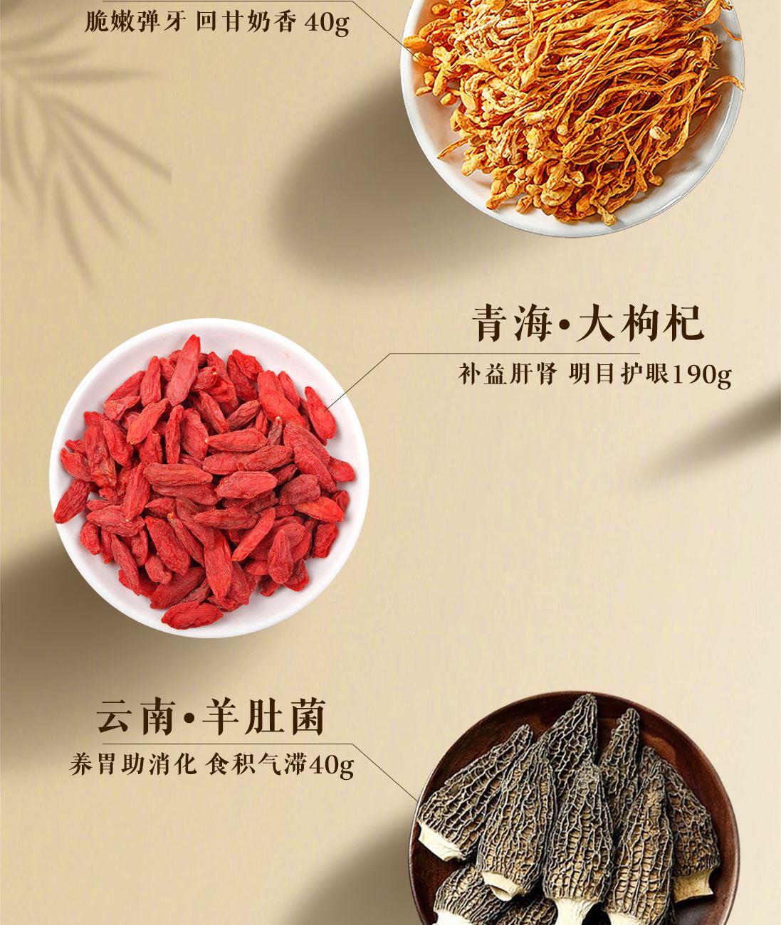 配置:靈芝片40g、鹿茸菇40g、西洋參50g、羊肚菌30g、蟲草花40g、青海大枸杞190g 商品規(guī)格:390g/盒 產(chǎn)品尺寸:450*230*90mm 保質(zhì)期:12個(gè)月 京東自營銷量好評(píng)1w+,源頭工廠,支持項(xiàng)目授權(quán),項(xiàng)目保護(hù)
