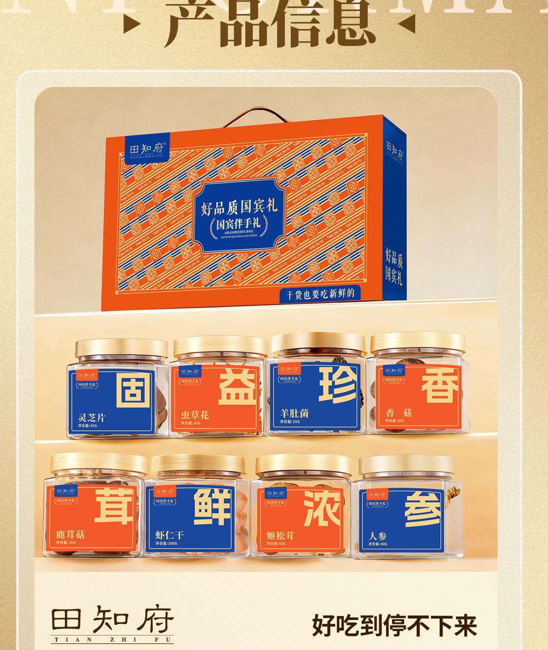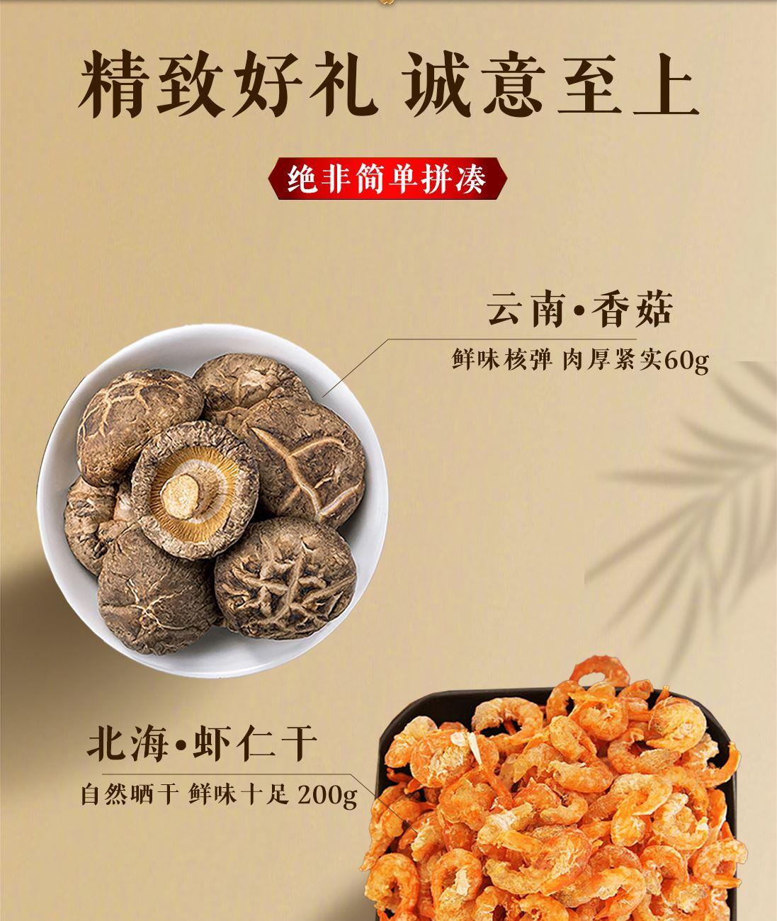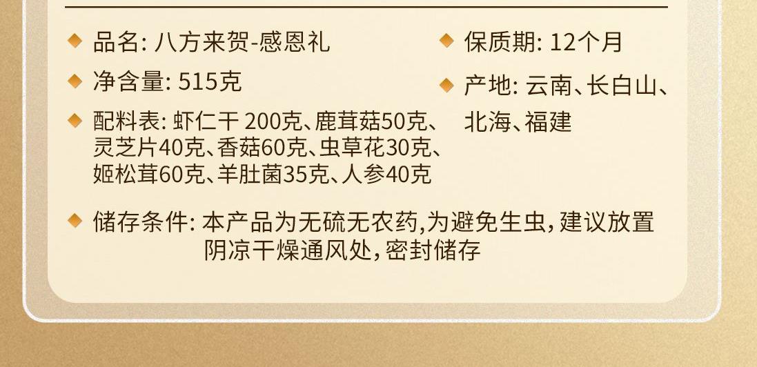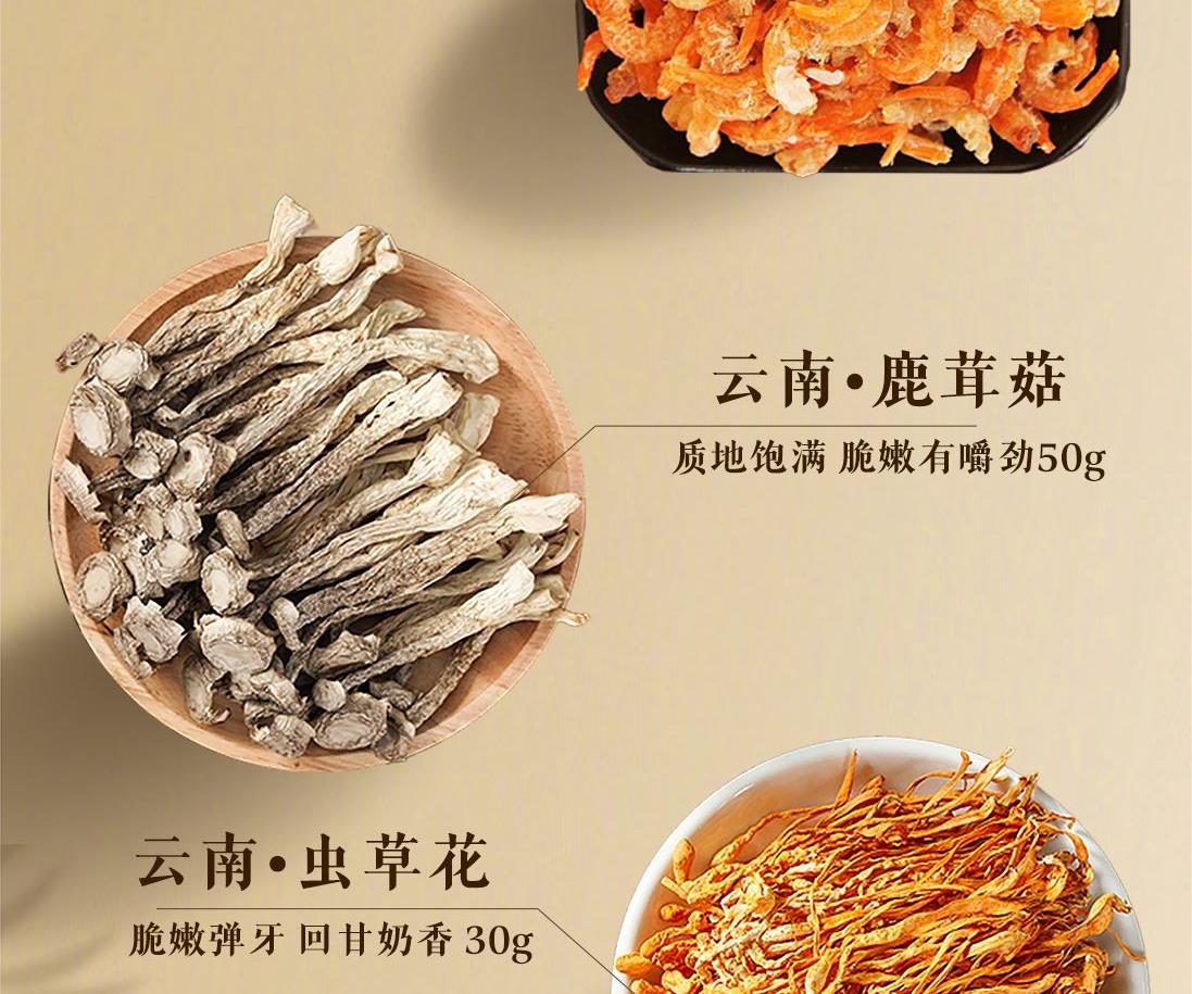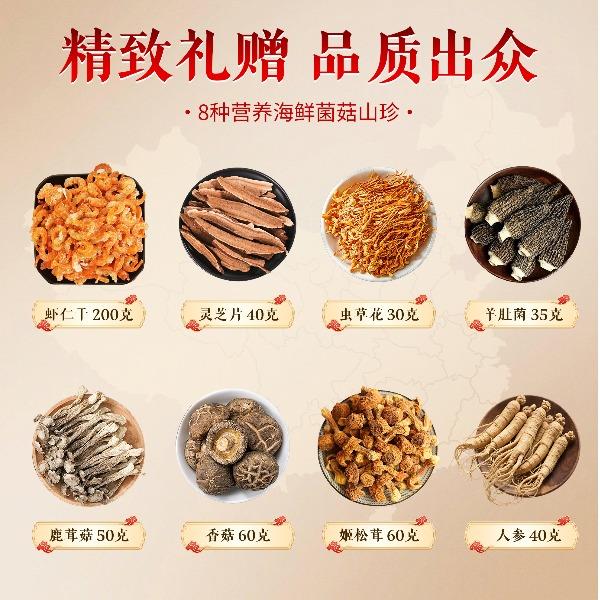配置:蝦仁干 200g、鹿茸菇 50g、靈芝片40g、香菇60g、蟲草花30g、姬松茸60g、羊肚菌35g、人參40g 商品規(guī)格:515g/盒 產(chǎn)品尺寸:450*250*125mm 保質(zhì)期:12個月 京東自營銷量好評1w+,源頭工廠,支持項目授權(quán),項目保護(hù)
