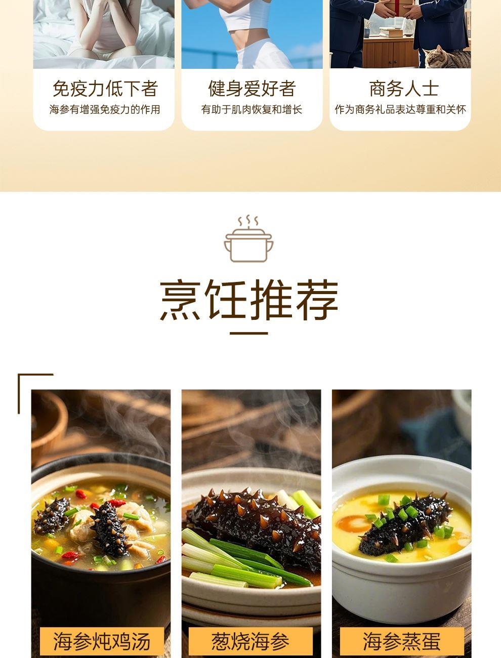 - 淡干海參含水量低,使它能夠長(zhǎng)時(shí)間保存,而且重量輕,便于運(yùn)輸和儲(chǔ)存。