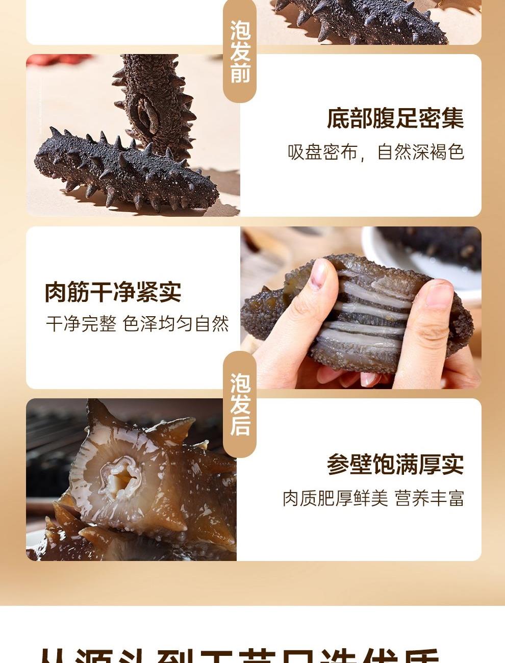 - 大連北緯39°海域水質(zhì)清澈、冰冷且富含營(yíng)養(yǎng)物質(zhì),得天獨(dú)厚的條件,產(chǎn)出的海參品質(zhì)優(yōu)良。