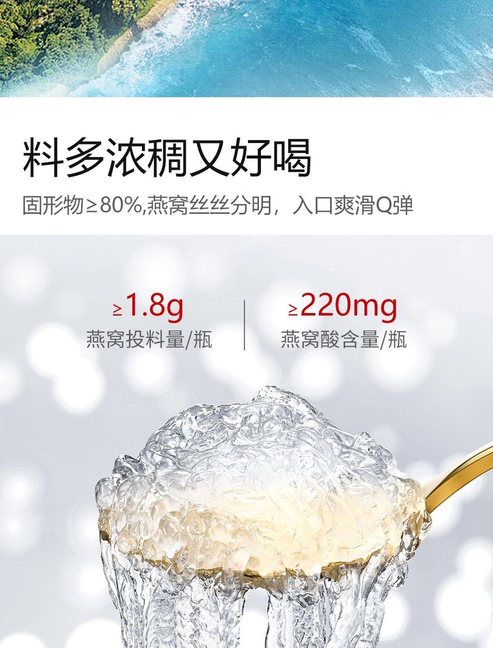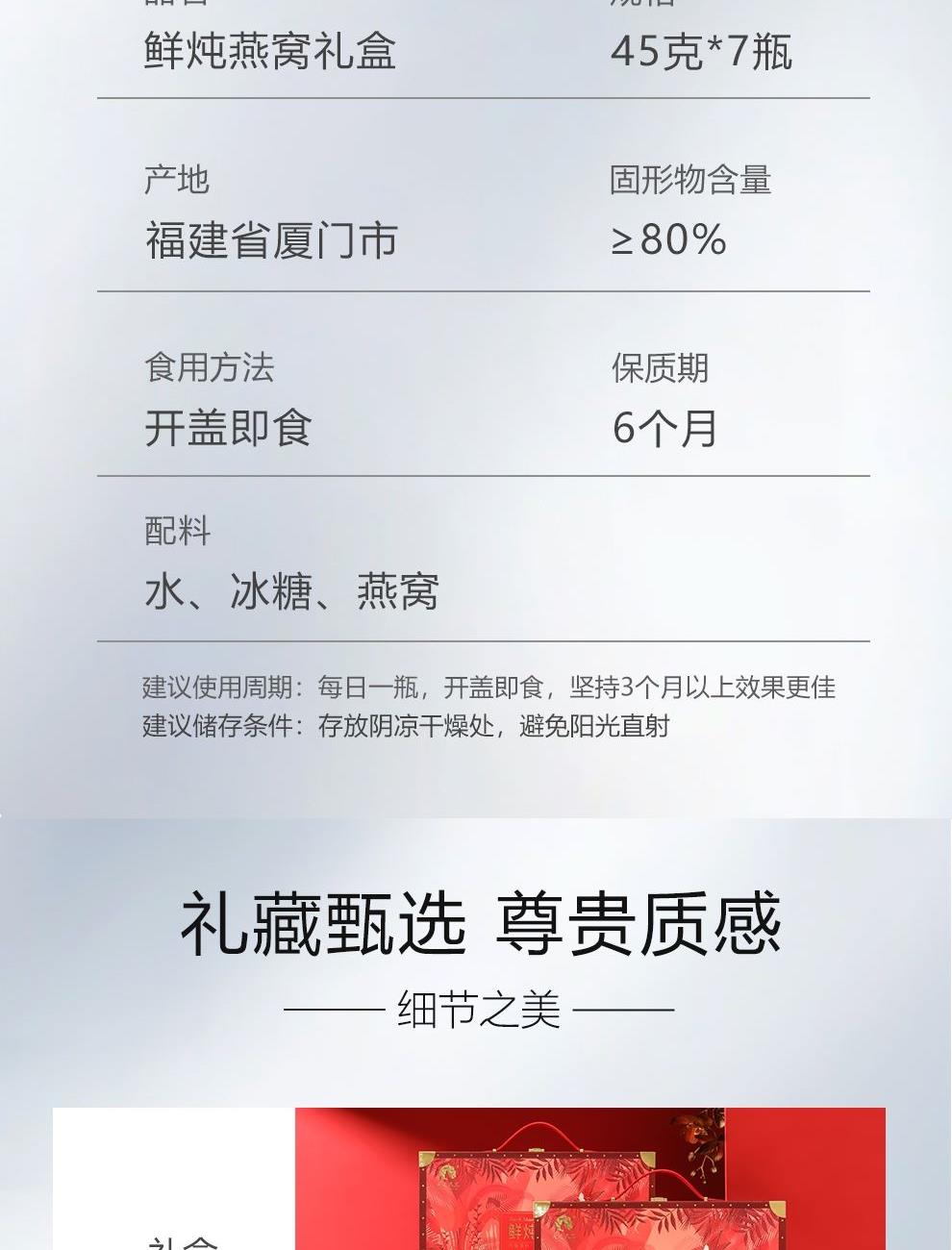 規(guī)格:315克(45克*7瓶)、燕窩固形物不低于85%、每瓶添加干燕窩:1.8克