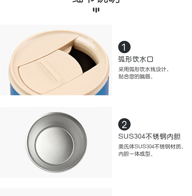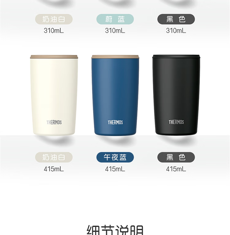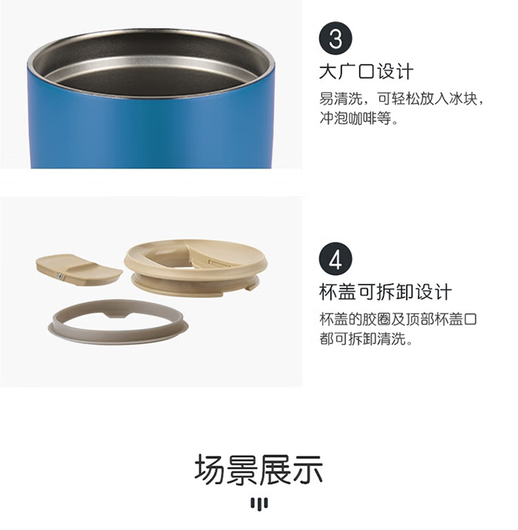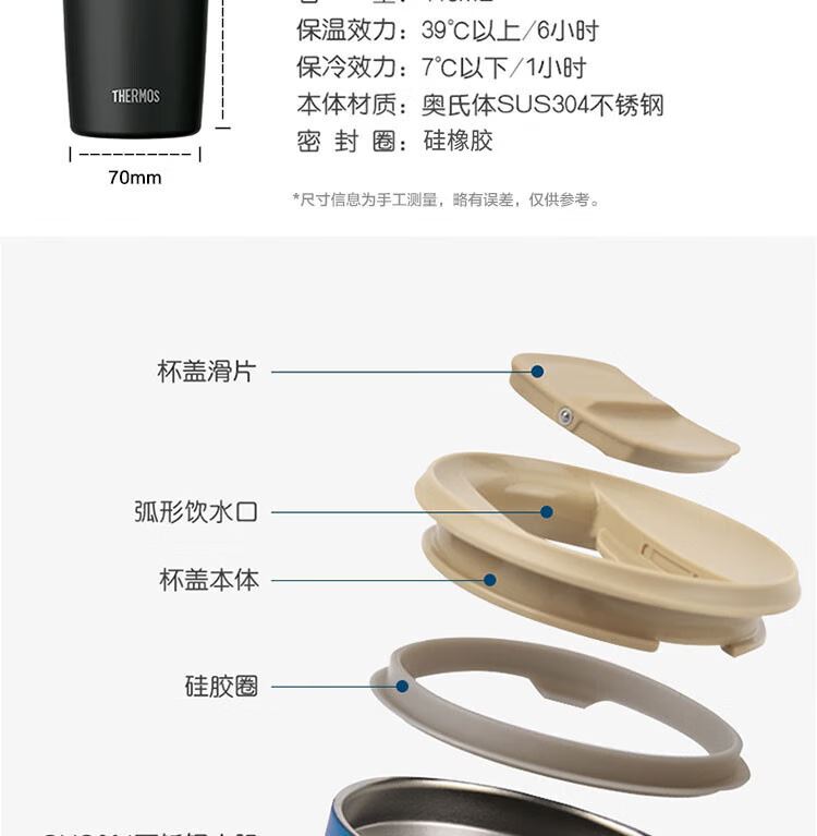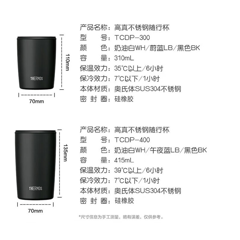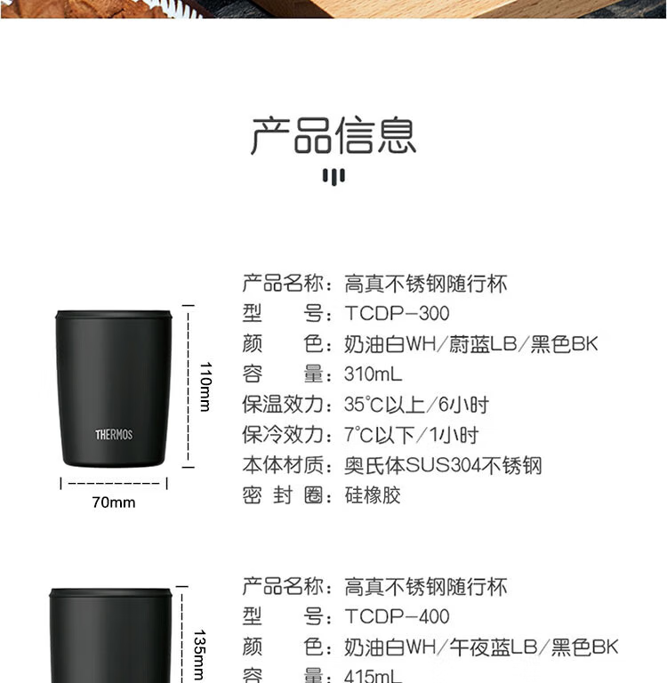 型 號:TCDP-300 顏 色:WH奶油白 LB蔚藍(lán) BK黑色 容 量:310ml 類 型:咖啡杯 杯身材質(zhì):304不銹鋼 杯蓋材質(zhì):食品級PP 密封圈:硅橡膠 保溫效力:35℃以上/6小時(shí) 保冷效力:11℃以下/6小時(shí)