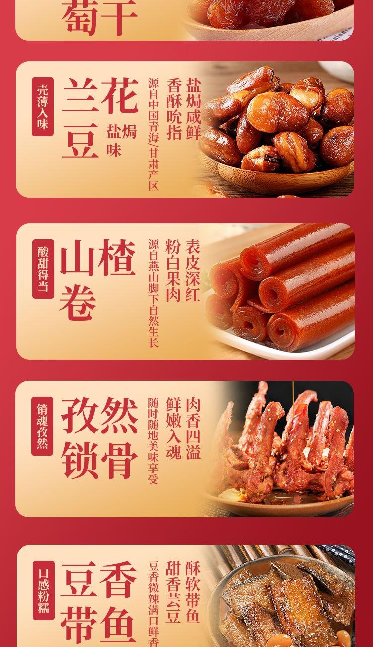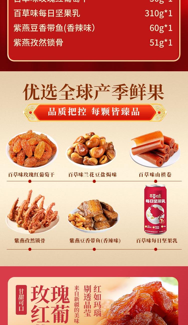 【百草味】山楂228g*1 【百草味】蘭花豆鹽焗味70g*1 【百草味】玫瑰紅葡萄干50g*1 【百草味】每日?qǐng)?jiān)果乳 310g*1 【紫燕】豆香帶魚(yú)(香辣味)60g*1 【紫燕】孜然鎖骨51g*1 禮盒+組裝+外盒