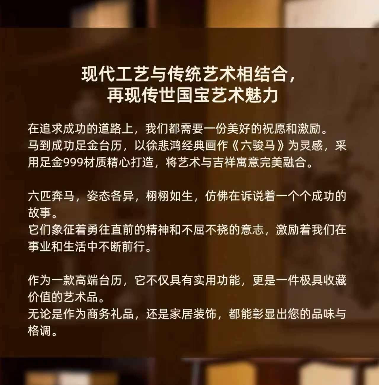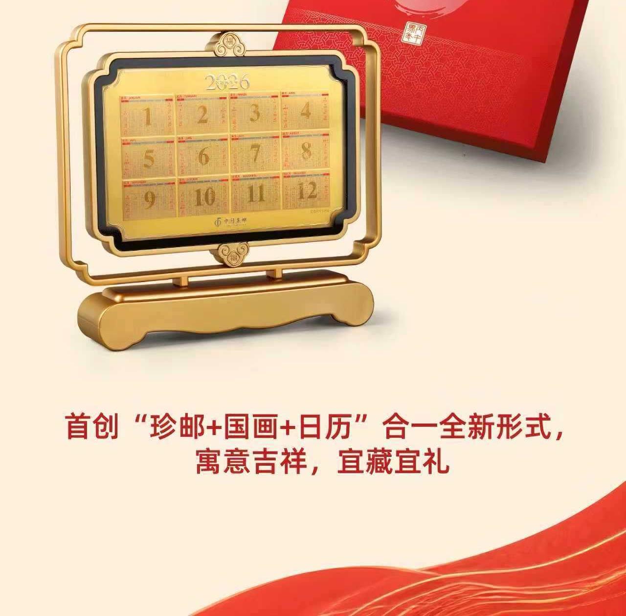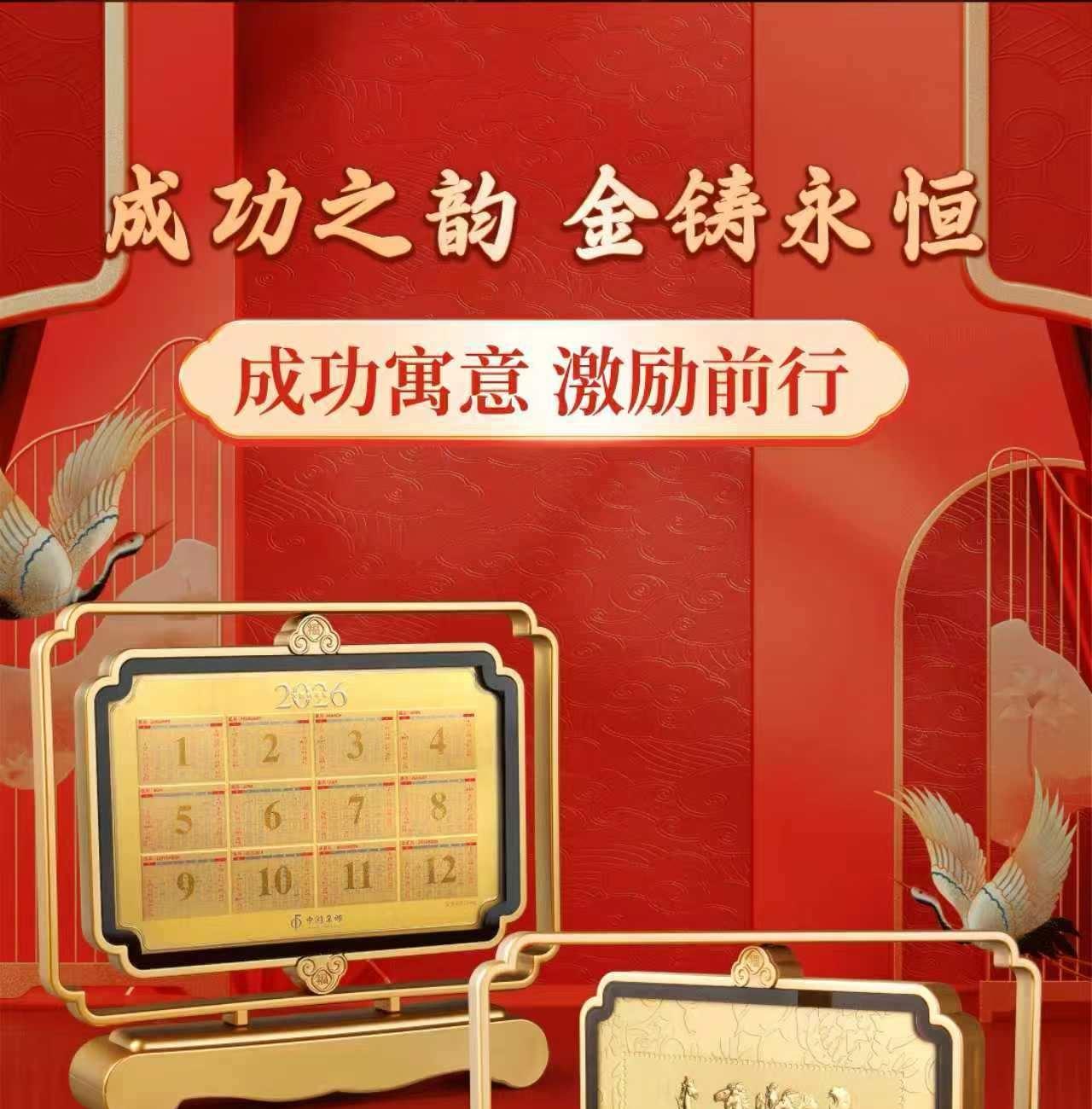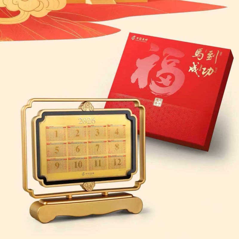 首創(chuàng)“珍郵+國(guó)畫(huà)+日歷”三合一設(shè)計(jì),將奔騰駿馬足金融入臺(tái)歷方寸之間,重現(xiàn)中國(guó)國(guó)畫(huà)珍郵的藝術(shù)光彩。金色邊框雕琢古典紋樣,底座沉穩(wěn)厚重,既是時(shí)間載體,更是值得收藏臻品。