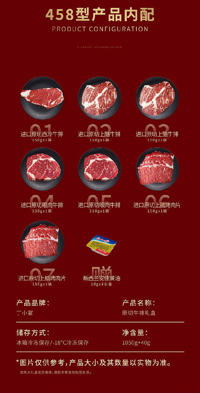 進(jìn)口原切上腦牛排150gx1袋 進(jìn)口原切上腦牛排150gx1袋 進(jìn)口原切眼肉牛排150gx1袋 進(jìn)口原切眼肉牛排150gx1袋 進(jìn)口原切西冷牛排150gx1袋 進(jìn)口原切上腦烤肉片150gx1袋 進(jìn)口原切上腦烤肉片150gx1袋 贈:新西蘭安佳黃油10gx4小盒 包裝(泡沫箱+禮盒)
