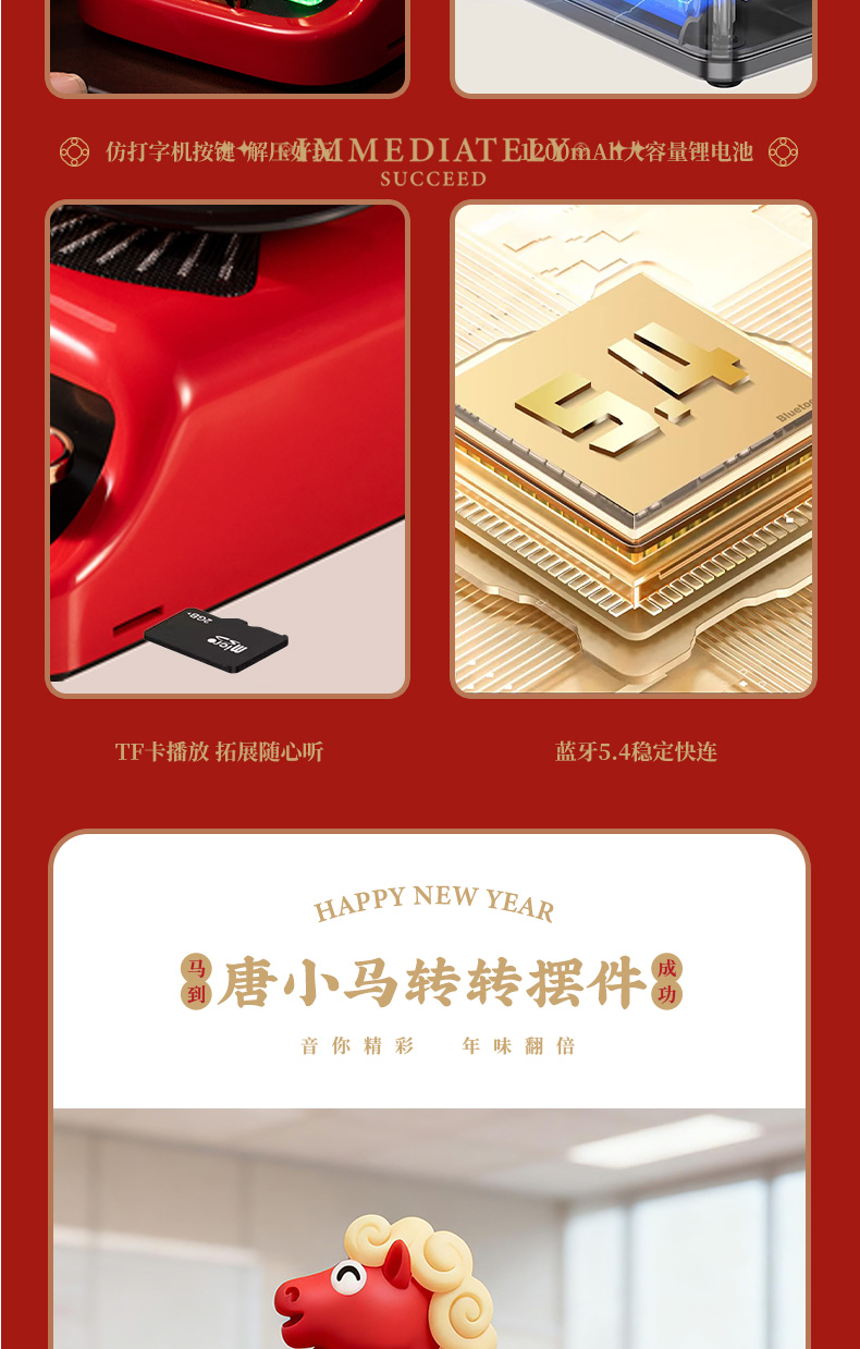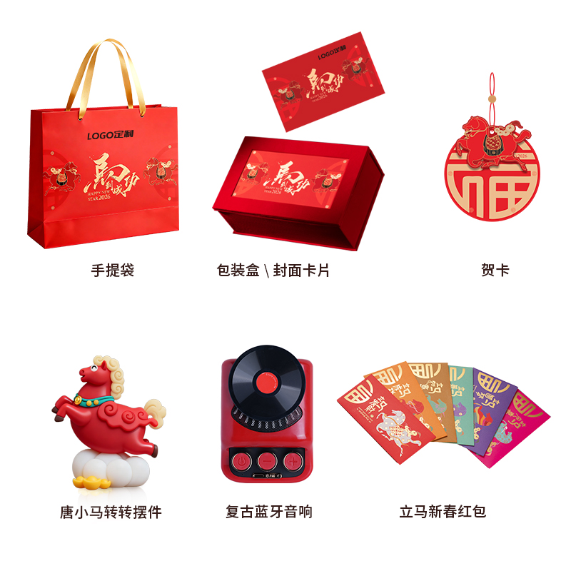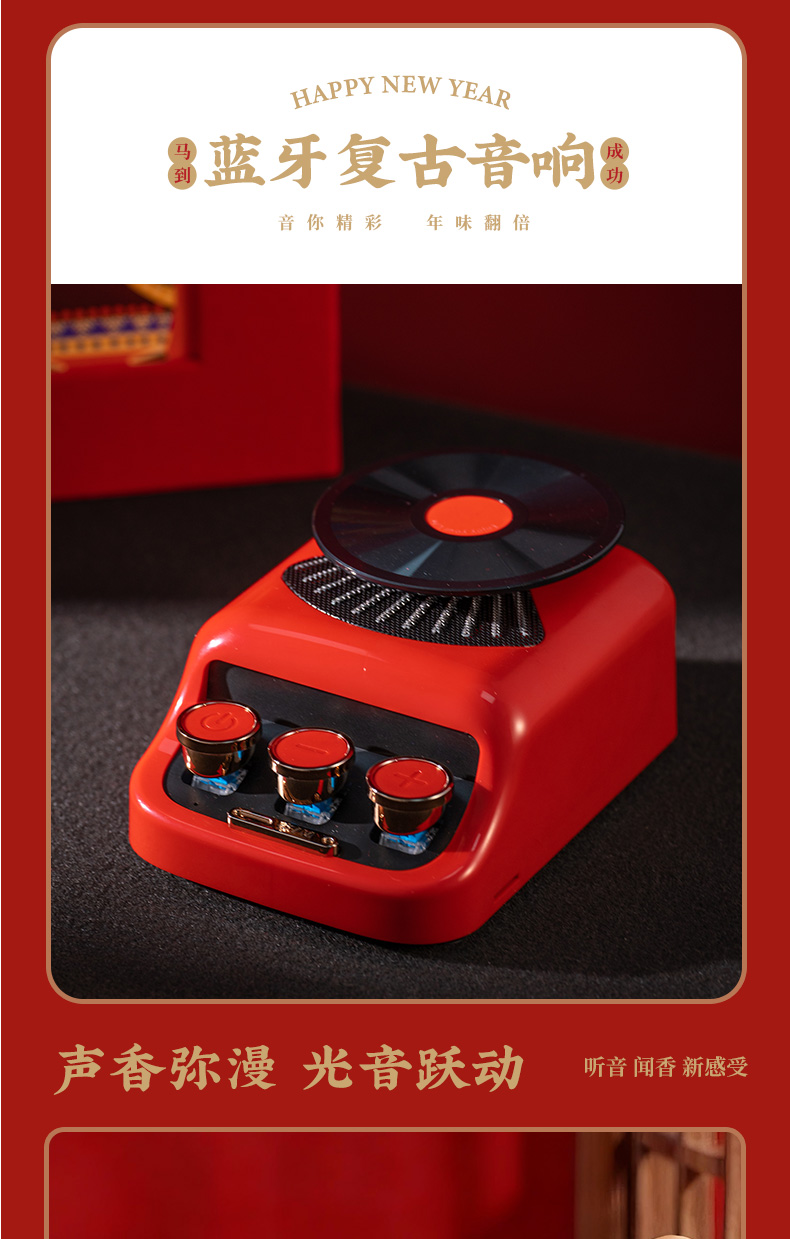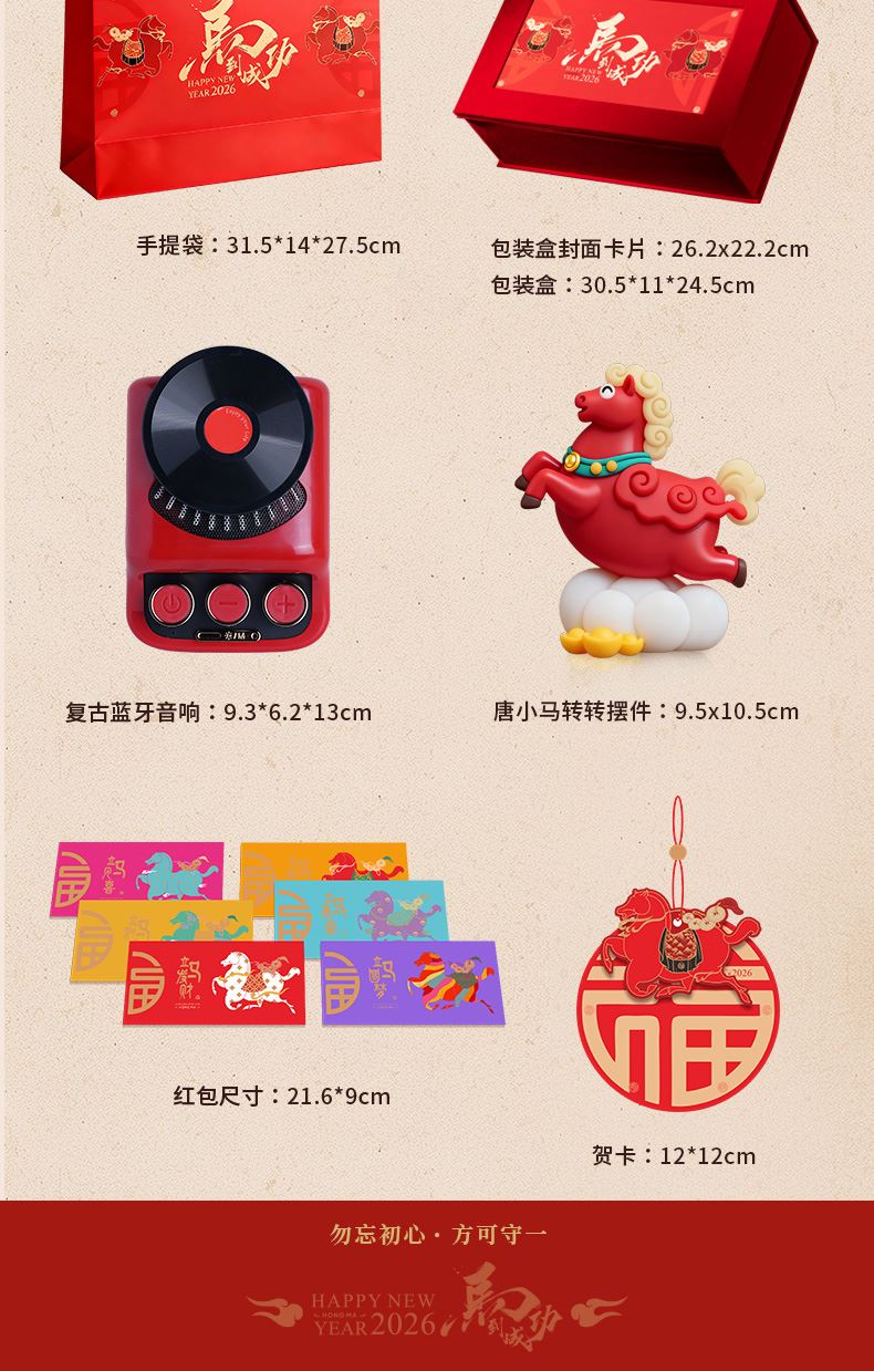 1、好運(yùn)復(fù)古藍(lán)牙音箱:藍(lán)牙、氛圍燈、趣味按鍵 2、馬到成功桌面擺件 3、新年紅包*6:開(kāi)啟新年好運(yùn)程 4、絨面禮盒:日歷功能、收納功能 用完不閑置, 注:禮盒可專版定制畫(huà)面