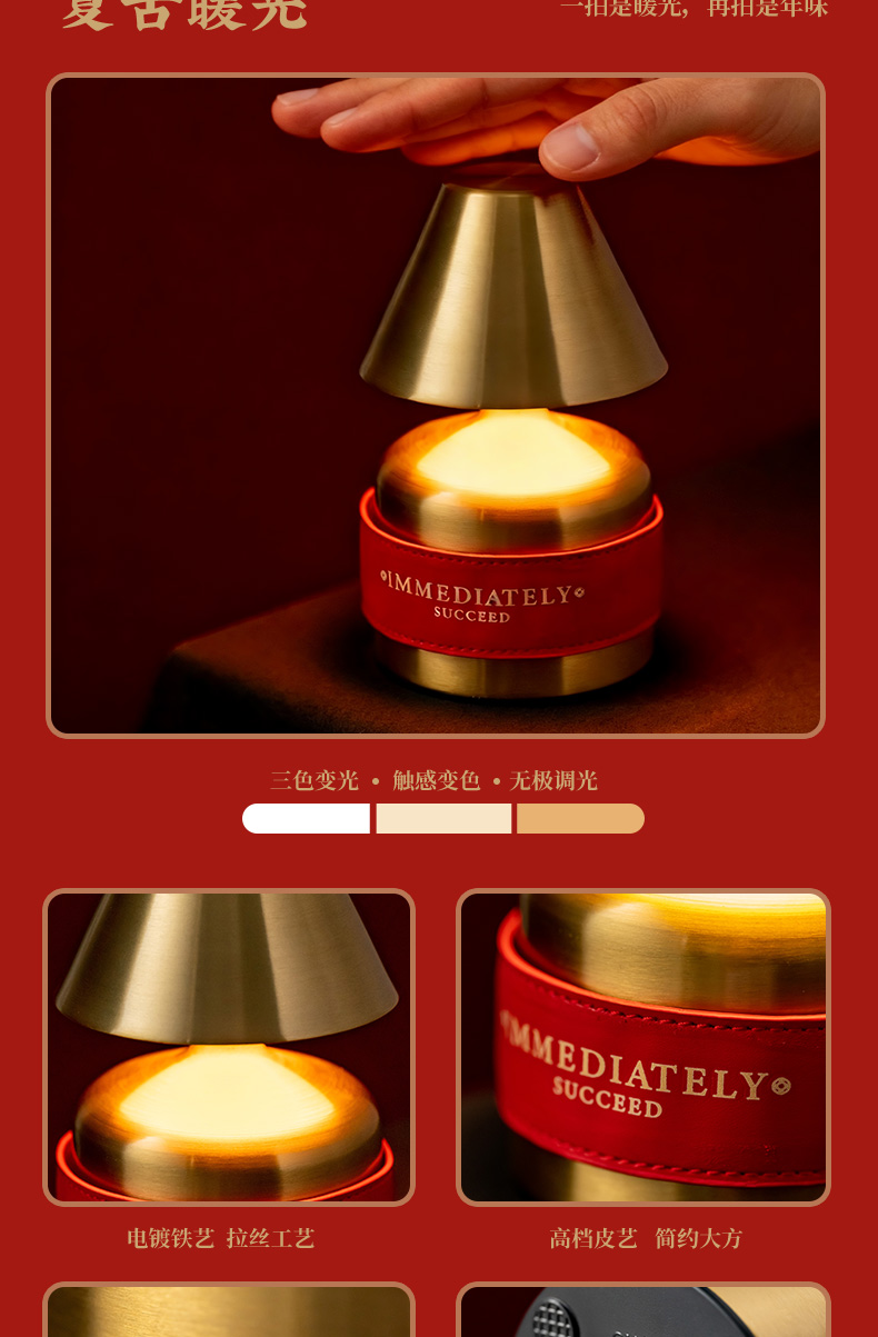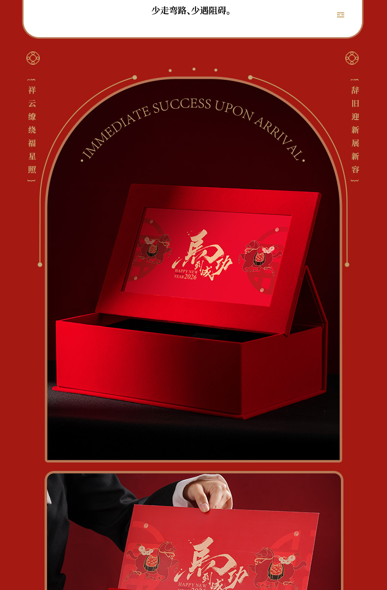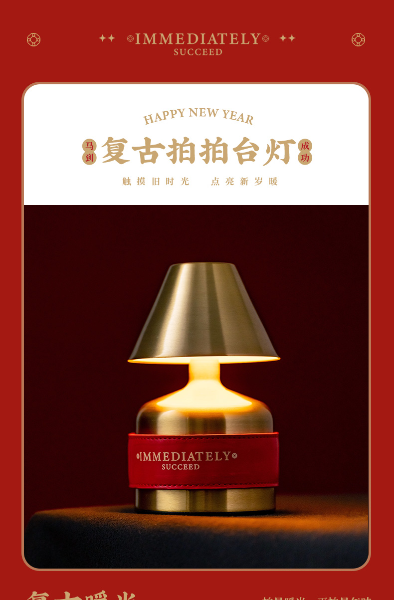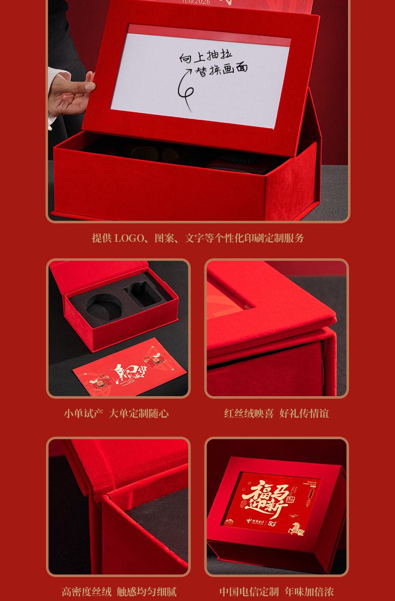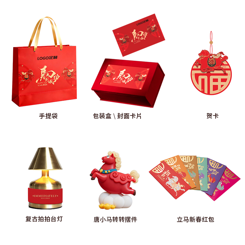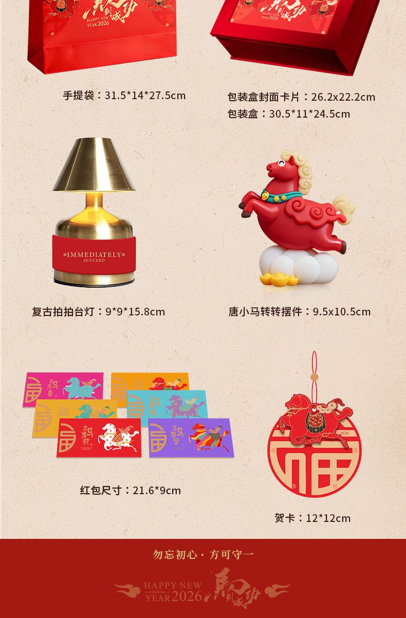 1、復(fù)古拍拍小臺(tái)燈:三色變光 觸感變色 無(wú)極調(diào)光 2、馬到成功桌面擺件 3、新年紅包*6:開(kāi)啟新年好運(yùn)程 4、馬到成功 六福常伴禮C 5、絨面禮盒:日歷功能、收納功能 用完不閑置 注:禮盒可專(zhuān)版定制畫(huà)面