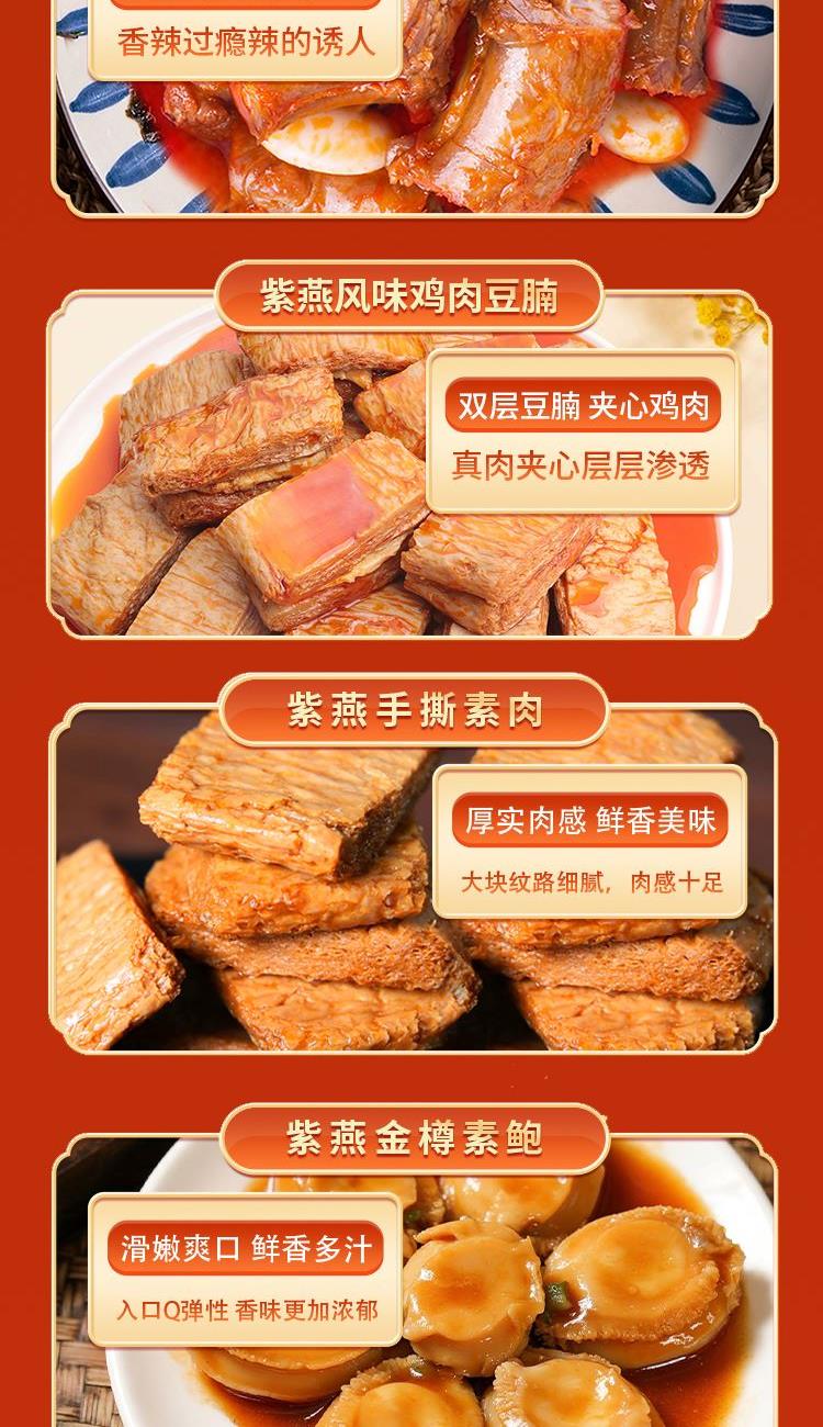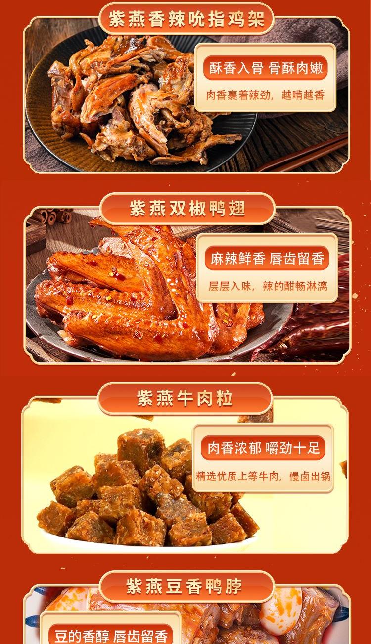 內(nèi)容物配置: 紫燕百味雞260g*1 紫燕香酥鴨400g*1 紫燕香辣吮指雞架300g*1 紫燕雙椒鴨翅82g*1 紫燕牛肉粒(五香味)60g*1 紫燕豆香鴨脖(香辣味)60g*1 紫燕風味雞肉豆腩(雞肉豆腩香辣味)60g*1 紫燕手撕素肉60g*1 紫燕金樽素鮑(紅油素鮑魚)60g*1 紫燕紅油竹耳絲60g*1 紫燕蜂蜜花生(椒鹽味)120g*1 至味佳年禮盒+組裝+外盒