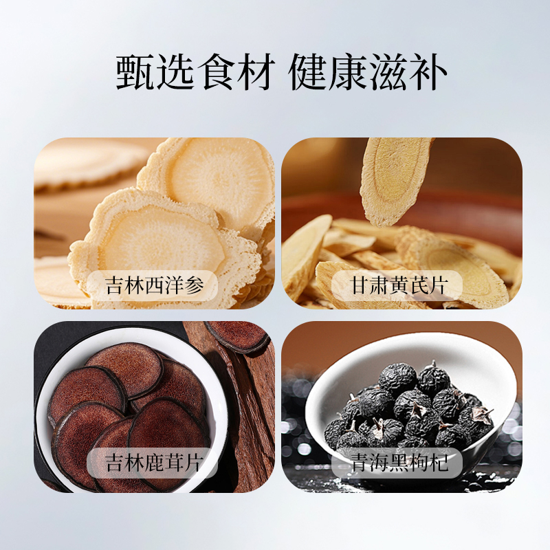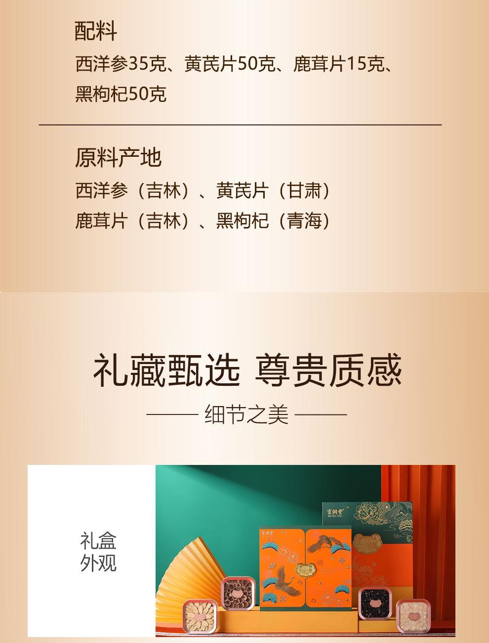 內配:西洋參35克、黃芪片50克、鹿茸片15克、黑枸杞50克 賣點: ? 珍貴食材 精挑細選 ? 傳統滋補 現代工藝 ? 高貴禮贈 彰顯品味 ? 四季養(yǎng)生 倍添活力 一份禮盒,四重滋養(yǎng),百分誠意??
